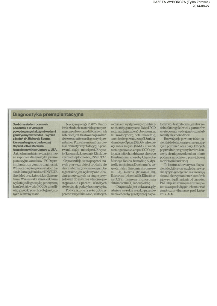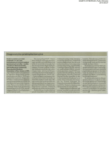 GAZETA WYBORCZA (Tylko Zdrowie) 2014-08-27 Diagnostyka preimp Sześć na siedem poronień pacjentek z in vitro jest powodowanych dużymi wadami genetycznymi zarodka - wynika z badań dr. Richarda Scotta, kierownika grupy badawczej Reproductive Medicine Associates w New Jersey w USA. Jego zdaniem takimsytuacjom mo że zapobiec diagnostyka preimplantacyjna zarodków - PGD (preimplantation genetic diagnosis). W Polsce o wykonywaniu takich ba dań informują kliniki sieci INVICTA i InviMed oraz katowickie Gyncentrum. Warszawska klinika nOvum wykonuje diagnostykę genetyczną komórekjajowych (PCGD),umożli wiającą wykrycie chorób genetycz nych ze strony matki. Na czym polega PGD?- Umoż liwia zbadanie materiału genetycz nego zarodków przed podaniem ich kobiecie ijest traktowana jako bar dzo wczesna forma diagnostyki pre natalnej. Pozwala uniknąć cierpie nia i dramatycznych decyzji o prze rwaniu ciąży- mówi prof. Krzysz tof Łukaszuk, kierownik Klinik Le czenia Niepłodności „INVICTA". - Często trafiają do nas pacjenci, któ rych pierwsze dzieci urodziły się chore lub zmarły w czasie ciąży. Dla tego ważne jest wykonywanie ba dań genetycznych na etapie przy gotowań do in vitro i właściwe po stępowanie z parami, u których stwierdza się podwyższone ryzyko. Podwyższone ryzyko dotyczy przede wszystkim osób, w których rodzinach występowały dziedzicz ne choroby genetyczne. DziękiPGD można zdiagnozować obecnie m.in. mukowiscydozę, beta-talasemię, anemię sierpowatą, zespółSmitha-Lemliego-Opitza (SLOS), rdzenio wy zanik mięśni (SMA), stward nienie guzowate, zespół COX'a (cytopatia mitochondrialna), chorobę Huntingtona, chorobę CharcotaMariego-Tootha, hemofilię A, dystrofię mięśniową Duchenne'a, ze społy: Patau (trisomia chromoso mu 13), Downa (trisomia 21), Edwardsa (trisomia18), Klinefeltera (XXY), Turnera (monosomia chromosomu X) i aneuploidię. - Diagnostyka jest wskazana,gdy istnieje wysokie ryzyko przenie sienia choroby genetycznej na po tomstwo. Jest zalecana, jeżeli w ro dzinie któregokolwiek z partnerów występowały wady genetyczne lub rodziły się chore dzieci. Rozważyć je powinny także pa cjentki doświadczające nawracają cych poronień oraz pary, których poprzednie programy in vitro koń czyły się niepowodzeniem minio podania zarodków o prawidłowej morfologii (budowie). To istotna alternatywa dla pa cjentów, którzy ze względu na wła sne ryzykogenetyczne zastanawiają się nad skorzystaniem z komórek jajowych bądź nasienia od dawców. PGD dajeim szansę na zdrowe po tomstwo posiadające ich materiał genetyczny - tłumaczy prof.Łuka szuk. O AF