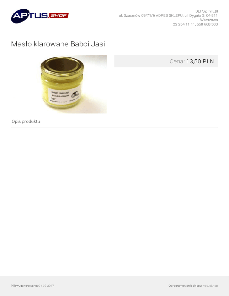 BEFSZTYK.pl ul. Szaserów 69/71/6 ADRES SKLEPU: ul. Dygata 3, 04-311 Warszawa 22 254 11 11, 668 668 500 Masło klarowane Babci Jasi Cena: 13,50 PLN Opis produktu Plik wygenerowano: 04-03-2017 Powered by TCPDF (www.tcpdf.org) Oprogramowanie sklepu: AptusShop
