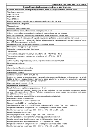 załącznik nr 1 do SIWZ z dn. 20.01.2017 r. Specyfikacja techniczna przedmiotu zamówienia Komora fitotronowa wielkogabarytowa typu „Walk in” dedykowana do hodowli roślin Wymiary wewnętrzne Szer.: 3250 mm Głęb.: 4600 mm Wys.: 2700 mm Komora wykonana z paneli z pianki poliuretanowej o grubości 100 mm Drzwi chłodnicze z wizjerem. Wyposażenie: Sterownik mikroprocesorowy Ekran dotykowy panelu sterowania o przekątnej min. 7 cali Cyfrowy wyświetlacz temperatury i wilgotności na ekranie panela sterującego Graficzny wyświetlacz temperatury i wilgotności na ekranie panela sterującego Prezentacja danych historycznych w postaci cyfrowej i graficznej na ekranie panelu sterowania Rejestrator temperatury i wilgotności. Rejestracja parametrów na zewnętrznej pamięci „pendrive” przez port USB. Pendrive zawarty w ofercie. Ustawienia panelu sterującego chronione 8 cyfrowym hasłem Menu panelu sterującego w jęz. polskim Fotoperiod – system symulacji dnia i nocy Temperatura Temperatura pracy przy włączonym oświetleniu od: +10⁰ C do + 40⁰ C Temperatura pracy przy wyłączonym oświetleniu od: +5⁰ C do + 40⁰ C Wilgotność: Zakres regulacji wilgotności: od poziomu wilgotności otoczenia do 90% RH Nawilżacz odśrodkowy Alarmy Alarm nieprawidłowej temperatury Alarm nieprawidłowej wilgotności Alarm zaniku zasilania Zasilanie: trójfazowe 380V, 25 A, 50 Hz System utrzymania temperatury oparty na urządzeniu grzewczo-chłodzącym umieszczonym na suficie każdej z komór i zapewniającym optymalny obieg powietrza w komorach. Urządzenie grzewczochłodzące wyposażone w co najmniej 3 wentylatory Maksymalny pobór energii: 10 kW Wyposażenie dodatkowe: Regały fitotronowe z plafonierą opuszczaną – 3 szt. 1 półka zamocowana na stałe + 1 półka (górna) typu plafoniera z płynną regulacją zawieszenia, jeżdżąca góra –dół w zakresie min. 70 cm. Plafoniera wyposażona w przeciwwagę, zapewniającą umieszczenie półki na dowolnej wysokości. Regał wyposażony w panele LED z funkcją regulacji natężenia światła. Plafoniera ruchoma: 2 panele LED Półka zamocowana na stałe: 2 panele LED Razem 4 panele LED na 1 regał z plafonierą Wymiary regałów: szer. robocza 1250 / szer. całkowita 1400 x głęb. 700 x wys. 1850 mm Natężenie światła min. 500 µmol m-2 s-1 w odległości 20 cm od źródła światła Rozkład barw panelu świetlnego: 85% - 650 nm, 10% - 460 nm, 5% - biała Regały fitotronowe duże – 3 szt. Wymiary regałów: szer. 1250 x głęb. 700 x wys. 1850 mm Regał wyposażony w panele LED z funkcją regulacji natężenia światła Regał wyposażony w 3 półki robocze oraz 3 półki z panelami świetlnymi. Regał wyposażony w 6 paneli świetlnych LED – 2 panele na 1 półkę Natężenie światła min. 500 µmol m-2 s-1 w odległości 20 cm od źródła światła Rozkład barw panelu świetlnego: 85% - 650 nm, 10% - 460 nm, 5% - biała Regał fitotronowy mały – 1 szt. Wymiary regału: szer. 800 x głęb. 700 x wys. 1850 mm Regał wyposażony w panele LED z funkcją regulacji natężenia światła Regał wyposażony w 3 półki robocze oraz 3 półki z panelami świetlnymi. Regał wyposażony w 3 panele świetlne LED – 1 panel na 1 półkę Natężenie światła min. 500 µmol m-2 s-1 w odległości 20 cm od źródła światła Rozkład barw panelu świetlnego: 85% - 650 nm, 10% - 460 nm, 5% - biała System monitoringu parametrów pracy oparty na sieci GSM System całkowicie niezależny od infrastruktury oraz systemów przesyłu danych użytkownika System umożliwia monitoring oraz rejestrację: temperatury i wilgotności w komorze fitotronowej, temperatury otoczenia oraz zaniku napięcia zasilania Elementy systemu: Terminal GSM z kartą sim Sensory: temperatury w fitotronie, temperatury otoczenia, wilgotności w fitotronie, zaniku napięcia zasilania Opis terminala GSM Terminal wyposażony w: -wyświetlacz ciekłokrystaliczny pokazujący stan zasięgu sieci GSM oraz kody błędów systemu -akumulatorowe podtrzymanie zasilania w przypadku braku zasilania głównego. Diody (lampki) informujące o -stanie alarmowym -stanie naładowania akumulatora wewnętrznego -stanie zasilania zewnętrznego -stanie połączenia z siecią GSM Funkcje terminala GSM: Programowanie częstotliwości pomiarów z sensorów Programowanie okresu czasu co jaki dokonywany jest transfer danych z terminala GSM Programowanie progów alarmowych dla temperatury w komorze fitotronowej, wilgotności w komorze fitotronowej, oraz temperatury otoczenia. Funkcja wysyłania wiadomości sms z informacją o alarmie temperatury w komorze fitotronowej, wilgotności w komorze fitotronowej , temperatury otoczenia oraz braku napięcia zasilania. Programowanie nr telefonów alarmowych Sposób odczytu danych ze standardowego komputera PC: Login oraz hasło na dedykowanej stronie internetowej Odczyt danych w postaci cyfrowej. Odczyt danych ( temperatury w komorze fitotronowej, wilgotności, temperatury otoczenia, zaniku napięcia zasilania) w postaci wykresów w jednym układzie współrzędnych Możliwość eksportu danych do Excel’a Odczyt danych w postaci cyfrowej i graficznej (wykresy) bez konieczności instalacji dodatkowego oprogramowania Podać adres strony internetowej dedykowanej do logowania do systemu monitoringu Podać login i hasło do demonstracyjnego (przykładowego) konta użytkownika umożliwiającego weryfikację podanych parametrów. Konto powinno zawierać przykładowe wartości parametrów: temperatury w komorze fitotronowej, wilgotności w komorze fitotronowej, temperatury otoczenia oraz zaniku napięcia zasilania wraz z wykresami w jednym układzie współrzędnych. Konto powinno być w pełni funkcjonalne , umożliwiające operacje na danych np. tworzenie oraz modyfikacja wykresów , eksport danych do Excela, itp. UWAGA: wszystkie koszty (abonament/licencja, karta sim) opłacone na min. 2 lata