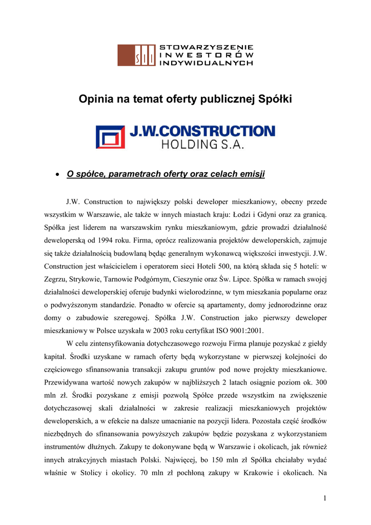 Opinia na temat oferty publicznej Spółki • O spółce, parametrach oferty oraz celach emisji J.W. Construction to największy polski deweloper mieszkaniowy, obecny przede wszystkim w Warszawie, ale także w innych miastach kraju: Łodzi i Gdyni oraz za granicą. Spółka jest liderem na warszawskim rynku mieszkaniowym, gdzie prowadzi działalność deweloperską od 1994 roku. Firma, oprócz realizowania projektów deweloperskich, zajmuje się także działalnością budowlaną będąc generalnym wykonawcą większości inwestycji. J.W. Construction jest właścicielem i operatorem sieci Hoteli 500, na którą składa się 5 hoteli: w Zegrzu, Strykowie, Tarnowie Podgórnym, Cieszynie oraz Św. Lipce. Spółka w ramach swojej działalności deweloperskiej oferuje budynki wielorodzinne, w tym mieszkania popularne oraz o podwyższonym standardzie. Ponadto w ofercie są apartamenty, domy jednorodzinne oraz domy o zabudowie szeregowej. Spółka J.W. Construction jako pierwszy deweloper mieszkaniowy w Polsce uzyskała w 2003 roku certyfikat ISO 9001:2001. W celu zintensyfikowania dotychczasowego rozwoju Firma planuje pozyskać z giełdy kapitał. Środki uzyskane w ramach oferty będą wykorzystane w pierwszej kolejności do częściowego sfinansowania transakcji zakupu gruntów pod nowe projekty mieszkaniowe. Przewidywana wartość nowych zakupów w najbliższych 2 latach osiągnie poziom ok. 300 mln zł. Środki pozyskane z emisji pozwolą Spółce przede wszystkim na zwiększenie dotychczasowej skali działalności w zakresie realizacji mieszkaniowych projektów deweloperskich, a w efekcie na dalsze umacnianie na pozycji lidera. Pozostała część środków niezbędnych do sfinansowania powyższych zakupów będzie pozyskana z wykorzystaniem instrumentów dłużnych. Zakupy te dokonywane będą w Warszawie i okolicach, jak również innych atrakcyjnych miastach Polski. Najwięcej, bo 150 mln zł Spółka chciałaby wydać właśnie w Stolicy i okolicy. 70 mln zł pochłoną zakupy w Krakowie i okolicach. Na 1 wybrzeżu Bałtyku Spółka zainwestuje około 50 mln zł, a we Wrocławiu i okolicach 30 mln zł. Oferta Publiczna Akcji J.W. Construction składa się z niemal 3,45 mln szt. walorów emitowanych oraz 7,5 mln akcji należących do dotychczasowych akcjonariuszy. Widełki ceny emisyjnej zostały ustalone w przedziale 58-71 zł. Do 21 maja trwały zapisy w ramach transzy kierowanej. Zapisy w ramach transzy inwestorów indywidualnych przyjmowane będą w okresie od 22 do 24 maja 2007 r. Z kolei zapisy w transzy inwestorów kwalifikowanych przyjmowane będą od 25 do 29 maja. Cena emisyjna oraz liczba akcji oferowanych w ramach transzy inwestorów instytucjonalnych ustalona zostanie najpóźniej do 25 maja 2007, a najpóźniej do 22 maja podana zostanie liczba akcji oferowanych w ramach transzy inwestorów indywidualnych. Przydział akcji nastąpi 30 maja. Zapisy przyjmowane będą w punktach obsługi klienta CDM Pekao. • Finanse, parametry wskaźników rynkowych Wyniki finansowe Spółki za lata 2004-2006 pokazują, że wzrost cen mieszkań w wyraźny sposób przekłada się na wzrost zyskowności, a tym samym rentowności netto. W 2004 roku Firma osiągnęła 413,9 mln zł przychodów ze sprzedaży, zysk operacyjny na poziomie 17,1 mln zł oraz zysk netto rzędu 4,3 mln zł. Dawało to rentowność netto na poziomie nieznacznie przekraczającym 1%. Tymczasem już w roku 2006 J.W. Construction wypracował 726,3 mln zł przychodów, zysk operacyjny na poziomie 180,1 mln zł oraz zysk netto przekraczający 132 mln zł. Oznacza to, że wyraźny wzrost cen mieszkań, a także stosunkowo tanio zakupione grunty przyczyniły się do wzrostu rentowności netto do poziomu 18,1%. Nie przeszkodziła w tym nawet zwyżka cen materiałów budowlanych, czy też wzrost kosztów robót budowlanych. Warto również wspomnieć, że konkurent rynkowy, spółka Dom Development osiągnęła w 2006 roku bardzo zbliżone wyniki. Przychody konkurenta wyniosły w ubiegłym roku 729,8 mln zł, zysk operacyjny osiągnął wartość 164,9 mln zł, a zysk netto zamknął się kwotą 135,2 mln zł. Można więc uznać, że ubiegłoroczne wyniki obu Firm były bliźniaczo podobne. Analizując atrakcyjność ceny emisyjnej akcji J.W. Construction można odnieść wrażenie, że maksymalna cena emisyjna akcje tej Spółki została ustalona na bazie bieżącej wyceny bezpośredniego konkurenta rynkowego firmy Dom Development. Po uwzględnieniu wyników J.W. Construction za rok 2006 oraz po uwzględnieniu środków z emisji akcji przeprowadzonej po maksymalnej cenie 71 zł, można oszacować, że Spółka sprzeda się przy 2 wskaźniku C/Z równym 29,4. Wskaźnik C/WK osiągnie wartość 9,1, a wskaźnik EV/EBIT 21,8. Tymczasem bardzo podobne wskaźniki ma obecnie Dom Development. W przypadku tej Firmy wskaźnik C/Z kształtuje się po ubiegłorocznych wynikach na poziomie 29,1, wskaźnik C/WK na poziomie 8, a wskaźnik EV/EBIT ma wartość 23,3. Atrakcyjniej pod względem wyceny prezentują się Firmy deweloperskie typu GTC, czy też Echo. • Podsumowanie Obecnie na ryku wciąż panuje moda na spółki budowlane oraz deweloperskie. W tym przypadku już sama branża oraz pozycja rynkowa J.W. Construction, to główne atuty dzięki którym emisja sprzeda się bez większych problemów, a w dodatku z bardzo wysoką redukcją. J.W. Construction osiągnął w ubiegłym roku bardzo dobre rezultaty – zarobił na czysto 132 mln zł przy przychodach na poziomie 726 mln zł. Warto zaznaczyć, że ubiegłoroczne wyniki Dom Development zamknęły się zarówno zbliżonym poziomem przychodów, jak i zysku operacyjnego oraz netto. Dom Development wyceniany jest obecnie przez rynek na około 3,94 ml zł, a przy maksymalnej cenie emisyjnej J.W. Construction wyceniony zostanie na 3,88 mld zł. To jednak nie koniec podobieństw. Obie Firmy będą notowane z bardzo zbliżonymi wskaźnikami rynkowymi. Wskaźniki C/Z i EV/EBIT przyjmu