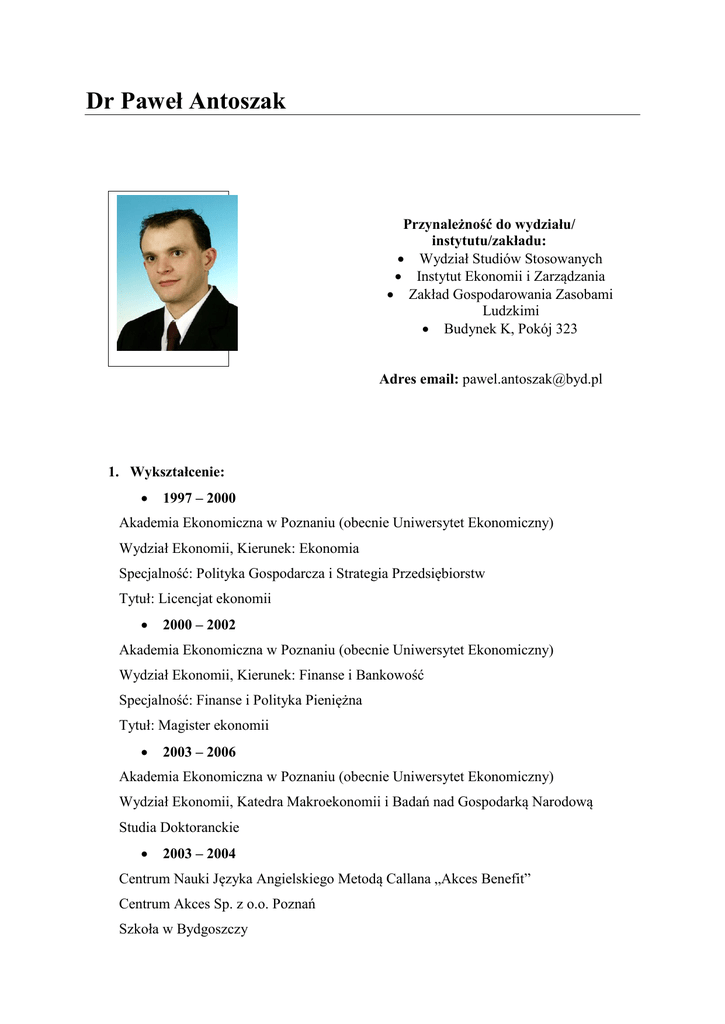 Dr Paweł Antoszak Przynależność do wydziału/ instytutu/zakładu: Wydział Studiów Stosowanych Instytut Ekonomii i Zarządzania Zakład Gospodarowania Zasobami Ludzkimi Budynek K, Pokój 323 Adres email: [email protected] 1. Wykształcenie: 1997 – 2000 Akademia Ekonomiczna w Poznaniu (obecnie Uniwersytet Ekonomiczny) Wydział Ekonomii, Kierunek: Ekonomia Specjalność: Polityka Gospodarcza i Strategia Przedsiębiorstw Tytuł: Licencjat ekonomii 2000 – 2002 Akademia Ekonomiczna w Poznaniu (obecnie Uniwersytet Ekonomiczny) Wydział Ekonomii, Kierunek: Finanse i Bankowość Specjalność: Finanse i Polityka Pieniężna Tytuł: Magister ekonomii 2003 – 2006 Akademia Ekonomiczna w Poznaniu (obecnie Uniwersytet Ekonomiczny) Wydział Ekonomii, Katedra Makroekonomii i Badań nad Gospodarką Narodową Studia Doktoranckie 2003 – 2004 Centrum Nauki Języka Angielskiego Metodą Callana „Akces Benefit” Centrum Akces Sp. z o.o. Poznań Szkoła w Bydgoszczy 2004 – 2006 Akademia Ekonomiczna w Poznaniu (obecnie Uniwersytet Ekonomiczny) Wydział Ekonomii, Katedra Edukacji i Rozwoju Kadr Podyplomowe Studium Pedagogiczne 2012 Wyższa Szkoła Gospodarki w Bydgoszczy Ośrodek Nowych Technologii Edukacyjnych Kurs Zdalnego Nauczania na Platformie ONTE 2. Stopnie i tytuły naukowe: 2010 – Doktor nauk ekonomicznych, Dyscyplina: Ekonomia, Uniwersytet Ekonomiczny w Poznaniu, Wydział Ekonomii, Tytuł rozprawy doktorskiej: „Regionalne różnice płac w Polsce i ich społecznoekonomiczne determinanty /w latach 1994-2004/”. 3. Zainteresowania naukowe: Dyscyplina naukowa: Ekonomia, Specjalności: Polityka płac i wynagradzanie, motywowanie, gospodarowanie pracą w przedsiębiorstwie, gospodarowanie kapitałem ludzkim, zarządzanie zasobami ludzkimi, regionalna polityka gospodarcza, finanse samorządowe oraz bankowość i polityka pieniężna. 4. Przynależność do organizacji i towarzystw naukowych: Członek Polskiego Towarzystwa Ekonomicznego, Zarejestrowany w Bazie Kandydatów na Członków Rad Nadzorczych prowadzonej przez Ministerstwo Skarbu Państwa (Data rejestracji 21.12.2010 rok). 5. Pełnione funkcje: Od 2011 roku – Pełnomocnik Zakładu Ekonomii do spraw Krajowych Ram Kwalifikacji. 6. Tematyka naukowo-badawcza: Główne obszary badań naukowych: Regionalne zróżnicowanie płac w Polsce i ich społeczno-ekonomiczne determinanty. Pozostałe obszary zainteresowań: Finanse samorządowe, bankowość i polityka pieniężna, strategie rozwoju przedsiębiorstw. Główne obszary geograficznych badań: Polska, regiony Polski, kraje i regiony Unii Europejskiej przede wszystkim państwa i regiony Europy Środkowo-Wschodniej oraz kraje i regiony rozwijające się z Europy Zachodniej. 7. Dorobek naukowy: A. Artykuły: 1. Antoszak P., Regionalne różnice płac w Polsce, Zeszyty Studiów Doktoranckich, Zeszyt nr 24, Wydawnictwo Akademii Ekonomicznej w Poznaniu, Poznań 2006, ss. 5–28. 2. Antoszak P., Salaries Diversification in Poland, Zeszyty Studiów Doktoranckich, Zeszyt nr 32, Wydawnictwo Akademii Ekonomicznej w Poznaniu, Poznań 2007, ss. 5–29. 3. Antoszak P., Pojęcie i funkcje płac we współczesnej gospodarce rynkowej, Zeszyty Naukowe WSG, Seria Ekonomia, Zeszyt nr 4, Wydawnictwo Wyższej Szkoły Gospodarki w Bydgoszczy, Bydgoszcz 2012. 4. Antoszak P., Regionalna polityka gospodarcza, Roczniki Ekonomiczne 5/2012, Wydawnictwo Kujawsko-Pomorskiej Szkoły Wyższej w Bydgoszczy, Bydgoszcz 2012. 5. Antoszak P., Zatrudnianie i wynagradzanie w transporcie i logistyce, „Logistyka” nr 6/2012, Instytut Logistyki i Magazynowania w Poznaniu, Poznań 2012. 6. Antoszak P., Regionalna polityka płac, Wydawnictwo Kujawsko-Pomorskiej Szkoły Wyższej w Bydgoszczy, Bydgoszcz 2012 - w przygotowaniu. 7. Antoszak P., Determinanty zróżnicowania płac w Polsce, „Transformacje”, Akademia Leona Koźmińskiego w Warszawie, Warszawa 2013 – w przygotowaniu. B. Konferencje zagraniczne: 1. „Jeden świat – wiele kultur”. Człowiek i jego otoczenie w aspekcie kulturowym, prawnym, ekonomicznym i społecznym, Kujawsko-Pomorska Szkoła Wyższa w Bydgoszczy, Wygłoszony referat: „Regionalna polityka płac” – Bydgoszcz 25-26 październik 2012 rok. C. Konferencje krajowe: 1. „Transport, logistyka, ekologia”, Wyższa Szkoła Gospodarki w Bydgoszczy, Wygłoszony referat: „Zatrudnianie i wynagradzanie w transporcie i logistyce” –Bydgoszcz 18 październik 2012 rok. 8. Przebieg pracy zawodowej: 1995 – 2011 Poczta Polska S.A., Oddział Regionalny w Bydgoszczy, Dział Rachunkowości Zarządczej, Stanowisko: Instruktor ds. rachunkowości zarządczej. 2005 – 2006 Olympus Szkoła Wyższa w Warszawie, Wydział Ekonomiczny, Wydział Zamiejscowy w Bydgoszczy, Stanowisko: Wykładowca. Od 2011 Wyższa Szkoła Gospodarki w Bydgoszczy, Wydział Studiów Stosowanych, Instytut Ekonomii i Zarządzania, Zakład Ekonomii, Stanowisko: Adiunkt. Od 2012 Kujawsko-Pomorska Szkoła Wyższa w Bydgoszczy, Wydział Ekonomiczno-Społeczny, Zakład Ekonomii i Badań nad Gospodarką, Stanowisko: Adiunkt. 9. Zajęcia dydaktyczne: Ekonomia – wykład, ćwiczenia, Finanse publiczne – wykład, Zarządzanie finansami publicznymi – wykład, Polityka społeczna – wykład, Rynek pracy – wykład, Rynek pracy w kulturze – wykład, Zarządzanie zasobami ludzkimi – wykład, ćwiczenia, Gospodarowanie kapitałem ludzkim – wykład, projekty, Analiza zasobów ludzkich w przedsiębiorstwie – wykład, Polityka rynku pracy i zatrudnienia – wykład, Podstawy kierowania zespołami pracowniczymi – wykład, ćwiczenia, Ekonomika i organizacja pracy w przedsiębiorstwie – wykład, ćwiczenia, Nauka o przedsiębiorstwie – wykład, Rekrutacja i dobór pracowników – wykład, ćwiczenia, Motywowanie i rozwój pracowników – wykład, ćwiczenia.