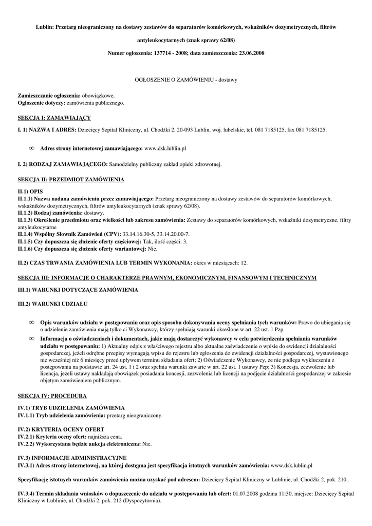 Lublin: Przetarg nieograniczony na dostawy zestawów do separatorów komórkowych, wskaźników dozymetrycznych, filtrów antyleukocytarnych (znak sprawy 62/08) Numer ogłoszenia: 137714 2008; data zamieszczenia: 23.06.2008 OGŁOSZENIE O ZAMÓWIENIU dostawy Zamieszczanie ogłoszenia: obowiązkowe. Ogłoszenie dotyczy: zamówienia publicznego. SEKCJA I: ZAMAWIAJĄCY I. 1) NAZWA I ADRES: Dziecięcy Szpital Kliniczny, ul. Chodźki 2, 20093 Lublin, woj. lubelskie, tel. 081 7185125, fax 081 7185125. • Adres strony internetowej zamawiającego: www.dsk.lublin.pl I. 2) RODZAJ ZAMAWIAJĄCEGO: Samodzielny publiczny zakład opieki zdrowotnej. SEKCJA II: PRZEDMIOT ZAMÓWIENIA II.1) OPIS II.1.1) Nazwa nadana zamówieniu przez zamawiającego: Przetarg nieograniczony na dostawy zestawów do separatorów komórkowych, wskaźników dozymetrycznych, filtrów antyleukocytarnych (znak sprawy 62/08). II.1.2) Rodzaj zamówienia: dostawy. II.1.3) Określenie przedmiotu oraz wielkości lub zakresu zamówienia: Zestawy do separatorów komórkowych, wskaźniki dozymetryczne, filtry antyleukocytarne II.1.4) Wspólny Słownik Zamówień (CPV): 33.14.16.305, 33.14.20.007. II.1.5) Czy dopuszcza się złożenie oferty częściowej: Tak, ilość części: 3. II.1.6) Czy dopuszcza się złożenie oferty wariantowej: Nie. II.2) CZAS TRWANIA ZAMÓWIENIA LUB TERMIN WYKONANIA: okres w miesiącach: 12. SEKCJA III: INFORMACJE O CHARAKTERZE PRAWNYM, EKONOMICZNYM, FINANSOWYM I TECHNICZNYM III.1) WARUNKI DOTYCZĄCE ZAMÓWIENIA III.2) WARUNKI UDZIAŁU • Opis warunków udziału w postępowaniu oraz opis sposobu dokonywania oceny spełniania tych warunków: Prawo do ubiegania się o udzielenie zamówienia mają tylko ci Wykonawcy, którzy spełniają warunki określone w art. 22 ust. 1 Pzp. • Informacja o oświadczeniach i dokumentach, jakie mają dostarczyć wykonawcy w celu potwierdzenia spełniania warunków udziału w postępowaniu: 1) Aktualny odpis z właściwego rejestru albo aktualne zaświadczenie o wpisie do ewidencji działalności gospodarczej, jeżeli odrębne przepisy wymagają wpisu do rejestru lub zgłoszenia do ewidencji działalności gospodarczej, wystawionego nie wcześniej niż 6 miesięcy przed upływem terminu składania ofert; 2) Oświadczenie Wykonawcy, że nie podlega wykluczeniu z postępowania na podstawie art. 24 ust. 1 i 2 oraz spełnia warunki zawarte w art. 22 ust. 1 ustawy Pzp; 3) Koncesja, zezwolenie lub licencja, jeżeli ustawy nakładają obowiązek posiadania koncesji, zezwolenia lub licencji na podjęcie działalności gospodarczej w zakresie objętym zamówieniem publicznym. SEKCJA IV: PROCEDURA IV.1) TRYB UDZIELENIA ZAMÓWIENIA IV.1.1) Tryb udzielenia zamówienia: przetarg nieograniczony. IV.2) KRYTERIA OCENY OFERT IV.2.1) Kryteria oceny ofert: najniższa cena. IV.2.2) Wykorzystana będzie aukcja elektroniczna: Nie. IV.3) INFORMACJE ADMINISTRACYJNE IV.3.1) Adres strony internetowej, na której dostępna jest specyfikacja istotnych warunków zamówienia: www.dsk.lublin.pl Specyfikację istotnych warunków zamówienia można uzyskać pod adresem: Dziecięcy Szpital Kliniczny w Lublinie, ul. Chodźki 2, pok. 210.. IV.3.4) Termin składania wniosków o dopuszczenie do udziału w postępowaniu lub ofert: 01.07.2008 godzina 11:30, miejsce: Dziecięcy Szpital Kliniczny w Lublinie, ul. Chodźki 2, pok. 212 (Dyspozytornia).. IV.3.5) Termin związania ofertą: okres w dniach: 30 (od ostatecznego terminu składania ofert). ZAŁĄCZNIK I INFORMACJE DOTYCZĄCE OFERT CZĘŚCIOWYCH CZĘŚĆ Nr: 1 NAZWA: Zestawy do separatorów komórkowych Spectra i Trimma. • • • • Krótki opis ze wskazaniem wielkości lub zakresu zamówienia: Zestawy do separatorów komórkowych Spectra i Trimma. Wspólny Słownik Zamówień (CPV): 33.14.20.007. Czas trwania lub termin wykonania: Okres w miesiącach: 12. Kryteria oceny ofert: najniższa cena. CZĘŚĆ Nr: 2 NAZWA: Filtry antyleukocytarne do krwi. • • • • Krótki opis ze wskazaniem wielkości lub zakresu zamówienia: Filtry antyleukocytarne do krwi. Wspólny Słownik Zamówień (CPV): 33.14.16.305. Czas trwania lub termin wykonania: Okres w miesiącach: 12. Kryteria oceny ofert: najniższa cena. CZĘŚĆ Nr: 3 NAZWA: Wskaźniki dozymetryczne wskaźniki napromieniowania krwi. • Krótki opis ze wskazaniem wielkości lub zakresu zamówienia: Wskaźniki dozymetryczne wskaźniki napromieniowania krwi. • Wspólny Słownik Zamówień (CPV): 33.14.20.007. • Czas trwania lub termin wykonania: Okres w miesiącach: 30. • Kryteria oceny ofert: najniższa cena.