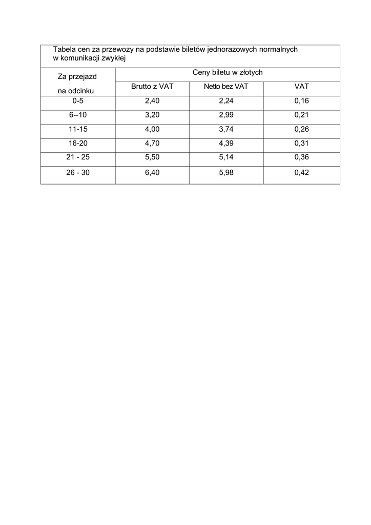 Tabela cen za przewozy na podstawie biletów jednorazowych normalnych