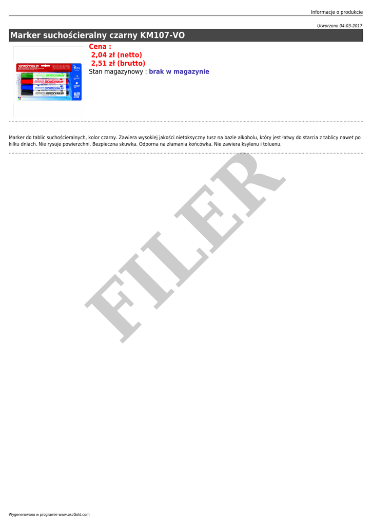Informacje o produkcie Utworzono 04-03-2017 Marker suchościeralny czarny KM107-VO Cena : 2,04 zł (netto) 2,51 zł (brutto) Stan magazynowy : brak w magazynie FI LE R Marker do tablic suchościeralnych, kolor czarny. Zawiera wysokiej jakości nietoksyczny tusz na bazie alkoholu, który jest łatwy do starcia z tablicy nawet po kilku dniach. Nie rysuje powierzchni. Bezpieczna skuwka. Odporna na złamania końcówka. Nie zawiera ksylenu i toluenu. Wygenerowano w programie www.oscGold.com