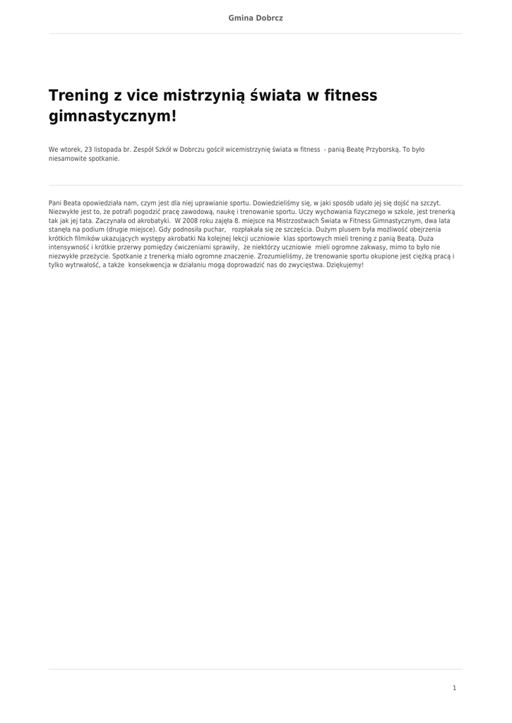 Gmina Dobrcz Trening z vice mistrzynią świata w fitness gimnastycznym! We wtorek, 23 listopada br. Zespół Szkół w Dobrczu gościł wicemistrzynię świata w fitness - panią Beatę Przyborską. To było niesamowite spotkanie. Pani Beata opowiedziała nam, czym jest dla niej uprawianie sportu. Dowiedzieliśmy się, w jaki sposób udało jej się dojść na szczyt. Niezwykłe jest to, że potrafi pogodzić pracę zawodową, naukę i trenowanie sportu. Uczy wychowania fizycznego w szkole, jest trenerką tak jak jej tata. Zaczynała od akrobatyki. W 2008 roku zajęła 8. miejsce na Mistrzostwach Świata w Fitness Gimnastycznym, dwa lata stanęła na podium (drugie miejsce). Gdy podnosiła puchar, rozpłakała się ze szczęścia. Dużym plusem była możliwość obejrzenia krótkich filmików ukazujących występy akrobatki Na kolejnej lekcji uczniowie klas sportowych mieli trening z panią Beatą. Duża intensywność i krótkie przerwy pomiędzy ćwiczeniami sprawiły, że niektórzy uczniowie mieli ogromne zakwasy, mimo to było nie niezwykłe przeżycie. Spotkanie z trenerką miało ogromne znaczenie. Zrozumieliśmy, że trenowanie sportu okupione jest ciężką pracą i tylko wytrwałość, a także konsekwencja w działaniu mogą doprowadzić nas do zwycięstwa. Dziękujemy! 1