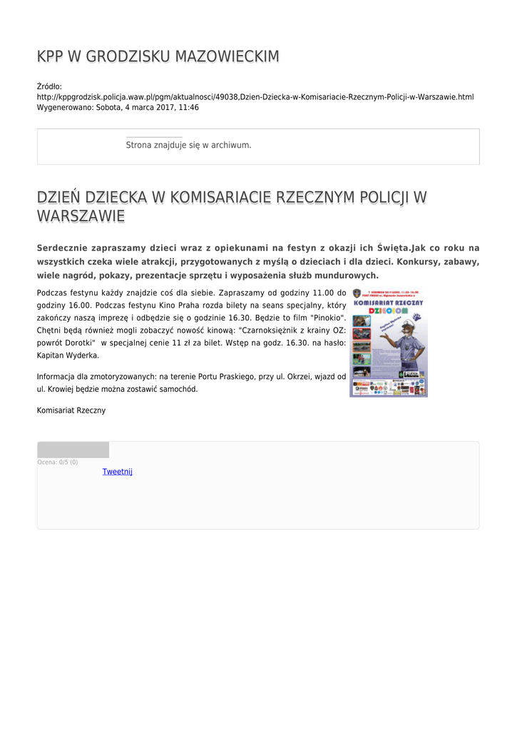 KPP W GRODZISKU MAZOWIECKIM Źródło: http://kppgrodzisk.policja.waw.pl/pgm/aktualnosci/49038,Dzien-Dziecka-w-Komisariacie-Rzecznym-Policji-w-Warszawie.html Wygenerowano: Sobota, 4 marca 2017, 11:46 Strona znajduje się w archiwum. DZIEŃ DZIECKA W KOMISARIACIE RZECZNYM POLICJI W WARSZAWIE Serdecznie zapraszamy dzieci wraz z opiekunami na festyn z okazji ich Święta.Jak co roku na wszystkich czeka wiele atrakcji, przygotowanych z myślą o dzieciach i dla dzieci. Konkursy, zabawy, wiele nagród, pokazy, prezentacje sprzętu i wyposażenia służb mundurowych. Podczas festynu każdy znajdzie coś dla siebie. Zapraszamy od godziny 11.00 do godziny 16.00. Podczas festynu Kino Praha rozda bilety na seans specjalny, który zakończy naszą imprezę i odbędzie się o godzinie 16.30. Będzie to film "Pinokio". Chętni będą również mogli zobaczyć nowość kinową: "Czarnoksiężnik z krainy OZ: powrót Dorotki" w specjalnej cenie 11 zł za bilet. Wstęp na godz. 16.30. na hasło: Kapitan Wyderka. Informacja dla zmotoryzowanych: na terenie Portu Praskiego, przy ul. Okrzei, wjazd od ul. Krowiej będzie można zostawić samochód. Komisariat Rzeczny Ocena: 0/5 (0) Tweetnij