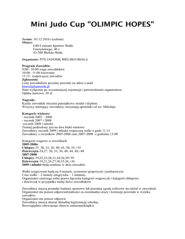 Mini Judo Cup "OLIMPIC HOPES" Termin : 03.12.2016 r.(sobota) Miejsce: G40 Centrum Sportów Walki Grażyńskiego, 40 c 43-300 Bielsko-Biała Organizator: PTS JANOSIK BIELSKO-BIAŁA Program Zawodów: 9:00– 10:00 waga zawodników 10:00– 11:00 losowanie 11:15– rozpoczęcie zawodów Zgłoszenia: Listę zawodników prosimy przesłać na adres e-mail [email protected] Start wyłącznie po wcześniejszej rejestracji i potwierdzeniu organizatora. Opłata startowa: 30 zł. Nagrody: Każdy zawodnik otrzyma pamiątkowy medal i dyplom. Wszyscy startujący zawodnicy otrzymają upominki od św. Mikołaja. Kategorie wiekowe - rocznik 2005 – 2006 - rocznik 2007 i 2008 -rocznik 2009 i młodsi Turniej podzielony jest na dwa bloki startowe Zawodnicy rocznik 2009 i młodsi rozpoczną walki o godz 11.15 Zawodnicy z roczników 2005-2006 oraz 2007-2008 o godzinie 13.00 Kategorie wagowe w rocznikach 2005-2006r Chłopcy-27, 30, 33, 36, 40, 45, 50, 55,+55 Dziewczęta-24,27, 30, 33, 36, 40, 44, 48,+48 2007-2008 Chłopcy-19,22,25,28,31,34,36,39+39 Dziewczęta-18,21,24,27,30,33,36,+36 2009 i młodsi-będą ustalone w dniu zawodów. Walki rozgrywane będą na 4 matach, systemem grupowym i pucharowym. Czas walki – 2 minuty (dogrywka – 1 minuta). Organizator zastrzega sobie prawo łączenia kategorii wagowych i kategorii chłopców i dziewcząt w przypadku małej ilości zawodników. Zawodnicy muszą posiadać badania sportowe lub pisemną zgodę rodziców na udział w zawodach. Organizator nie ponosi odpowiedzialności za ewentualne urazy i kontuzje powstałe w wyniku zawodów. Organizator nie ponosi odpowie Zawodnicy muszą okazać aktualną legitymację szkolną. Bezwzględnie obowiązuje obuwie zamienne(klapki)