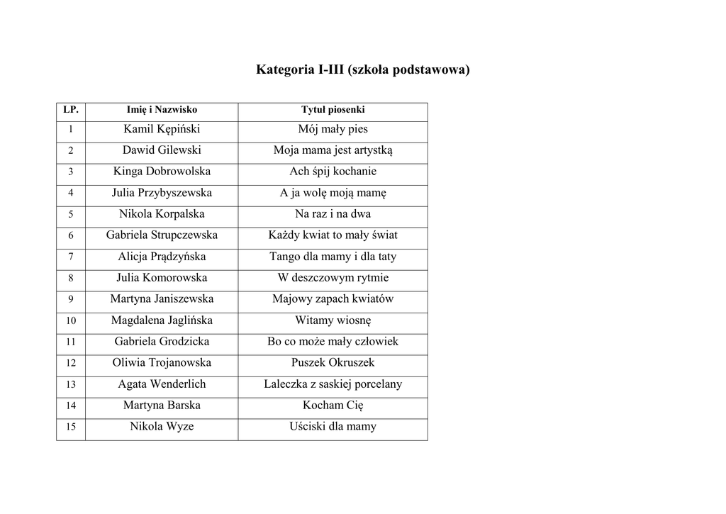 Kategoria I-III (szkoła podstawowa) LP. Imię i Nazwisko Tytuł piosenki 1 Kamil Kępiński Mój mały pies 2 Dawid Gilewski Moja mama jest artystką 3 Kinga Dobrowolska Ach śpij kochanie 4 Julia Przybyszewska A ja wolę moją mamę 5 Nikola Korpalska Na raz i na dwa 6 Gabriela Strupczewska Każdy kwiat to mały świat 7 Alicja Prądzyńska Tango dla mamy i dla taty 8 Julia Komorowska W deszczowym rytmie 9 Martyna Janiszewska Majowy zapach kwiatów 10 Magdalena Jaglińska Witamy wiosnę 11 Gabriela Grodzicka Bo co może mały człowiek 12 Oliwia Trojanowska Puszek Okruszek 13 Agata Wenderlich Laleczka z saskiej porcelany 14 Martyna Barska Kocham Cię 15 Nikola Wyze Uściski dla mamy 16 Paweł Staniszewski Piosenka dla taty 17 Monika Sobocińska Bardzo smutna piosenka retro 18 Maja Ziemińska Motylem byłam 19 Marta Górecka W wesołym miasteczku 20 Magdalena Leśniewska Był sobie strach 21 Wiktoria Jankowska Sto pytań 22 Ksawier Czajkowski Powrót Bocianów 23 Martyna Tuchewicz Ziemia – wyspa zielona 24 Gabriela Szwarc Cyrk wita was 25 Wirginia Chrabąszczewska Kapelusze mają dusze 26 Aleksandra Ziółkowska Przyjaciel wie 27 Julia Raczkowska Ziemia – wyspa zielona Kategoria : Klasy IV-VI S.P. LP. Imię i Nazwisko Tytuł piosenki 1 Klaudia Wrześniak Mama dobrze wie 2 Natalia Kucińska Niewiele mam 3 Julia Jankowska Chcę do Bodzia 4 Natalia Dobrowolska Mały Książę i Róża 5 Zuzanna Kłusek Będę nauczycielką 6 Aleksandra Wozelak Moja mama jest artystką 7 Oliwia Rutkowska Daj mi rękę tato 8 Sylwia Celmer Rytm i melodia 9 Hanna Korycka Biegnij przed siebie 10 Martyna Przybyszewska Nie ma kraju 11 Zuzanna Murawska Najtrudniejszy pierwszy krok 12 Szymon Buczkowski A ja wolę moja mamę 13 Daria Rumińska Nieprawda 14 Alicja Mosakowska A w parku jesień 15 Bartosz Dudziński Pejzaż bez ciebie 16 Mateusz Winnicki Takie miejsce 17 Wiktoria Wróblewska Drzwi do kariery 18 Nikola Ostolska Autsajder 19 Oliwia Ciesielska Marzenia się spełniają Kategoria : Gimnazjum LP. Imię i Nazwisko Tytuł piosenki 1 Wiktoria Grefkowicz Julia i ja 2 Lidia Kępczyńska Szare miraże 3 Kinga Szybowska Piosenka księżycowa 4 Jakub Zawadzki Dni, których nie znamy 5 Natalia Sułkowska To wszystko z nudów 6 Martyna Czupryniak Wariatka tańczy 7 Klaudia Chłopecka Mister of America 8 Agata Markowska To wszystko z nudów 9 Marta Winnicka Odcienie 10 Amelia Zarębska Miasteczko Bełz 11 Maria Smolińska Nie żałuję 12 Aleksandra Kalinowska Piosenka księżycowa 13 Patrycja Wiśniewska Sabotaż 14 Oliwia Borowicz Piosenka księżycowa 15 Angelika Insadowska Piosenka drewnianych lalek 16 Julia Rode Moje serce to jest muzyk 17 Michał Kamiński Między ciszą a ciszą 18 Wiktoria Jankowska Czas nie będzie na nas czekał Kategoria: Szkoła średnia i osoby dorosłe LP. Imię i Nazwisko Tytuł piosenki 1 Agata Anna Adamowicz Chcę tu zostać 2 Magda Kacprowicz Dobranoc panowie 3 Łukasz Pawłowski Do nieba nie chodzę