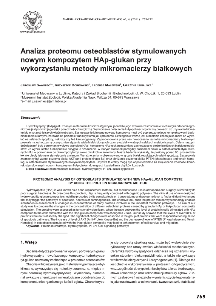 MATERIA£Y CERAMICZNE /CERAMIC MATERIALS/, 63, 4, (2011), 769-772 www.ptcer.pl/mccm Analiza proteomu osteoblastów stymulowanych nowym kompozytem HAp-glukan przy wykorzystaniu metody mikromacierzy biaákowych JAROSàAW SAWINIEC1*, KRZYSZTOF BORKOWSKI1, TADEUSZ MALEWSKI2, GRAĩYNA GINALSKA1 Uniwersytet Medyczny w Lublinie, Katedra i Zakáad Biochemii i Biotechnologii, ul. W. ChodĨki 1, 20-093 Lublin Muzeum i Instytut Zoologii, Polska Akademia Nauk, Wilcza 64, 00-679 Warszawa *e-mail: [email protected] 1 2 Streszczenie Hydroksyapatyt (HAp) jest uznanym materiaáem koĞciozastĊpczym, jednakĪe jego szerokie zastosowanie w chirurgii i ortopedii ograniczone jest poprzez jego niską porĊcznoĞü chirurgiczną. Wytworzenie poáączenia HAp-polimer organiczny prowadzi do uzyskania biomateriaáu o korzystniejszych wáaĞciwoĞciach. Zastosowanie kliniczne nowego kompozytu musi byü poprzedzone jego kompleksowymi badaniami molekularnymi, zarówno na poziomie transkryptomu jak i proteomu. Szczególnie waĪne jest okreĞlenie zmian jakie moĪe on wywoáaü na szlakach apoptozy, nekrozy czy teĪ karcynogenezy. Zaproponowana przez nas nowoczesna technika mikromacierzy biaákowych pozwala na jednoczesną ocenĊ zmian stĊĪenia wielu biaáek biorących czynny udziaá w waĪnych szlakach metabolicznych. Celem naszych doĞwiadczeĔ byáo porównanie wpáywu granulatu HAp i kompozytu HAp-glukan na zmiany zachodzące w stĊĪeniu róĪnych biaáek osteoblastów. Za wyniki istotne funkcjonalnie przyjĊto te oznaczenia, w których stosunek pomiĊdzy poziomem biaáek w osteoblastach stymulowanych HAp w porównaniu do biokompozytu byá okoáo dwukrotnie zmieniony. Nasze badania wykazaáy, Īe poziomy ponad 90. procent biaáek nie ulegáy istotnym statystycznie zmianom. WyraĨne zmiany obserwowano w grupie biaáek regulujących szlaki apoptozy. Szczególnie znamienny byá wzrost poziomu biaáka AKT (anti-protein kinase BĮ) oraz obniĪenie poziomu biaáka PTEN (phosphatase and tensin homolog) w osteoblastach stymulowanych nowym kompozytem. Obydwa te efekty mogą byü odpowiedzialne za zwiĊkszenie zdolnoĞci komórek stymulowanych nowym kompozytem HAp-glukan do migracji i zasiedlania ubytków kostnych. Sáowa kluczowe: mikromacierze biaákowe, hydroksyapatyt, PTEN, szlaki sygnaáowe PROTEOMIC ANALYSIS OF OSTEOBLASTS STIMULATED WITH NEW HAp-GLUCAN COMPOSTE BY USING THE PROTEIN MICROARRAYS METHOD Hydroxyapatite (HAp) is well known as a bone-replacement material, but its widespread use in orthopedic and surgery is limited by its poor surgical handiness. To overcome this problem, Hap is frequently combined with organic polymers. The clinical use of new designed hydroxyapatite-glucan composite should be preceded by its complex tests on transcriptome and proteome level to ¿nd and identify changes that may trigger the pathways of apoptosis, necrosis or carcinogenesis. The effective tool, such the protein microarray technology enables simultaneous assessment of changes in concentrations of many proteins involved in the important metabolic pathways. The aim of our study was to compare the changes in the concentration of different osteoblast proteins caused by granular HAp or HAp-glucan composite stimulation. The proteins were assessed as functionally signi¿cant, when the ratio between the level of protein in cells stimulated with HAp compared to the cells stimulated with the Hap-glukan composite was changed 2-fold. Our study showed that the levels of over 90 % of proteins were not statistically changed. The signi¿cant changes were observed in the group of proteins that were responsible for regulation of apoptosis pathways. The increase of level of AKT (Anti-Protein Kinase BĮ) and the decrease of level of PTEN (Phosphatase and Tensin Homolog) in osteoblasts stimulated with the Hap-glukan composite may lead to enhancement of cell survival and migration. Keywords: Protein microarrays, Hydroxyapatite, PTEN, Cell signalling pathways 1. WstĊp Badania dotyczą porównania wpáywu porowatych granul hydroksyapatytu i dwufazowego kompozytu hydroksyapatyt-glukan na zmiany zachodzące w proteomie osteoblastów. Obecnie w bioinĪynierii, jako materiaáy wypeániające ubytki kostne, wykorzystuje siĊ materiaáy ceramiczne, miĊdzy innymi ceramikĊ hydroksyapatytową. Wymieniony biomateriaá wykazuje chemiczne i mineralogiczne podobieĔstwo do komponentu nieorganicznego koĞci i zĊbów. Charakteryzu- je siĊ porowatą strukturą oraz moĪe byü wielokrotnie sterylizowany bez utraty swoich wáaĞciwoĞci mechanicznych. Ceramika hydroksyapatytowa odznacza siĊ uznanym i wysokim stopniem biokompatybilnoĞci, a takĪe nie wykazuje wáaĞciwoĞci alergicznych i karcynogennych [1]. Dlatego teĪ jest chĊtnie wykorzystywana w protezach ortopedycznych, w szczególnoĞci do wypeániania ubytków talerza biodrowego, stawu kolanowego oraz rekonstrukcji struktury zĊbów. Z innych zastosowaĔ naleĪaáoby wymieniü uĪycie tego materiaáu jako rusztowania w odtwarzaniu twarzoczaszki, stabilizacji 769 J. SAWINIEC, K. BORKOWSKI, T. MALEWSKI, G. GINALSKA stawu Īuchwowego i poáączeĔ miĊdzykrĊgowych. Ma takĪe zastosowanie do wypeániania ubytków kostnych powstaáych w wyniku chirurgicznego usuniĊcia nowotworów. W niektórych zabiegach ortopedycznych, aby zwiĊkszyü siáĊ wiązania koĞci z implantem tytanowym, moĪna pokryü go cienką warstwą hydroksyapatytu. W medycynie hydroksyapatyt wykorzystywany jest takĪe jako noĞnik róĪnego rodzaju substancji bioaktywnych takich jak antybiotyki, chemioterapeutyki czy nawet czynniki wzrostu. Wymienione szerokie zastosowanie tego nieorganicznego skáadnika limitowane jest jego kruchoĞcią i maáą wytrzymaáoĞcią mechaniczną (áamliwoĞcią), a co za tym idzie sáabą adaptacją do miejsca implantacji i záą porĊcznoĞcią chirurgiczną. Te ograniczenia oraz sáaba poimplantacyjna zdolnoĞü resorpcyjna wytworzyáy koniecznoĞü poszukiwania biomateriaáów wolnych od tych ograni
