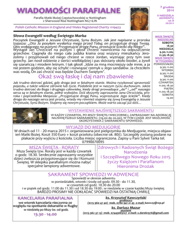7 grudnia 2014 WIADOMOŚCI PARAFIALNE II NIEDZIELA ADWENTU rok B Parafia Matki Bożej Częstochowskiej w Nottingham 2 Sherwood Rise Nottingham NG7 6JN 50/2014 Polish Catholic Mission in England and Wales Registered Charity 1119423 Słowa Ewangelii według Świętego Marka Początek Ewangelii o Jezusie Chrystusie, Synu Bożym. Jak jest napisane u proroka Izajasza: „Oto Ja posyłam wysłańca mego przed Tobą; on przygotuje drogę Twoją. Głos wołającego na pustyni: Przygotujcie drogę Panu, prostujcie ścieżki dla Niego”. Wyst pił Jan Chrzciciel na pustyni i głosił chrzest nawrócenia na odpuszczenie grzechów. Ci gn ła do niego cała judzka kraina oraz wszyscy mieszka cy Jerozolimy i przyjmowali od niego chrzest w rzece Jordan, wyznaj c przy tym swe grzechy. Jan nosił odzienie z sier ci wielbł dziej i pas skórzany około bioder, a ywił si szara cz i miodem le nym. I tak głosił: „Idzie za mn mocniejszy ode mnie, a ja nie jestem godzien, aby si schyli i rozwi za rzemyk u Jego sandałów. Ja chrzciłem was wod , On za chrzci was b dzie Duchem wi tym . Okaż swą łaskę i daj nam zbawienie Jak trudno dotrzeć gdzieś, gdy droga jest w fatalnym stanie. Można ryzykować sprawność pojazdu, a także własne zdrowie lub życie. Podobnie jest w naszym życiu duchowym. Jakże trudno dotrzeć do Boga i drugiego człowieka, kiedy drogi prowadzące „do” i „od” naszego serca są w fatalnym stanie, pełne wybojów. Dziś słyszymy zaproszenie Jana Chrzciciela, pro-‐ roka i poprzednika Mesjasza: „Przygotujcie drogę Panu, wyprostujcie Jego ścieżki”. Kiedy droga do naszego serca jest prosta, wtedy my również stajemy się żywą Ewangelią o Jezusie Chrystusie, Synu Bożym. Stajemy się nowym początkiem. Może warto zacząć już dziś… MSZE S&WIĘTE NIEDZIELNE SOBOTA 18.30 NIEDZIELA 9.30; 11.00; 12.30; 18.30 MSZE S&WIĘTE W TYGODNIU PONIEDZIAŁEK 9.30; 11.00 WTOREK 9.30; 11.00 SURODA 9.30; 11.00 CZWARTEK 11.00; 18.30 PIĄTEK 11.00; 18.30 SOBOTA 14.00 WYSTAWIENIE NAJŚWIĘTSZEGO SAKRAMENTU W KAŻDY CZWARTEK, PO MSZY ŚWIĘTEJ WIECZORNEJ, ZAPRASZAMY NA ADORACJĘ NAJŚWIĘTSZEGO SAKRAMENTU. (19.00 do 20.00). W TYM CZASIE JEST MOŻLIWOŚĆ SKORZYSTANIA Z SAKRAMENTU SPOWIEDZI. WYJAZD DO MEDJUGORIE W dniach od 11 - 20 marca 2015 r. organizowana jest pielgrzymka do Medjugorie, miejsca objawie Matki Bo ej. Koszt 350 Euro + koszt przelotu (obecnie ok. 80£). Szczegóły zostan podane na plakacie przy wyj ciu z ko cioła. Liczba miejsc ograniczona. Zapisy u Pani Sylwii Tarka tel. 07990070095 MSZA ŚWIĘTA -‐ RORATY Msza wi ta tzw. Roraty jest w ka dy czwartek o godz. 18.30. Serdecznie zapraszamy wszystkie dzieci zwłaszcza przygotowuj ce si do I Komunii wi tej. W sklepiku parafialnym mo na naby specjalne lampiony adwentowe. Zdrowych i Radosnych Świąt Bożego Narodzenia i Szczęśliwego Nowego Roku 2015 życzy Księżom i Parafianom Hieronima Drożak SAKRAMENT SPOWIEDZI W ADWENCIE Spowied w okresie adwentu w poniedziałek, wtorek i rod od godz. 09.30 - do 11.30, w czwartek od godz. 18.30 do 20.00 i w pi tek od godz. 11.00 do 11.30 i od 18.30 do 19.00 ; w niedziel w czasie ka dej Mszy wi tej. BARDZO PROSIMY NIE ODKŁADA SPOWIEDZI NA OSTATNI CHWIL KANCELARIA PARAFIALNA we wtorek kancelaria nieczynna ze względu na spotkanie dekanalne w Rugby w niedziel po Mszy w. od godz. 13.30 -‐ 14.00 ks. Krzysztof Kawczyński proboszcz (0115 960 47 40) mob. 0780 941 21 45 e-‐mail: [email protected] ks. Dariusz Mazur asystent (0115 962 37 13) mob. 07445683127 e-‐mail: [email protected] INTENCJE MSZY ŚWIĘTYCH W tym tygodniu rozpoczniemy wizy-‐ ty duszpasterskie w naszej Parafii w 6 grudnia, sobota dzielnicy NG5 1xx. Z każdą rodziną 14.00 +Marię -‐ intencja dziadków skontaktujemy się osobiście, aby 18.30 1. +Zmarłych z Rodz. Wiktorów, Rośków, Kitów -‐ intenc wybrać najdogodniejszy czas. WIZYTA DUSZPASTERSKA ZBIÓRKA MINISTRANCKA W poniedziałek 8 grudnia 2014 r. zbiórka ministrancka odwołana ze w z g l ę d u n a U r o c z y s t o ś ć Niepokalanego Poczęcia NMP CHÓR MŁODZIEŻOWY Osoby zainteresowane śpiewem w chórze a także grające na instru-‐ mentach zapraszamy w sobotę 13 listopada 2014 r. o godz. 16.00 do sali w Orchard House. CHÓR PARAFIALNY ŚW. CECYLII W każdy czwartek o godz. 16.00 za-‐ praszamy na próby chóru św. Cecylii do Orchard House. Chór przygo-‐ towuje koncert kolęd w naszej Parafii. Zapraszamy. I KOMUNIA ŚWIĘTA W sobotę 13 grudnia 2014 r. zajęcia w Parafii i w szkole są odwołane ze względu na Jasełka w Polskiej Szkole Sobotniej. ZAPROSZENIE Koło Seniorów serdecznie zaprasza gości do odwiedzenia naszej kaw-‐ iarenki w niedzielę po pierwszej i drugiej Mszy świętej, aby wspólnie spędzić czas kawie i ciastku. Za-‐ praszamy również do udziału w naszych imprezach w ciągu roku. ZBIÓRKA ŻYWNOŚCI I UBRAŃ Jak co roku zwracamy się do Parafi-‐ an o przekazanie używanej odzieży a także trwałej żywności dla na-‐ jbardziej ubogich z Emmanuel House. Najbardziej potrzebne są rzeczy dla mężczyzn (90% bezdom-‐ nych to mężczyźni), ciepłe ubrania, buty, spodnie, swetry, kurtki itp. Rzeczy te będzie można składać w zakrystii kościoła lub przy wejściu. SANITARIATY W dniu dzisiejszym ofiary ze-‐ brane na tacę w całości przez-‐ naczone są na remont sanitari-‐ atów w naszym Ośrodku Parafi-‐ alnym. Pragniemy również poin-‐ formować, że prace związane z renowacją są już na ukończeniu i w najbliższym czasie będziemy mogli korzystać z sanitariatów. Dziękujemy za wszelką pomoc. ja rodziny 2. +Tadeusza Kamińskiego (15 rocz.śm.) i za Rodziców z obu stron 7 grudnia, II NIEDZIELA ADWENTU 09.30 + Rodziców -‐ intencja synów 11.00 +Fabiana Świderskiego -‐ intencja żony 12.30 +Hannę Krystynę Cichorek -‐ intencja córki 18.30 W intencji Parafian 8 grudnia, poniedziałek -‐ Niepokalanego Poczęcia NMP 09.30 +Zmarłych z Rodziny Uliczka -‐ intencja rodziny 
