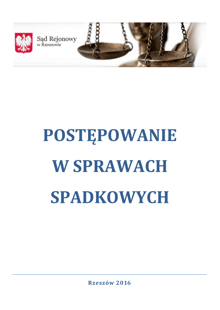 POSTĘPOWANIE W SPRAWACH SPADKOWYCH Rzeszów 2016 Przeprowadzenie postępowania sądowego sprawie spadkowej nie jest obowiązkowe. Nie będzie w ogóle potrzebne jeżeli majątek zmarłego jest niewielki (np. obejmuje tylko drobne ruchomości). Nie jest też ograniczone żadnym terminem, może więc mieć miejsce nawet po kilkudziesięciu latach po śmierci spadkodawcy. Upływ czasu nie ma wpływu na to kto zostanie uznany za spadkobiercę, ponieważ o tym kto jest spadkobiercą decyduje stan istniejący w chwili śmierci spadkodawcy. Jeżeli więc któryś ze spadkobierców (który żył w momencie śmierci, spadkodawcy) umrze przed złożeniem wniosku o stwierdzenie nabycia spadku, to i tak w postanowieniu sądu zostanie uznany za spadkobiercę, a to, co odziedziczył wejdzie do spadku po nim. Pierwszym krokiem do formalnego załatwienia kwestii spadkowych jest złożenie WNIOSKU O STWIERDZENIE NABYCIA SPADKU. Powinieneś go złożyć do Wydziału Cywilnego Sądu Rejonowego, właściwego dla ostatniego, stałego miejsca zamieszkania spadkodawcy. WNIOSEK O STWIERDZENIE NABYCIA SPADKU POWINIEN ZAWIERAĆ: • imię, nazwisko, adres i numer PESEL osoby składającej wniosek (wnioskodawca) oraz imiona, nazwiska, adresy i numery PESEL (o ile jest to możliwe) osób, które mogą wchodzić w rachubę jako spadkobiercy ustawowi i testamentowi (uczestnicy postępowania); • imię i nazwisko zmarłego, datę i miejsce (miejscowość) jego śmierci oraz jego ostatnie miejsce stałego zamieszkania; • do wniosku należy dołączyć akt zgonu oraz inne akty stanu cywilnego wskazujące na pokrewieństwo osób wskazanych we wniosku jako spadkobiercy ze zmarłym(odpis skrócony aktu urodzenia, odpis skrócony aktu małżeństwa); jeżeli zmarły zostawił testament lub testamenty, należy je wszystkie wymienić we wniosku i dołączyć w oryginale; Należy również dołączyć kserokopie wniosku (odpisy) w takiej ilości, żeby można było doręczyć po jednym odpisie wniosku każdemu uczestnikowi. Wniosek należy opłacić znakami opłaty sądowej w kwocie 50 zł. Dodatkowo należy uiścić za wpis w Rejestrze Spadkowym 5 zł wyłącznie na konto NBP 60 1010 1528 0016 9013 9800 0000 (trzeba obowiązkowo podać sygnaturę akt sprawy i można powyższą kwotę wpłacać w Kasie tutejszego Sądu). Po wpłynięciu takiego wniosku do sądu, sędzia sprawdza, czy niczego w nim nie brakuje i ewentualnie wzywa wnioskodawcę do uzupełnienia braków. Po uzupełnieniu braków sędzia wyznacza rozprawę, na którą wzywa wnioskodawcę i uczestników postępowania. Pouczenie o obowiązku lub braku obowiązku stawiennictwa w sądzie znajdziesz na wezwaniu na rozprawę. Po przeprowadzeniu rozprawy sędzia ogłasza postanowienie o stwierdzeniu nabycia spadku, w którym wymienia spadkodawcę oraz wszystkich spadkobierców, którym spadek przypadł, jak również wysokość ich udziałów (w postaci ułamka). Sąd stwierdzi nabycie spadku przez spadkobierców, choćby były nimi inne osoby niż te, które wskazali uczestnicy. Postanowienie wydane przez sąd nie jest prawomocne. Jeżeli jesteś z niego niezadowolony, możesz zaskarżyć je apelacją. Jeżeli żaden z uczestników postępowania nie wniesie apelacji, to postanowienie uprawomocni się po 3 tygodniach od ogłoszenia. Wtedy dopiero możesz otrzymać jego odpis z klauzulą prawomocności. Sąd nie wysyła odpisów postanowienia z urzędu - jeśli chcesz je otrzymać, musisz złożyć pisemny wniosek i opłacić go znakami opłaty sądowej w kwocie 6 zł za każdą stronę postanowienia. Po uprawomocnieniu się postanowienia sąd przesyła jego odpis do urzędu skarbowego. Powinieneś się liczyć z koniecznością rozliczenia się z podatku od spadków i darowizn. JAKIE SĄ SKUTKI UZYSKANIA PRAWOMOCNEGO POSTANOWIENIA O STWIERDZENIU NABYCIA SPADKU Takie postanowienie w sposób urzędowy zaświadcza przejście majątku na spadkobierców. Jest podstawą do wpisania ich jako nowych właścicieli nieruchomości (jeśli taka wchodziła w skład spadku) do księgi wieczystej, umożliwia im dostęp do rachunków bankowych, daje podstawę do przerejestrowania samochodu itp. Jeżeli cały spadek odziedziczył jeden spadkobierca, to do załatwienia pozostają jedynie formalności związane z przepisaniem majątku na nowego właściciela. Gdy jest więcej spadkobierców, sprawa jest bardziej skomplikowana, gdyż określone w postanowieniu udziały (ułamki) przysługują im odnośnie każdego przedmiotu wchodzącego do spadku. Mogą oni znieść wspólność majątku spadkowego rozdzielając pomiędzy siebie poszczególne przedmioty majątkowe. Jest to tzw. DZIAŁ SPADKU. Jeżeli wszyscy spadkobiercy zgadzają się co do tego komu przypadną konkretne przedmioty, mogą załatwić tę sprawę umownie. Mają przy tym całkowitą swobodę - nie muszą dzielić majątku tak, by wartość otrzymanych przedmiotów była zbliżona do wielkości udziału (ułamka) określonego w postanowieniu sądu o stwierdzeniu nabycia spadku. Jeżeli w skład spadku wchodziła nieruchomość, umowa musi mieć formę aktu notarialnego, w pozostałych przypadkach działu można dokonać nawet ustnie, a więc bez zachowania jakiejś szczególnej formy. Jednak jeżeli do spadku wszedł np. samochód (albo inne przedmioty podlegające rejestracji), to do jego przerejestrowania potrzebne będzie przedstawienie w urzędzie umowy na piśmie. Spadkobiercy mogą też udać się do sądu (tego samego sądu, w którym toczyło się wcześniejsze postępowanie spadkowe) i zażądać sądowego działu spadku. We wniosku o dział spadku należy podać: • imiona, nazwiska i adresy wszystkich spadkobierców, • cały odziedziczony majątek oraz jego przybliżone wartość, • jeżeli spadkodawca pozostawił testament lub testamenty, należy wymienić je wszystkie i podać gdzie zostały złożone i gdzie się znajdują, • jeżeli w skład spadku wchodzi nieruchomość, to trzeba przedstawić dowod