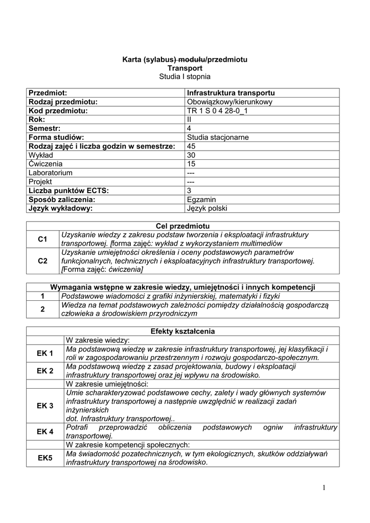 Karta (sylabus) modułu/przedmiotu Transport Studia I stopnia Przedmiot: Rodzaj przedmiotu: Kod przedmiotu: Rok: Semestr: Forma studiów: Rodzaj zajęć i liczba godzin w semestrze: Wykład Ćwiczenia Laboratorium Projekt Liczba punktów ECTS: Sposób zaliczenia: Język wykładowy: C1 C2 Infrastruktura transportu Obowiązkowy/kierunkowy TR 1 S 0 4 28-0_1 II 4 Studia stacjonarne 45 30 15 ----3 Egzamin Język polski Cel przedmiotu Uzyskanie wiedzy z zakresu podstaw tworzenia i eksploatacji infrastruktury transportowej. [forma zajęć: wykład z wykorzystaniem multimediów Uzyskanie umiejętności określenia i oceny podstawowych parametrów funkcjonalnych, technicznych i eksploatacyjnych infrastruktury transportowej. [Forma zajęć: ćwiczenia] Wymagania wstępne w zakresie wiedzy, umiejętności i innych kompetencji Podstawowe wiadomości z grafiki inżynierskiej, matematyki i fizyki 1 Wiedza na temat podstawowych zależności pomiędzy działalnością gospodarczą 2 człowieka a środowiskiem przyrodniczym Efekty kształcenia EK 1 EK 2 EK 3 EK 4 EK5 W zakresie wiedzy: Ma podstawową wiedzę w zakresie infrastruktury transportowej, jej klasyfikacji i roli w zagospodarowaniu przestrzennym i rozwoju gospodarczo-społecznym. Ma podstawową wiedzę z zasad projektowania, budowy i eksploatacji infrastruktury transportowej oraz jej wpływu na środowisko. W zakresie umiejętności: Umie scharakteryzować podstawowe cechy, zalety i wady głównych systemów infrastruktury transportowej a następnie uwzględnić w realizacji zadań inżynierskich dot. Infrastruktury transportowej.. Potrafi przeprowadzić obliczenia podstawowych ogniw infrastruktury transportowej. W zakresie kompetencji społecznych: Ma świadomość pozatechnicznych, w tym ekologicznych, skutków oddziaływań infrastruktury transportowej na środowisko. 1 W1 W2 W3 W4 W5 W6 W7 W8 W9 ĆW1 ĆW2 ĆW3 ĆW4 Treści programowe przedmiotu Forma zajęć – wykłady Treści programowe Wprowadzenie do przedmiotu- infrastruktura transportu. Charakterystyka i klasyfikacja infrastruktury transportowej. Kierunki rozwoju infrastruktury transportu. Infrastruktura transportu drogowego. Podstawowe właściwości funkcjonalne oraz podstawowe parametry techniczne i eksploatacyjne infrastruktury drogowej Charakterystyka transportu kolejowego. Podstawowe elementy infrastruktury transportu szynowego Systemy transportu szynowego. Podstawowe elementy drogi szynowej – układ konstrukcyjny, parametry techniczne i eksploatacyjne Infrastruktura kolei dużych prędkości. Wymagania i podstawowe zasady projektowania infrastruktury kolei dużych prędkości. Zagadnienia środowiskowe w budowie, eksploatacji i utrzymaniu infrastruktury kolejowej Infrastruktura transportu miejskiego. Klasyfikacja i charakterystyka infrastruktury transportu miejskiego. Zadania i obiekty infrastruktury transportu miejskiego. Infrastruktura liniowa i punktowa w transporcie miejskim. Organizacja transportu miejskiego. Infrastruktura transportu lotniczego. Klasyfikacja i podstawowa charakterystyka. Organizacja ruchu lotniczego. Drogi lotnicze, lotniska i lądowiska, port lotniczy, pojęcie węzła lotniczego (hubu). Infrastruktura transportu wodnego. Klasyfikacja i charakterystyka infrastruktury transportu wodnego. Transport wodny śródlądowy. Transport morski Infrastruktura złożonych systemów transportowych. Infrastruktura transportu intermodalnego. Techniki i technologie transportu intermodalnego. Terminale i centra logistyczne. Podstawowa charakterystyka funkcjonalna i parametry techniczne transportu rurociągami. Zaplecze techniczne i ogólne zasady utrzymania infrastruktury transportu drogowego, szynowego, lotniczego, wodnego i rurociągowego.. Kierunki rozwoju infrastruktury - tendencje światowe. Ochrona środowiska a infrastruktura transportu. Podsumowanie wykładu Forma zajęć – ćwiczenia Treści programowe Zajęcia wprowadzające: zasady zaliczania przedmiotu, harmonogram ćwiczeń, wybór tematu ćwiczeń obliczeniowych Drogi samochodowe – geometria, nawierzchnia, konstrukcja. Trasowanie dróg. Obliczenia dla dróg promieni łuków poziomych i pionowych Koordynacja trasy w planie i profilu. Określenie skrajni w przewozie samochodowym Tory kolejowe – konstrukcja, podstawowe obliczenia. Określenie skrajni w 2 ĆW5 ĆW6 1 2 przewozie kolejowym Zadania obliczeniowe w przewozie krajowym i międzynarodowym osób i rzeczy. Obliczenie mocy minimalnej napędowej zespołu pojazdów. Zaliczenie ćwiczeń Metody dydaktyczne Wykład z prezentacją multimedialną Ćwiczenia obliczeniowe z wykorzystaniem wspomagania komputerowego Obciążenie pracą studenta Średnia liczba godzin na zrealizowanie Forma aktywności aktywności Godziny kontaktowe z wykładowcą, 48 w tym: Godziny kontaktowe z wykładowcą, realizowane w formie zajęć dydaktycznych 45 (wykład + ćwiczenia) – łączna liczba godzin w semestrze Godziny kontaktowe z wykładowcą, 3 realizowane w formie konsultacji – łączna liczba godzin w semestrze 27 Praca własna studenta, w tym: Samodzielne przygotowanie się do ćwiczeń – 12 łączna liczba godzin w semestrze Samodzielne przygotowanie się do egzaminu 15 – łączna liczba godzin w semestrze 75 Łączny czas pracy studenta Sumaryczna liczba punktów ECTS dla 3 przedmiotu, w tym: Liczba punktów ECTS w ramach zajęć 1 o charakterze praktycznym (ćwiczenia, laboratoria, projekty) 1 2 3 1 2 3 Literatura podstawowa Basiewicz T., Gołaszewski A., Rudziński L. Infrastruktura transportu. Oficyna Wydawnicza Politechniki Warszawskiej, Warszawa 2007 Towpik K., Gołaszewski A., Kukulski J. Infrastruktura transportu samochodowego, Oficyna Wydawnicza Politechniki Warszawskiej, Warszawa 2006 Wojewódzka-Król K., Rolbiecki R, Infrastruktura transportu, UG, Gdańsk 2011. Literatura uzupełniająca Karbowiak H. Podstawy infrastruktury transportu. Wydawnictwo WSH-E, Łódź, 2009 Rolbiecki R. Infrastruktura transportu jako czynnik kształtujący warunki roz