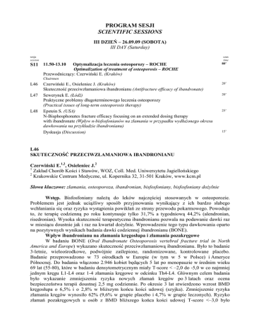 PROGRAM SESJI SCIENTIFIC SESSIONS III DZIEŃ – 26.09.09 (SOBOTA) III DAY (Saturday) sesja session czas time S11 11.50-13.10 Optymalizacja leczenia osteoporozy – ROCHE Optimalization of treatment of osteoporosis – ROCHE Przewodniczący: Czerwiński E. (Kraków) 80’ Chairmen L46 L47 L48 Czerwiński E., Osieleniec J. (Kraków) Skuteczność przeciwzłamaniowa ibandronianu (Antifracture efficacy of ibandronate) Sewerynek E. (Łódź) Praktyczne problemy długoterminowego leczenia osteoporozy (Practical issues of long-term osteoporosis therapy) Epstein S. (USA) N-Bisphosphonates fracture efficacy focusing on an extended dosing therapy with ibandronate (Wpływ n-bisfosfonianów na złamania w przypadku wydłuŜonego okresu dawkowania na przykładzie ibandronianu) Dyskusja (Discussion) 20’ 20’ 25’ 15’ L46 SKUTECZNOŚĆ PRZECIWZŁAMANIOWA IBANDRONIANU Czerwiński E.1,2, Osieleniec J.2 1 Zakład Chorób Kości i Stawów, WOZ, Coll. Med. Uniwersytetu Jagiellońskiego 2 Krakowskie Centrum Medyczne, ul. Kopernika 32, 31-501 Kraków, www.kcm.pl Słowa kluczowe: złamania, osteoporoza, ibandronian, bisfosfoniany, bisfosfoniany doŜylnie Wstęp. Bisfosfoniany naleŜą do leków najczęściej stosowanych w osteoporozie. Problemem jest jednak uciąŜliwy sposób przyjmowania wynikający z ich bardzo słabego wchłaniania się oraz ryzyka wystąpienia powikłań ze strony przewodu pokarmowego. Powoduje to, Ŝe terapię codzienną po roku kontynuuje tylko 31,7% a tygodniową 44,2% (alendronian, risedronian). Wysoka skuteczność terapeutyczna ibandronianu pozwala na podawanie dawki raz w miesiącu doustnie jak i raz na kwartał doŜylnie. Wprowadzenie tego typu dawkowania oparto na pozytywnych wynikach badania dawki codziennej ibandronianu (BONE). Wpływ ibandronianu na złamania kręgosłupa i złamania pozakręgowe W badaniu BONE (Oral Ibandronate Osteoporosis vertebral fracture trial in North America and Europe) wykazano skuteczność przeciwzłamaniową ibandronianu. Było to badanie 3-letnie, wieloośrodkowe, podwójnie zaślepione, randomizowane, kontrolowane placebo. Badanie przeprowadzono w 73 ośrodkach w Europie (w tym w 5 w Polsce) i Ameryce Północnej. Do badania włączono 2.946 kobiet będących 5 lat po menopauzie w średnim wieku 69 lat (55-80), które w badaniu densytometrycznym miały T-score < –2,0 do -5,0 w co najmniej jednym kręgu L1-L4 oraz 1-4 złamania kręgowe w odcinku Th4-L4. Głównym celem badania było wykazanie zmniejszenia ryzyka nowych złamań kręgów po 3 latach oraz ocena bezpieczeństwa terapii doustnej 2,5 mg codziennie. Po okresie 3 lat stwierdzono wzrost BMD kręgosłupa o 6,5% i o 2,8% w bliŜszym końcu kości udowej (szyjka). Zmniejszenie ryzyka złamania kręgów wynosiło 62% (9,6% w grupie placebo i 4,7% w grupie leczonych). Ryzyko złamań pozakręgowych u osób z BMD bliŜszego końca kości udowej T-score <–3,0 było obniŜone o 69% (grupa placebo 18%, grupa leczona 6%). Wykazano znamienny wpływ ibandronianu na obniŜenie poziomu markerów obrotu kostnego: C-telopeptyd łańcucha alfa kolagenu typu 1 (sCTX) zmniejszył się o 65,3%, zaś osteokalcyna o 35,8%. Częstość zdarzeń niepoŜądanych nie róŜniła się znamiennie statystycznie pomiędzy grupą leczonych, a placebo. Najczęstszymi objawami niepoŜądanymi w obu grupach były: niestrawność, nudności, ból w przewodzie pokarmowym, wymioty. Podawanie ibandronianu raz w miesiącu Bezpieczeństwo i skuteczność dawki stosowanej raz w miesiącu i raz na kwartał wykazano na zasadzie koncepcji pomostowej. Oparta jest ona na fakcie, Ŝe efekt przeciwzłamaniowy zaleŜy przede wszystkim od wzrostu BMD i obniŜenia resorpcji kości udokumentowanej zmniejszonym poziomem markerów obrotu kostnego. Przyjmuje się zatem Ŝe, jeŜeli pewna dawka tego samego leku podawana w sposób przerywany (np. raz w tygodniu) ma podobny wpływ na gęstość mineralną kości i na poziom markerów obrotu kostnego jak dawka codzienna, której skuteczność przeciwzłamaniowa jest udowodniona, to moŜna przyjąć, Ŝe skuteczność dawki przerywanej będzie podobna. Skuteczność lecznicza dawki ibandronianu stosowanego doustnie raz w miesiącu oceniono w badaniu MOBILE (Monthly Oral IBandronate in LadiEs), w którym wzięło udział 1.609 kobiet w wieku 68 lat (55-80 lat), ze średnim BMD w L2-L4 wskaźnik T<-2,5 do-5,0. Kryteriami wyłączeniowymi były tylko cięŜkie zaburzenia Ŝołądkowo-jelitowe tj. wymagające hospitalizacji lub transfuzji, zaś udziału w badaniu nie wykluczały obecne słabo nasilone zaburzenia Ŝołądkowe np. niestrawność opanowane leczeniem lub wygojone owrzodzenie Porównano wynik leczenia w grupach chorych przyjmujących dawki 100 mg i 150 mg raz w miesiącu do grupy otrzymującej 2,5 mg codziennie. Po uzyskaniu satysfakcjonujących wyników po dwóch latach badanie przedłuŜono do 5 lat w grupach otrzymujących 100 i 150 mg. Względny wzrost BMD kręgosłupa w grupie otrzymującej 150 mg wynosił po 2 latach 6,4% po 3 latach 7,4 po 5 latach 8,4%. W szyjce kości udowej wzrost wynosił odpowiednio 2,7%; 3,5%, 3,2 %. Częstość zdarzeń niepoŜądanych była podobna i nie róŜniła się znamiennie między dwoma grupami. Podawanie ibandronianu raz na kwartał Skuteczność terapeutyczna dawki i.v. 2 mg co 2 miesiące lub 3 mg co 3 miesiące porównano do wyników leczenia w dawce codziennej p.o. 2,5 mg. w badaniu DIVA (Dosing IntraVenous Administration) w którym wzięło udział 1.395 osób. W grupie osób, które otrzymywały dawkę 3 mg wzrost BMD w kręgosłupie lędźwiowym po 2 latach wyniósł– 6,3%, po 3 latach 7%, a po 5 latach 8,1%. W szyjce kości udowej wzrost ten wynosił po 2 latach – 2,8%, po 3 latach – 3,3%, po 5 latach 3,4%. Porównanie skuteczności ibandronianu raz w miesiącu do bisfosfonianów raz w tygodniu W retrospektywnym badaniu VIBE (eValuation of Ibandronate Efficacy) porównano wyniki leczenia ibandronianem raz w miesiącu do bisf