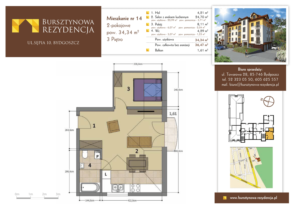 Bursztynowa REZYDENCJA UL.SĘPIA 10, BYDGOSZCZ Mieszkanie nr 14 2-pokojowe pow. 34,34 m2 3 Piętro 1. Hol 2. Salon z aneksem kuchennym 4,21 m2 24,70 m2 pow. użytkowa - 20,99 m2 pow. pomocnicza - 3,71 m2 3. Pokój 8,11 m2 pow. użytkowa - 6,07 m2 pow. pomocnicza - 2,04 m2 pow. użytkowa - 3,07 m2 pow. pomocnicza - 1,23 m2 4. Wc Pow. użytkowa Pow. całkowita bez aranżacji Balkon 4,29 m2 34,34 m2 36,47 m2 1,61 m2 N Biuro sprzedaży: ul. Towarowa 28, 85-746 Bydgoszcz tel. 52 323 05 50, 605 625 557 mail. [email protected] 0m 1m 2m 3m www.bursztynowa-rezydencja.pl