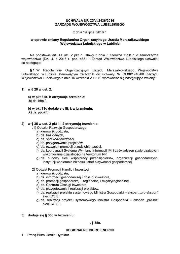 UCHWAŁA NR CXVI/2436/2016 ZARZĄDU WOJEWÓDZTWA LUBELSKIEGO z dnia 19 lipca 2016 r. w sprawie zmiany Regulaminu Organizacyjnego Urzędu Marszałkowskiego Województwa Lubelskiego w Lublinie Na podstawie art. 41 ust. 2 pkt 7 ustawy z dnia 5 czerwca 1998 r. o samorządzie województwa (Dz. U. z 2016 r. poz. 486) – Zarząd Województwa Lubelskiego uchwala, co następuje: § 1. W Regulaminie Organizacyjnym Urzędu Marszałkowskiego Województwa Lubelskiego w Lublinie stanowiącym załącznik do uchwały Nr CLXII/1916/08 Zarządu Województwa Lubelskiego z dnia 16 września 2008 r.1 wprowadza się następujące zmiany: 1) w § 28 w ust. 2: a) w pkt 6 lit. h otrzymuje brzmienie: „h) ds. bhp,”, b) w pkt 11c dodaje się lit. k w brzmieniu: „k) ds. ppoż.”; 2) w § 35 w ust. 2 pkt 1 i 2 otrzymują brzmienie: „1) Oddział Rozwoju Gospodarczego, a) kierownik oddziału, b) ds. baz danych, c) ds. sprawozdawczości, d) ds. przygotowania projektów, e) ds. rozwoju i promocji przedsiębiorczości, f) ds. koordynacji Systemu Wymiany Informacji IMI i zaświadczeń stwierdzających wykonywanie działalności na terytorium RP, g) ds. budowy sieci współpracy przedsiębiorstw, organizacji gospodarczych, instytucji wspierania biznesu i stref aktywności gospodarczej. 2) Oddział Promocji Handlu i Inwestycji, a) kierownik oddziału, b) ds. informacji gospodarczej i obsługi inwestora, c) ds. promocji gospodarczej – regionalnej i międzyregionalnej, d) ds. Centrum Obsługi Inwestora, e) ds. przygotowania i realizacji projektów, f) ds. realizacji projektu systemowego Ministra Gospodarki – ekspert „pro-eksport” sieci COIE, g) ds. realizacji projektu systemowego Ministra Gospodarki – ekspert „pro-biz” sieci COIE.”; 3) dodaje się § 35c w brzmieniu: „§ 35c. REGIONALNE BIURO ENERGII 1. Pracą Biura kieruje Dyrektor. 2. W Regionalnym Biurze Energii tworzy się następujące oddziały i stanowiska pracy: 1) Oddział Energetyki, a) kierownik oddziału, b) ds. energetyki, planowania rozwoju rynku energii, c) ds. monitorowania rozwoju OZE i zużycia energii w budynkach użyteczności publicznej, d) ds. budowania sieci powiązań i transferu wiedzy, e) ds. przygotowania i realizacji projektów, f) ds. sprawozdawczości, g) ds. baz danych i informatyki, 2) Oddział Realizacji Projektów, a) Kierownik Oddziału, b) ds. realizacji projektu „Ogólnopolski system wsparcia doradczego dla sektora publicznego i mieszkaniowego oraz przedsiębiorców w zakresie efektywności energetycznej oraz OZE, c) ds. energetyki, infrastruktury technicznej i energii odnawialnej. 3) sekretarka. 3. W oznaczeniu spraw Regionalne Biuro Energii używa symbolu „RBE”. Oddział Energetyki „RBE-I.”, Oddział Realizacji Projektów „RBE-II.””; 4) w § 48: a) w ust. 8 skreśla się pkt 9, b) w ust. 13c dodaje się pkt 13 w brzmieniu: „13) wykonywanie czynności z zakresu ochrony przeciwpożarowej zgodnie z ustawą o ochronie przeciwpożarowej a w szczególności: a) przestrzegać przeciwpożarowych wymagań techniczno-budowlanych, instalacyjnych i technologicznych, b) wyposażyć budynek, obiekt budowlany lub teren w wymagane urządzenia przeciwpożarowe i gaśnice, c) zapewnić konserwację oraz naprawy urządzeń przeciwpożarowych i gaśnic w sposób gwarantujący ich sprawne i niezawodne funkcjonowanie, d) zapewnić osobom przebywającym w budynku, obiekcie budowlanym lub na terenie, bezpieczeństwo i możliwość ewakuacji, e) przygotować budynek, obiekt budowlany lub teren do prowadzenia akcji ratowniczej, f) zapoznać pracowników z przepisami przeciwpożarowymi, g) ustalić sposoby postępowania na wypadek powstania pożaru, klęski żywiołowej lub innego miejscowego zagrożenia.”; 5) w § 49 w ust. 1 dodaje się pkt 14 w brzmieniu: „14) opracowanie oraz bieżąca aktualizacja dokumentacji, podejmowanie czynności organizacyjnych mających na celu przygotowanie w komórce organizacyjnej oraz w jednostkach organizacyjnych zadań obronnych określonych w planie operacyjnym funkcjonowania Urzędu w warunkach zewnętrznego zagrożenia bezpieczeństwa państwa i w czasie wojny.”; 6) w § 51: a) w ust. 1 pkt 13 otrzymuje brzmienie: „13) opracowanie oraz bieżąca aktualizacja dokumentacji, podejmowanie czynności organizacyjnych mających na celu przygotowanie w komórce organizacyjnej oraz w podległych jednostkach organizacyjnych zadań obronnych określonych w planie operacyjnym funkcjonowania Urzędu w warunkach zewnętrznego zagrożenia bezpieczeństwa państwa i w czasie wojny.”, Uchwała Nr CXVI/2436/2016 Zarządu Województwa Lubelskiego z dnia 19 lipca 2016 r. Strona 2 z 6 b) w ust. 3 dodaje się pkt 10 w brzmieniu: „10) opracowanie oraz bieżąca aktualizacja dokumentacji, podejmowanie czynności organizacyjnych mających na celu przygotowanie w komórce organizacyjnej zadań obronnych określonych w planie operacyjnym funkcjonowania Urzędu w warunkach zewnętrznego zagrożenia bezpieczeństwa państwa i w czasie wojny w zakresie inwestycji.”; 7) w § 55 ust. 1 i 2 otrzymują brzmienie: „1. Do podstawowego zakresu działania Oddziału Rozwoju Gospodarczego w Departamencie Gospodarki i Współpracy Zagranicznej należy w szczególności: 1) analiza lokalnego potencjału rozwojowego, 2) monitoring procesów gospodarczych w województwie, 3) określanie potencjalnych czynników rozwoju gospodarczego, 4) przetwarzanie i analiza danych z przebiegu procesów i tendencji gospodarczych, 5) opiniowanie wniosków instytucji o obejmowanie patronatem Marszałka Województwa przedsięwzięć organizowanych w dziedzinie gospodarki, 6) współpraca ze środowiskami gospodarczymi województwa, 7) przygotowanie i realizacja projektów własnych, 8) działania na rzecz wspierania przedsiębiorczości, innowacyjności i konkurencyjności gospodarki województwa, w tym udział w realizacji projektów Województwa wspierających rozwój gospodarczy, 9) współpraca z władzami powiatów i gmin 