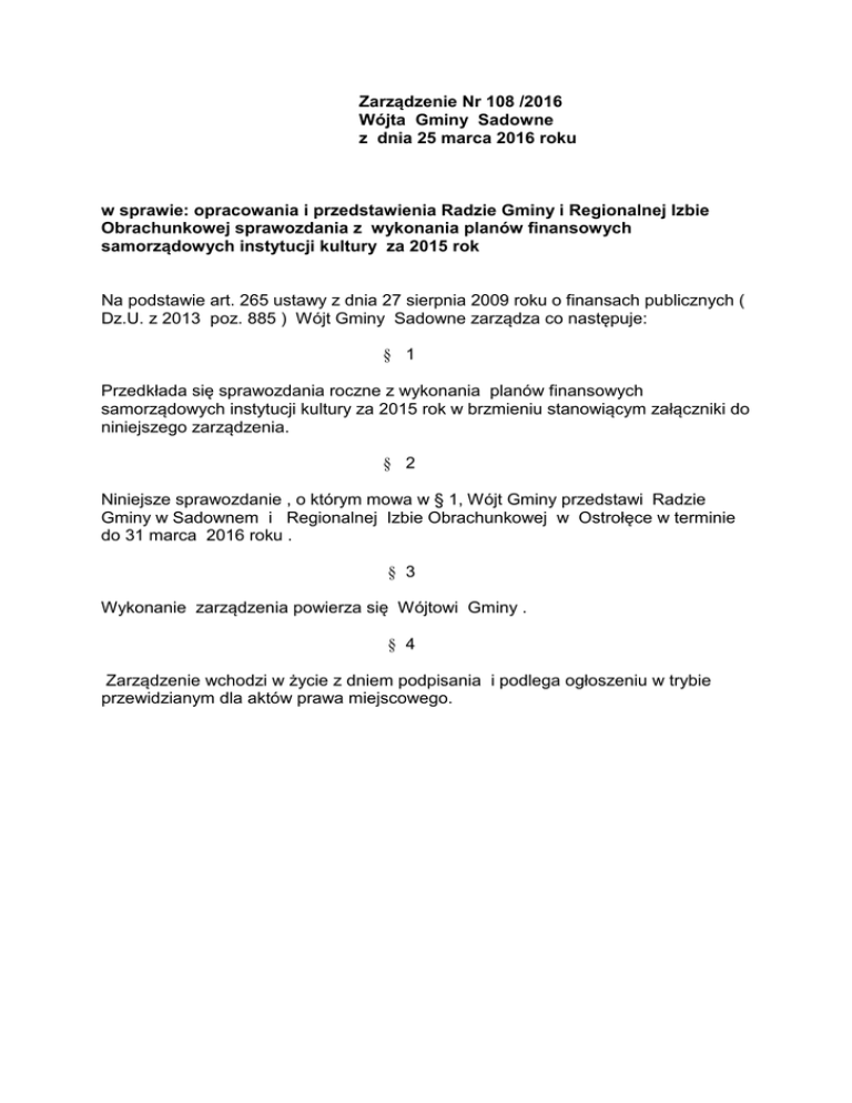 Zarządzenie Nr 108 /2016 Wójta Gminy Sadowne z dnia 25 marca