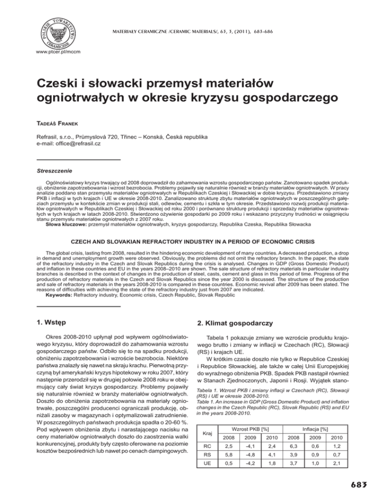 MATERIA£Y CERAMICZNE /CERAMIC MATERIALS/, 63, 3, (2011), 683-686 www.ptcer.pl/mccm Czeski i sáowacki przemysá materiaáów ogniotrwaáych w okresie kryzysu gospodarczego TADEÁŠ FRANEK Refrasil, s.r.o., PrĤmyslová 720, TĜinec – Konská, ýeská republika e-mail: of¿[email protected] Streszczenie OgólnoĞwiatowy kryzys trwający od 2008 doprowadziá do zahamowania wzrostu gospodarczego paĔstw. Zanotowano spadek produkcji, obniĪenie zapotrzebowania i wzrost bezrobocia. Problemy pojawiáy siĊ naturalnie równieĪ w branĪy materiaáów ogniotrwaáych. W pracy analizie poddano stan przemysáu materiaáów ogniotrwaáych w Republikach Czeskiej i Sáowackiej w dobie kryzysu. Przedstawiono zmiany PKB i inÀacji w tych krajach i UE w okresie 2008-2010. Zanalizowano strukturĊ zbytu materiaáów ogniotrwaáych w poszczególnych gaáĊziach przemysáu w kontekĞcie zmian w produkcji stali, odlewów, cementu i szkáa w tym okresie. Przedstawiono rozwój produkcji materiaáów ogniotrwaáych w Republikach Czeskiej i Sáowackiej od roku 2000 i porównano strukturĊ produkcji i sprzedaĪy materiaáów ogniotrwaáych w tych krajach w latach 2008-2010. Stwierdzono oĪywienie gospodarki po 2009 roku i wskazano przyczyny trudnoĞci w osiągniĊciu stanu przemysáu materiaáów ogniotrwaáych z 2007 roku. Sáowa kluczowe: przemysá materiaáów ogniotrwaáych, kryzys gospodarczy, Republika Czeska, Republika Sáowacka CZECH AND SLOVAKIAN REFRACTORY INDUSTRY IN A PERIOD OF ECONOMIC CRISIS The global crisis, lasting from 2008, resulted in the hindering economic development of many countries. A decreased production, a drop in demand and unemployment growth were observed. Obviously, the problems did not omit the refractory branch. In the paper, the state of the refractory industry in the Czech and Slovak Republics during the crisis is analysed. Changes in GDP (Gross Domestic Product) and inÀation in these countries and EU in the years 2008–2010 are shown. The sale structure of refractory materials in particular industry branches is described in the context of changes in the production of steel, casts, cement and glass in this period of time. Progress of the production of refractory materials in the Czech and Slovak Republics since the year 2000 is discussed. The structure of the production and sale of refractory materials in the years 2008-2010 is compared in these countries. Economic revival after 2009 has been stated. The reasons of dif¿culties with achieving the state of the refractory industry just from 2007 are indicated. Keywords: Refractory industry, Economic crisis, Czech Republic, Slovak Republic 1. WstĊp 2. Klimat gospodarczy Okres 2008-2010 upáynąá pod wpáywem ogólnoĞwiatowego kryzysu, który doprowadziá do zahamowania wzrostu gospodarczego paĔstw. Odbiáo siĊ to na spadku produkcji, obniĪeniu zapotrzebowania i wzroĞcie bezrobocia. Niektóre paĔstwa znalazáy siĊ nawet na skraju krachu. Pierwotną przyczyną byá amerykaĔski kryzys hipotekowy w roku 2007, który nastĊpnie przerodziá siĊ w drugiej poáowie 2008 roku w obejmujący caáy Ğwiat kryzys gospodarczy. Problemy pojawiáy siĊ naturalnie równieĪ w branĪy materiaáów ogniotrwaáych. Doszáo do obniĪenia zapotrzebowania na materiaáy ogniotrwaáe, poszczególni producenci ograniczali produkcjĊ, obniĪali zasoby w magazynach i optymalizowali zatrudnienie. W poszczególnych paĔstwach produkcja spadáa o 20-60 %. Pod wpáywem obniĪenia zbytu i narastającego nacisku na ceny materiaáów ogniotrwaáych doszáo do zaostrzenia walki konkurencyjnej, produkty byáy czĊsto oferowane na poziomie kosztów bezpoĞrednich lub nawet po cenach dampingowych. Tabela 1 pokazuje zmiany we wzroĞcie produktu krajowego brutto i zmiany w inÀacji w Czechach (RC), Sáowacji (RS) i krajach UE. W krótkim czasie doszáo nie tylko w Republice Czeskiej i Republice Sáowackiej, ale takĪe w caáej Unii Europejskiej do wyraĨnego obniĪenia PKB. Spadek PKB nastąpiá równieĪ w Stanach Zjednoczonych, Japonii i Rosji. Wyjątek stanoTabela 1. Wzrost PKB i zmiany inÀacji w Czechach (RC), Sáowacji (RS) i UE w okresie 2008-2010. Table 1. An increase in GDP (Gross Domestic Product) and inÀation changes in the Czech Republic (RC), Slovak Republic (RS) and EU in the years 2008-2010. Kraj Wzrost PKB [%] InÀacja [%] 2008 2009 2010 2008 2009 2010 RC 2,5 -4,1 2,4 6,3 0,6 1,2 RS 5,8 -4,8 4,1 3,9 0,9 0,7 UE 0,5 -4,2 1,8 3,7 1,0 2,1 683 T. FRANEK wiáy tylko Chiny i Indie, gdzie nawet w czasie gdy najwiĊksze Ğwiatowe gospodarki odczuwaáy skutki kryzysu notowano wzrost PKB. Spadkowi PKB towarzyszyáo obniĪenie inÀacji. Kraje wprowadziáy i realizowaáy wiele dziaáaĔ, Īeby minimalizowaü wpáyw kryzysu na ksztaátowanie siĊ wskaĨników gospodarczo-ekonomicznych. 3. ObniĪenie zapotrzebowania NajwaĪniejszym odbiorcą materiaáów ogniotrwaáych byá, jest i prawdopodobnie jeszcze dáugo pozostanie przemysá metalurgiczny związany z produkcją surówki i stali. Do pozostaáych odbiorców naleĪą odlewnie, produkcja cementu, szkáa, energetyka, przemysá ceramiczny, produkcja metali nieĪelaznych i inne gaáĊzie przemysáowe. Rys. 1 pokazuje strukturĊ zbytu materiaáów ogniotrwaáych w Republice Czeskiej (RC), Republice Sáowackiej (RS) i krajach UE. ObniĪenie produkcji stali i spadek produkcji w innych gaáĊziach przemysáu wpáynĊáy znacząco na zmniejszenie produkcji materiaáów ogniotrwaáych w poszczególnych krajach. W Tabeli 2 podano spadek produkcji stali, spadek produkcji w odlewnictwie, w przemyĞle cementowym i szklarskim w Czechach i Sáowacji. Tabela 2. Produkcja stali, odlewów, cementu i szkáa w Republice Czeskiej (RC) i Republice Sáowackiej (RS) w latach 2008-2009. Table 2. The production of steel, casts, cement and glass in the Czech Republic (RC) and Slovak Republic (RS) in the years 20082009. Produkcja RC RS 2008 2009 ¨ [%] 2008 2009 ¨ [%] Stal [kt] 6387 4594 -28 4489 3747 -17 Odlewy [kt] 513 310 -40