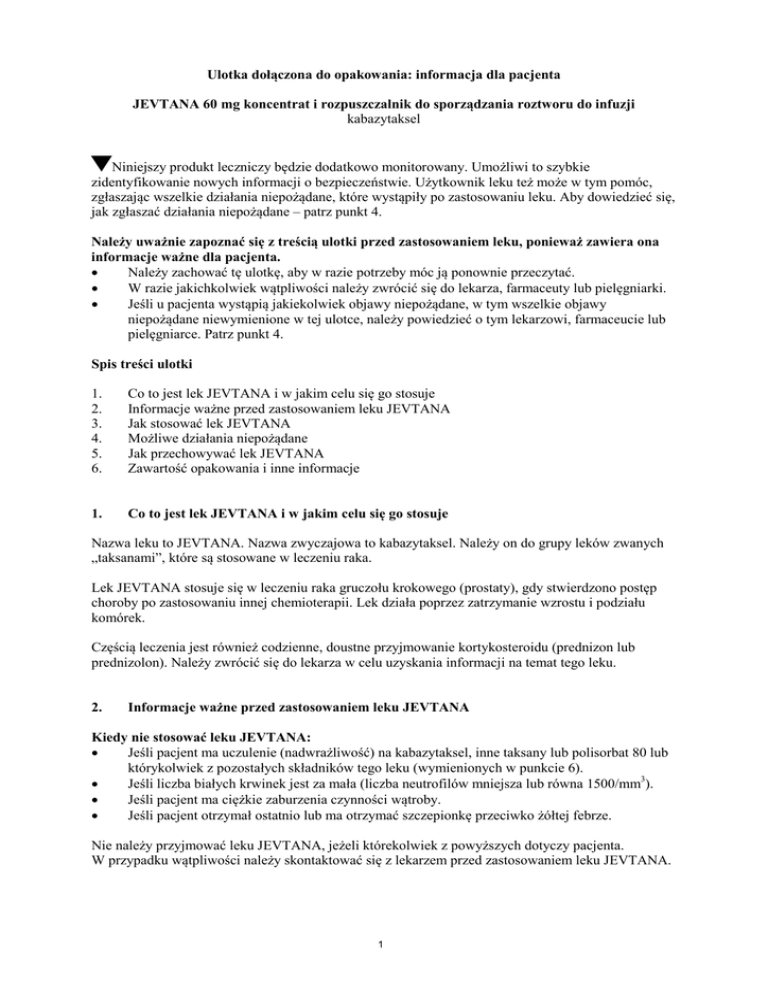 Ulotka dołączona do opakowania: informacja dla pacjenta JEVTANA 60 mg koncentrat i rozpuszczalnik do sporządzania roztworu do infuzji kabazytaksel Niniejszy produkt leczniczy będzie dodatkowo monitorowany. Umożliwi to szybkie zidentyfikowanie nowych informacji o bezpieczeństwie. Użytkownik leku też może w tym pomóc, zgłaszając wszelkie działania niepożądane, które wystąpiły po zastosowaniu leku. Aby dowiedzieć się, jak zgłaszać działania niepożądane – patrz punkt 4. Należy uważnie zapoznać się z treścią ulotki przed zastosowaniem leku, ponieważ zawiera ona informacje ważne dla pacjenta. • Należy zachować tę ulotkę, aby w razie potrzeby móc ją ponownie przeczytać. • W razie jakichkolwiek wątpliwości należy zwrócić się do lekarza, farmaceuty lub pielęgniarki. • Jeśli u pacjenta wystąpią jakiekolwiek objawy niepożądane, w tym wszelkie objawy niepożądane niewymienione w tej ulotce, należy powiedzieć o tym lekarzowi, farmaceucie lub pielęgniarce. Patrz punkt 4. Spis treści ulotki 1. 2. 3. 4. 5. 6. Co to jest lek JEVTANA i w jakim celu się go stosuje Informacje ważne przed zastosowaniem leku JEVTANA Jak stosować lek JEVTANA Możliwe działania niepożądane Jak przechowywać lek JEVTANA Zawartość opakowania i inne informacje 1. Co to jest lek JEVTANA i w jakim celu się go stosuje Nazwa leku to JEVTANA. Nazwa zwyczajowa to kabazytaksel. Należy on do grupy leków zwanych „taksanami”, które są stosowane w leczeniu raka. Lek JEVTANA stosuje się w leczeniu raka gruczołu krokowego (prostaty), gdy stwierdzono postęp choroby po zastosowaniu innej chemioterapii. Lek działa poprzez zatrzymanie wzrostu i podziału komórek. Częścią leczenia jest również codzienne, doustne przyjmowanie kortykosteroidu (prednizon lub prednizolon). Należy zwrócić się do lekarza w celu uzyskania informacji na temat tego leku. 2. Informacje ważne przed zastosowaniem leku JEVTANA Kiedy nie stosować leku JEVTANA: • Jeśli pacjent ma uczulenie (nadwrażliwość) na kabazytaksel, inne taksany lub polisorbat 80 lub którykolwiek z pozostałych składników tego leku (wymienionych w punkcie 6). • Jeśli liczba białych krwinek jest za mała (liczba neutrofilów mniejsza lub równa 1500/mm3). • Jeśli pacjent ma ciężkie zaburzenia czynności wątroby. • Jeśli pacjent otrzymał ostatnio lub ma otrzymać szczepionkę przeciwko żółtej febrze. Nie należy przyjmować leku JEVTANA, jeżeli którekolwiek z powyższych dotyczy pacjenta. W przypadku wątpliwości należy skontaktować się z lekarzem przed zastosowaniem leku JEVTANA. 1 Ostrzeżenia i środki ostrożności Przed każdym podaniem leku JEVTANA przeprowadza się badania krwi pacjenta, aby sprawdzić, czy liczba komórek krwi oraz czynność wątroby i nerek są odpowiednie do podania leku JEVTANA. Należy natychmiast poinformować lekarza w przypadku: • Wystąpienia gorączki. Podczas stosowania leku JEVTANA istnieje prawdopodobieństwo zmniejszenia liczby białych krwinek. Lekarz będzie badał krew i monitorował ogólny stan pacjenta w kierunku wystąpienia objawów zakażenia. Może także zlecić zastosowanie innych leków w celu utrzymania prawidłowej liczby białych krwinek. U pacjentów z niskimi parametrami morfologii krwi mogą pojawić się zakażenia zagrażające życiu. Najwcześniejszym objawem zakażenia może być gorączka, dlatego jeżeli wystąpi, należy natychmiast poinformować lekarza. • Wcześniejszego występowania jakichkolwiek uczuleń (alergii). Podczas stosowania leku JEVTANA mogą wystąpić ciężkie reakcje uczuleniowe. • Wystąpienia ciężkiej lub długotrwałej biegunki, nudności lub wymiotów. Wszystkie z wymienionych objawów mogą prowadzić do ciężkiego odwodnienia. Mogą także wymagać leczenia. • Uczucia drętwienia, mrowienia, pieczenia lub zmniejszenia czucia w dłoniach lub stopach. • Wystąpienia jakiegokolwiek krwawienia z jelit, zmiany zabarwienia stolca lub bólu brzucha. Jeśli krwawienie lub ból są ciężkie, lekarz zakończy leczenie lekiem JEVTANA. Wynika to z tego, że lek JEVTANA może zwiększać ryzyko krwawień lub przedziurawienia ściany jelit. • Zaburzeń nerek. • Zaburzeń wątroby występujących podczas leczenia. • Znacznego zwiększenia lub zmniejszenia objętości moczu wydalanego w ciągu doby. Należy natychmiast poinformować lekarza, jeżeli którekolwiek z powyższych dotyczy pacjenta. Lekarz może zmniejszyć dawkę leku JEVTANA albo przerwać leczenie. JEVTANA a inne leki Należy powiedzieć lekarzowi, farmaceucie lub pielęgniarce o wszystkich przyjmowanych przez pacjenta obecnie lub ostatnio lekach, również tych, które wydawane są bez recepty. Wynika to stąd, że niektóre leki mogą wpływać na działanie leku JEVTANA albo lek JEVTANA może wpływać na działanie innych leków. Dotyczy to następujących leków: ketokonazol, ryfampicyna (leki stosowane w leczeniu zakażeń); karbamazepina, fenobarbital lub fenytoina (leki stosowane w leczeniu drgawek); ziele dziurawca zwyczajnego (Hypericum perforatum) (ziołowy lek na depresję i inne stany); statyny (jak na przykład symwastatyna, lowastatyna, atorwastatyna, rosuwastatyna lub prawastatyna) (leki obniżające stężenie cholesterolu we krwi); walsartan (lek stosowany w leczeniu nadciśnienia); repaglinid (lek stosowany w leczeniu cukrzycy). Przed poddaniem się szczepieniom, należy poinformować lekarza o przyjmowaniu leku JEVTANA. Ciąża, karmienie piersią i wpływ na płodność Leku JEVTANA nie powinny stosować kobiety w ciąży oraz kobiety w wieku rozrodczym, które nie stosują antykoncepcji. Nie należy stosować leku JEVTANA podczas karmienia piersią. 2 Pacjent powinien używać prezerwatyw podczas stosunków płciowych, jeżeli jego partnerka jest w ciąży lub może zajść w ciążę. Lek JEVTANA może być obecny w nasieniu i może wpływać na płód. Pacjenci przyjmujący lek JEVTANA nie powinni zo