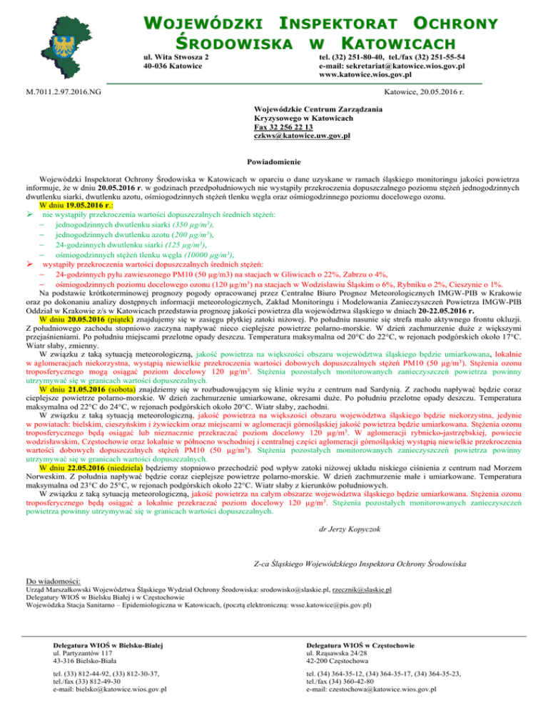 WOJEWÓDZKI INSPEKTORAT OCHRONY ŚRODOWISKA W KATOWICACH ul. Wita Stwosza 2 40-036 Katowice tel. (32) 251-80-40, tel./fax (32) 251-55-54 e-mail: [email protected] www.katowice.wios.gov.pl M.7011.2.97.2016.NG Katowice, 20.05.2016 r. Wojewódzkie Centrum Zarządzania Kryzysowego w Katowicach Fax 32 256 22 13 [email protected] Powiadomienie Wojewódzki Inspektorat Ochrony Środowiska w Katowicach w oparciu o dane uzyskane w ramach śląskiego monitoringu jakości powietrza informuje, że w dniu 20.05.2016 r. w godzinach przedpołudniowych nie wystąpiły przekroczenia dopuszczalnego poziomu stężeń jednogodzinnych dwutlenku siarki, dwutlenku azotu, ośmiogodzinnych stężeń tlenku węgla oraz ośmiogodzinnego poziomu docelowego ozonu. W dniu 19.05.2016 r.: nie wystąpiły przekroczenia wartości dopuszczalnych średnich stężeń: jednogodzinnych dwutlenku siarki (350 µg/m3), jednogodzinnych dwutlenku azotu (200 µg/m3), 24-godzinnych dwutlenku siarki (125 µg/m3), ośmiogodzinnych stężeń tlenku węgla (10000 µg/m3), wystąpiły przekroczenia wartości dopuszczalnych średnich stężeń: 24-godzinnych pyłu zawieszonego PM10 (50 µg/m3) na stacjach w Gliwicach o 22%, Zabrzu o 4%, ośmiogodzinnych poziomu docelowego ozonu (120 µg/m3) na stacjach w Wodzisławiu Śląskim o 6%, Rybniku o 2%, Cieszynie o 1%. Na podstawie krótkoterminowej prognozy pogody opracowanej przez Centralne Biuro Prognoz Meteorologicznych IMGW-PIB w Krakowie oraz po dokonaniu analizy dostępnych informacji meteorologicznych, Zakład Monitoringu i Modelowania Zanieczyszczeń Powietrza IMGW-PIB Oddział w Krakowie z/s w Katowicach przedstawia prognozę jakości powietrza dla województwa śląskiego w dniach 20-22.05.2016 r. W dniu 20.05.2016 (piątek) znajdujemy się w zasięgu płytkiej zatoki niżowej. Po południu nasunie się strefa mało aktywnego frontu okluzji. Z południowego zachodu stopniowo zaczyna napływać nieco cieplejsze powietrze polarno-morskie. W dzień zachmurzenie duże z większymi przejaśnieniami. Po południu miejscami przelotne opady deszczu. Temperatura maksymalna od 20°C do 22°C, w rejonach podgórskich około 17°C. Wiatr słaby, zmienny. W związku z taką sytuacją meteorologiczną, jakość powietrza na większości obszaru województwa śląskiego będzie umiarkowana, lokalnie w aglomeracjach niekorzystna, wystąpią niewielkie przekroczenia wartości dobowych dopuszczalnych stężeń PM10 (50 µg/m3). Stężenia ozonu troposferycznego mogą osiągać poziom docelowy 120 µg/m3. Stężenia pozostałych monitorowanych zanieczyszczeń powietrza powinny utrzymywać się w granicach wartości dopuszczalnych. W dniu 21.05.2016 (sobota) znajdziemy się w rozbudowującym się klinie wyżu z centrum nad Sardynią. Z zachodu napływać będzie coraz cieplejsze powietrze polarno-morskie. W dzień zachmurzenie umiarkowane, okresami duże. Po południu przelotne opady deszczu. Temperatura maksymalna od 22°C do 24°C, w rejonach podgórskich około 20°C. Wiatr słaby, zachodni. W związku z taką sytuacją meteorologiczną, jakość powietrza na większości obszaru województwa śląskiego będzie niekorzystna, jedynie w powiatach: bielskim, cieszyńskim i żywieckim oraz miejscami w aglomeracji górnośląskiej jakość powietrza będzie umiarkowana. Stężenia ozonu troposferycznego będą osiągać lub nieznacznie przekraczać poziom docelowy 120 µg/m3. W aglomeracji rybnicko-jastrzębskiej, powiecie wodzisławskim, Częstochowie oraz lokalnie w północno wschodniej i centralnej części aglomeracji górnośląskiej wystąpią niewielkie przekroczenia wartości dobowych dopuszczalnych stężeń PM10 (50 µg/m3). Stężenia pozostałych monitorowanych zanieczyszczeń powietrza powinny utrzymywać się w granicach wartości dopuszczalnych. W dniu 22.05.2016 (niedziela) będziemy stopniowo przechodzić pod wpływ zatoki niżowej układu niskiego ciśnienia z centrum nad Morzem Norweskim. Z południa napływać będzie coraz cieplejsze powietrze polarno-morskie. W dzień zachmurzenie małe i umiarkowane. Temperatura maksymalna od 23°C do 25°C, w rejonach podgórskich około 22°C. Wiatr słaby z kierunków południowych. W związku z taką sytuacją meteorologiczną, jakość powietrza na całym obszarze województwa śląskiego będzie umiarkowana. Stężenia ozonu troposferycznego będą osiągać a lokalnie przekraczać poziom docelowy 120 µg/m3. Stężenia pozostałych monitorowanych zanieczyszczeń powietrza powinny utrzymywać się w granicach wartości dopuszczalnych. dr Jerzy Kopyczok Z-ca Śląskiego Wojewódzkiego Inspektora Ochrony Środowiska Do wiadomości: Urząd Marszałkowski Województwa Śląskiego Wydział Ochrony Środowiska: [email protected], [email protected] Delegatury WIOŚ w Bielsku Białej i w Częstochowie Wojewódzka Stacja Sanitarno – Epidemiologiczna w Katowicach, (pocztą elektroniczną: [email protected]) Delegatura WIOŚ w Bielsku-Białej ul. Partyzantów 117 43-316 Bielsko-Biała Delegatura WIOŚ w Częstochowie ul. Rząsawska 24/28 42-200 Częstochowa tel. (33) 812-44-92, (33) 812-30-37, tel./fax (33) 812-49-30 e-mail: [email protected] tel. (34) 364-35-12, (34) 364-35-17, (34) 364-35-23, tel./fax (34) 360-42-80 e-mail: [email protected]
