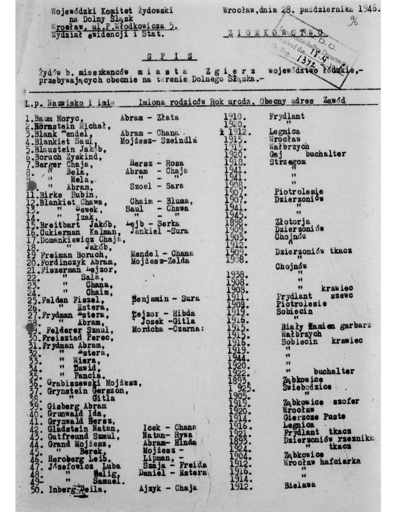 Woje*<5dzki Komitet /,ydo*ski na Dclny SL-*sk ro 8* aw jjd.JL^todko* i cza_ ji.. V.'ylziat e^idancji 1 Stat. *roclaw,dnia 28, pa-dzierniK*. l:4o • \ • - 9 f I S frttfi b. miesakancli m i a s t a Z g i e r a w o j e w ' d s ^ £3&*kLe,przeby*ajn.cych obecnie na t renie Dolnego S2>iuka.^ v ^ / L.p. liaaisko i imi • Imiona rodzicdw Kok urodz. Obecny udres Abram - Ziata l.Baum Moryc, k.Bernstein Hitkml, Abram - Ghana 3.Blank t a d t l , MojzeszSzeindla 4.Blankiet Saul. J.Bkustein Jak*b, o.Boruch Zyskind, iiersz - Rosa 7.Berger Chaja, Abram - Chaja 8. , * Mi, M 1920. i 1912. Frydlant u Legnica Wroclaw v.atbrzych Gaj buchalter Strzeeom H M M Szoel - Sara " Mela, JP. " Abram, Chaim Bluma, ll.Birke Rubin, Chawa Saul 12.Blankiet Chawa, w M 13. ^ewek, 1A " Izak 15.*Breitbart Jakdb, ^ejb - Serka lb.Cukierman Kalman, Jankiel -Sura 17.Domankiewica Chaja, Mendel - Chana 18. " «Jako*b, Mojzesz-Zelda 19 Freiman Boruch, 20.Fordinczyk Abram, 21.ii,iszerman ±*ejzor, B 22. Sala, 23. " Chana, 2A. " Ohaim, Benjamin - Sura 25.Felden ifiszel, 2b. " iistera, fiejzoi - Hibda 27.Frydman *stera, ' Josek -Gitla A8. " Abram, Mordcha -Czarna: W . Felderer Szmul, 30.Preisztad Perec, Bl.Frydman Abram, 32. " *stera, 33. • sHiera, " flaw i d , " Pancia. Grabisaewski Mojzesz, 36. Grynstein Qerszon, 37. 58. " Oitla 39. Gisberg Abram 40. Grunwald Ida, 41. Grynwald Hersa, leek - Chana 42. Gladstein Natan, Hatan- Rywa 43. Gutfreund Szmul, Abram- fiinda 44. Grand Mojzesa, Mojzesz « Berek, Lipman, • . Horcberg Leib. Saaja - Frei&a 7. J^aefowica^ Luba Daniel - iistera lelig. & " . Samuel. Ajayk - Chaja Inberglgeila, 4' mo. Zaw^d Piotrolesie Dzierzoni<5« f« H Zlotorja Bzierzoniow Chojnfo Dzierzoni^^ tkacz »t Chojn<5w 1938. 1908. M • kra* ieo Frydlant szewc Piotroiesie Sobiecin »« 191! Bialy lamien garbarz ..atbrzych Sobiecin krawiec M M n " buchalter Za.bkow ice Swiebcdaice Zabkowice saofer Wroclaw Gieizcze Paste Legnica Frydlant tkaca . Daieracni6i ratambc • tkaca ^bkowioa Wroclaw hafoiarka M Bielawa II. 1.. 1M. i. ( Zgierz ) L Kaftan S a l a , Aron-Szeindla Krysztai P i n i a , Benjamin - G i t l a Kleiman Paulina, Chaim - Tauba i'aubj -Bajla Henoch Kohn Jolf, -Malka Rachela, Noach -Ruchla Szyja Kodska Jenta. Zajnwel Kohn Juda, Xadyszx Sala, - Fula f* Kohn Chaja Xadysz Necha, Liberman Leib Szymon - Hachela Leib i.eronika TIeuman Gitla . Kadysz - ftywka M Abram - Ruchla Leib M Leib Szmul - Gitla uv« fi M Kadysz - Symciia Okno Irymezaa Jakub Gitla Izraei - Meclia Praszkier Hers a Przytyk Jakub Dawid - kindla Pomeranc Jakub leek - Laia Pelcer Cypora Mosze - Patera " Dawid ii _ ti ?erelman l i r a , Miron - . " Jakrtb, Szymon4eleJaltfb " HODT.il, Radomski Benjamin, I z r a c l - Blima Kachwalski J o e l , Szuli-m- Dwojra Podzynek Sala, Rotapfel ilenek, Szymon -Helena Sieradzki Abram, Cnaim -Dwojra Sochaczewaki J<5zaf, Zalnwel-Roza " R<4a, J<5zef•izyndler Henia, JonasSzarfstein Abram, Slodkiericz Hersz. Trojan ow ski Miohal, Zyskind*v<einberg Szymon, Jak^b » Violkowicz Ignacy, i.enrych Natalja, Grzegora-Pesa aid Sender, fcejb -Liba Zelcer ^achraiel. Hersa - Chana Frydlant Sv,idnica N N Frydlant Wroclaw v Jaw or Ezierzoniow n II II Wroclaw II Sobiecin szklarz II Swidnica S wychoAawcz. zegarmi st ra II II Bielawa VI ro claw szkladrz Yfalbrzyoh tkaez Frydlant Dzieraoni(5w krawiec Wroclaw »t Vial branch Zubkow ice Zgor zelice Frydlant « Wroclaw Strzegom Legnica urzednik Generalny, Sekretarz ( Turkow . - |i*ln) kaawiec nauczyciel II .7 ( MarbachT 31 Bov.a SSI roctaw Bielawa Strzegom u: Kierownik wydaialu aw id. i ia. JL. l«sk i -