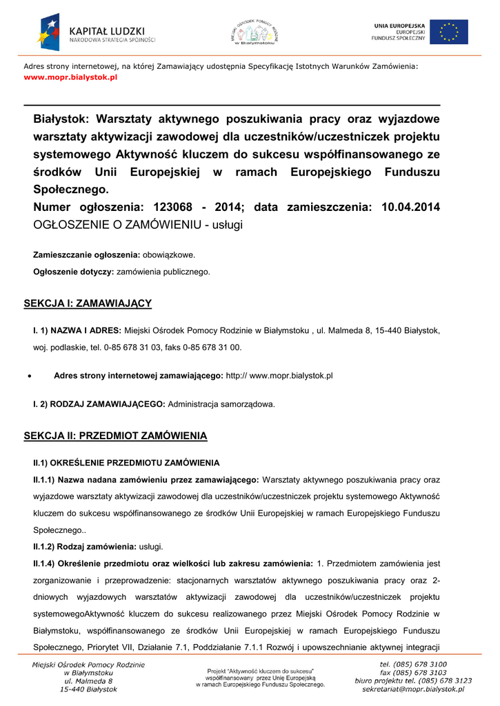 Adres strony internetowej, na której Zamawiający udostępnia Specyfikację Istotnych Warunków Zamówienia: www.mopr.bialystok.pl Białystok: Warsztaty aktywnego poszukiwania pracy oraz wyjazdowe warsztaty aktywizacji zawodowej dla uczestników/uczestniczek projektu systemowego Aktywność kluczem do sukcesu współfinansowanego ze środków Unii Europejskiej w ramach Europejskiego Funduszu Społecznego. Numer ogłoszenia: 123068 - 2014; data zamieszczenia: 10.04.2014 OGŁOSZENIE O ZAMÓWIENIU - usługi Zamieszczanie ogłoszenia: obowiązkowe. Ogłoszenie dotyczy: zamówienia publicznego. SEKCJA I: ZAMAWIAJĄCY I. 1) NAZWA I ADRES: Miejski Ośrodek Pomocy Rodzinie w Białymstoku , ul. Malmeda 8, 15-440 Białystok, woj. podlaskie, tel. 0-85 678 31 03, faks 0-85 678 31 00. Adres strony internetowej zamawiającego: http:// www.mopr.bialystok.pl I. 2) RODZAJ ZAMAWIAJĄCEGO: Administracja samorządowa. SEKCJA II: PRZEDMIOT ZAMÓWIENIA II.1) OKREŚLENIE PRZEDMIOTU ZAMÓWIENIA II.1.1) Nazwa nadana zamówieniu przez zamawiającego: Warsztaty aktywnego poszukiwania pracy oraz wyjazdowe warsztaty aktywizacji zawodowej dla uczestników/uczestniczek projektu systemowego Aktywność kluczem do sukcesu współfinansowanego ze środków Unii Europejskiej w ramach Europejskiego Funduszu Społecznego.. II.1.2) Rodzaj zamówienia: usługi. II.1.4) Określenie przedmiotu oraz wielkości lub zakresu zamówienia: 1. Przedmiotem zamówienia jest zorganizowanie i przeprowadzenie: stacjonarnych warsztatów aktywnego poszukiwania pracy oraz 2dniowych wyjazdowych warsztatów aktywizacji zawodowej dla uczestników/uczestniczek projektu systemowegoAktywność kluczem do sukcesu realizowanego przez Miejski Ośrodek Pomocy Rodzinie w Białymstoku, współfinansowanego ze środków Unii Europejskiej w ramach Europejskiego Funduszu Społecznego, Priorytet VII, Działanie 7.1, Poddziałanie 7.1.1 Rozwój i upowszechnianie aktywnej integracji przez ośrodki pomocy społecznej, podzielony na dwie części (pakiety): - Pakiet Nr 1 - warsztaty aktywnego poszukiwania pracy dla 323 osób bezrobotnych, w tym długotrwale bezrobotnych, nieaktywnych zawodowo, Pakiet Nr 2 - 2-dniowe wyjazdowe warsztaty aktywizacji zawodowej dla 30 osób w wieku od 15 do 25 lat, nieaktywnych zawodowo, uczących się lub kształcących się, wychowanków placówek opiekuńczowychowawczych lub rodzin zastępczych lub pochodzących z rodzin naturalnych. 2.ZAŁOŻENIA WSPÓLNE: 1)Warsztaty powinny być prowadzone przez wykładowców posiadających odpowiednie kwalifikacje i doświadczenie w prowadzeniu zajęć objętych przedmiotem zamówienia, 2)W ramach realizacji przedmiotu zamówienia Wykonawca zobowiązany będzie do: a)organizacji warsztatów, tzn. zapewnienia bezpiecznych i higienicznych warunków pracy i nauki, w tym zapewnienia sal szkoleniowych dostosowanych do ilości szkolonych osób, tj. przystosowanych do prowadzenia zajęć dla grup odpowiednio 22, 21 i 15-osobowych, przestronnych, o powierzchni min. 40 m2, odpowiednio oświetlonych, klimatyzowanych lub minimum wentylowanych, wyposażonych w co najmniej 1 tablicę standardową lub tablicę flipchart, rzutnik multimedialny, laptop, ekran, flipcharty, stoły, krzesła, w których będą zapewnione właściwe warunki bhp i p.poż. oraz zaplecze socjalne, w tym dostęp do WC zaopatrzonego w środki higieny. Warsztaty dla wszystkich grup, powinny odbywać się w jednym budynku. W przypadku korzystania z kilku różnych sal w harmonogramie warsztatów należy wskazać numery sal, w których realizowane będą zajęcia. b)zapewnienia wyżywienia uczestnikom i uczestniczkom warsztatów w formie obiadów i poczęstunku w trakcie przerw kawowych, w miejscu przeprowadzania warsztatów, c) zapewnienie uczestnikom i uczestniczkom warsztatów stacjonarnych biletów komunikacji miejskiej upoważniających do korzystania ze zbiorowej komunikacji miejskiej na terenie miasta Białegostoku, na przejazd z miejsca zamieszkania do miejsca odbywania się warsztatów i z powrotem, d) zapewnienia materiałów szkoleniowych odpowiadających programowi warsztatów. Wykonawca przekaże po jednym egzemplarzu w/w materiałów szkoleniowych uczestnikom i uczestniczkom warsztatów oraz Zamawiającemu, e) zapewnienia nadzoru nad organizacją warsztatów i realizacją programu merytorycznego, celem podniesienia jakości organizowanych warsztatów. Wykonawca zobowiązany będzie do wyznaczenia osoby do pełnienia w/w nadzoru, która będzie obecna w miejscu przeprowadzania warsztatów, przez cały okres realizacji zamówienia z zastrzeżeniem, że osobą pełniącą nadzór nie może być osoba prowadząca warsztaty. f) przeprowadzenia warsztatów aktywnego poszukiwania pracy i 2-dniowych wyjazdowych warsztatów aktywizacji zawodowej, zgodnie z programem Zamawiającego, określonym w pkt. 5 niniejszej specyfikacji istotnych warunków zamówienia, g) ustalenia, po konsultacjach z Zamawiającym, harmonogramu zajęć i przekazania go Zamawiającemu przed rozpoczęciem zajęć. Wykonawca przed rozpoczęciem warsztatów zapozna uczestników i uczestniczki z ich szczegółowym zakresem tematycznym i przekaże im harmonogram realizowanych zajęć, h) przeprowadzenia ankiety oceniającej warsztaty wśród ich uczestników/uczestniczek w ostatnim dniu trwania zajęć i sporządzenia raportu zbiorczego, 3)Wykonawca zobowiązany będzie do oznaczania pomieszczeń, w których realizowany będzie projekt, materiałów szkoleniowych i innej dokumentacji zgodnie z Wytycznymi dotyczącymi oznaczania projektów w ramach Programu Operacyjnego Kapitał Ludzki z dnia 31 grudnia 2013r., wydanych przez Ministerstwo Infrastruktury i Rozwoju, zamieszczanymi na stronie internetowej: www.efs.gov.pl lub www.mrr.gov.pl lub www.funduszeeuropejskie.gov.pl. Budynek i sale szkoleniowe powinny być oznakowane informacją o nazwie warsztatów , czasie trwania, numerze sali, w której będą odbywać się zajęcia i nazwie projektu zgodnie z wytycznymi.