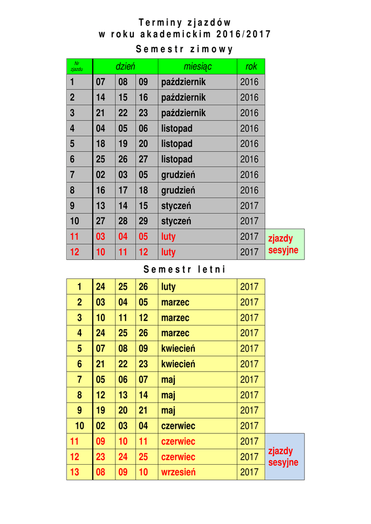 Terminy zjazdów w roku akademickim 2016/2017 Semestr zimowy Nr zjazdu dzień miesiąc rok 1 07 08 09 październik 2016 2 14 15 16 październik 2016 3 21 22 23 październik 2016 4 04 05 06 listopad 2016 5 18 19 20 listopad 2016 6 25 26 27 listopad 2016 7 02 03 05 grudzień 2016 8 16 17 18 grudzień 2016 9 13 14 15 styczeń 2017 10 27 28 29 styczeń 2017 11 03 04 05 luty 12 10 11 12 luty 2017 zjazdy 2017 sesyjne Semestr letni 1 24 25 26 luty 2017 2 03 04 05 marzec 2017 3 10 11 12 marzec 2017 4 24 25 26 marzec 2017 5 07 08 09 kwiecień 2017 6 21 22 23 kwiecień 2017 7 05 06 07 maj 2017 8 12 13 14 maj 2017 9 19 20 21 maj 2017 10 02 03 04 czerwiec 2017 11 09 10 11 czerwiec 2017 12 23 24 25 czerwiec 2017 13 08 09 10 wrzesień 2017 zjazdy sesyjne