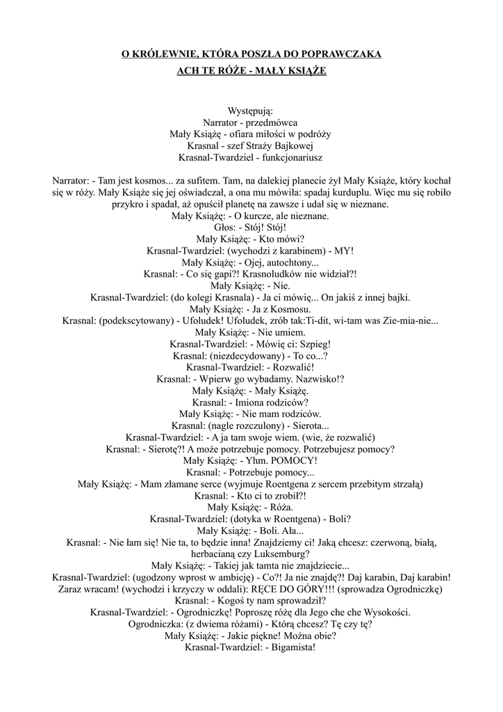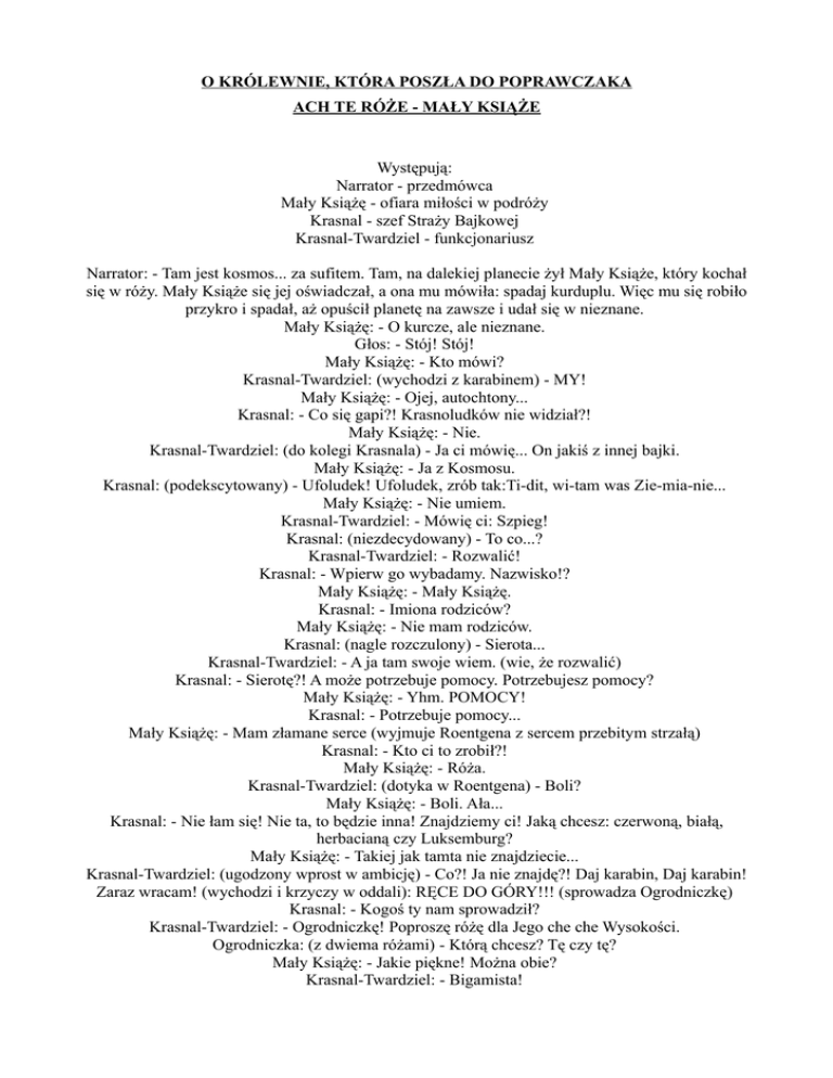 O KRÓLEWNIE, KTÓRA POSZŁA DO POPRAWCZAKA ACH TE RÓŻE - MAŁY KSIĄŻE Występują: Narrator - przedmówca Mały Książę - ofiara miłości w podróży Krasnal - szef Straży Bajkowej Krasnal-Twardziel - funkcjonariusz Narrator: - Tam jest kosmos... za sufitem. Tam, na dalekiej planecie żył Mały Książe, który kochał się w róży. Mały Książe się jej oświadczał, a ona mu mówiła: spadaj kurduplu. Więc mu się robiło przykro i spadał, aż opuścił planetę na zawsze i udał się w nieznane. Mały Książę: - O kurcze, ale nieznane. Głos: - Stój! Stój! Mały Książę: - Kto mówi? Krasnal-Twardziel: (wychodzi z karabinem) - MY! Mały Książę: - Ojej, autochtony... Krasnal: - Co się gapi?! Krasnoludków nie widział?! Mały Książę: - Nie. Krasnal-Twardziel: (do kolegi Krasnala) - Ja ci mówię... On jakiś z innej bajki. Mały Książę: - Ja z Kosmosu. Krasnal: (podekscytowany) - Ufoludek! Ufoludek, zrób tak:Ti-dit, wi-tam was Zie-mia-nie... Mały Książę: - Nie umiem. Krasnal-Twardziel: - Mówię ci: Szpieg! Krasnal: (niezdecydowany) - To co...? Krasnal-Twardziel: - Rozwalić! Krasnal: - Wpierw go wybadamy. Nazwisko!? Mały Książę: - Mały Książę. Krasnal: - Imiona rodziców? Mały Książę: - Nie mam rodziców. Krasnal: (nagle rozczulony) - Sierota... Krasnal-Twardziel: - A ja tam swoje wiem. (wie, że rozwalić) Krasnal: - Sierotę?! A może potrzebuje pomocy. Potrzebujesz pomocy? Mały Książę: - Yhm. POMOCY! Krasnal: - Potrzebuje pomocy... Mały Książę: - Mam złamane serce (wyjmuje Roentgena z sercem przebitym strzałą) Krasnal: - Kto ci to zrobił?! Mały Książę: - Róża. Krasnal-Twardziel: (dotyka w Roentgena) - Boli? Mały Książę: - Boli. Ała... Krasnal: - Nie łam się! Nie ta, to będzie inna! Znajdziemy ci! Jaką chcesz: czerwoną, białą, herbacianą czy Luksemburg? Mały Książę: - Takiej jak tamta nie znajdziecie... Krasnal-Twardziel: (ugodzony wprost w ambicję) - Co?! Ja nie znajdę?! Daj karabin, Daj karabin! Zaraz wracam! (wychodzi i krzyczy w oddali): RĘCE DO GÓRY!!! (sprowadza Ogrodniczkę) Krasnal: - Kogoś ty nam sprowadził? Krasnal-Twardziel: - Ogrodniczkę! Poproszę różę dla Jego che che Wysokości. Ogrodniczka: (z dwiema różami) - Którą chcesz? Tę czy tę? Mały Książę: - Jakie piękne! Można obie? Krasnal-Twardziel: - Bigamista! Mały Książę: - Cicho... Ogrodniczka: - O, mam jeszcze tysiąc równie pięknych. Krasnal-Twardziel: - Poligamista! Mały Książę: - Uuuu. Jakże wybrać spośród tysiąca?... (wyjmuje olejnego Roentgena z sercem przebitym tysiącem strzał) Krasnal-Twardziel: - Bądź mężczyzną: po kolei - kochaj i rzucaj!!! Mały Książę: - Nie mogę! Wiesz co:rooozwal mnie... Krasnal-Twardziel: (z politowaniem) - Ojej tylko nie rycz! Krasnal: - Mam lepszy pomysł. Bierzmy te róże i frrru na tourne po Kosmosie: Mały Książe! Prawdziwe Krasnoludki! i bezpruderyjne róże do towarzystwa! Koniec bajki i pięknych złudzeń Autorzy: Dariusz Kamys, Władysław Sikora