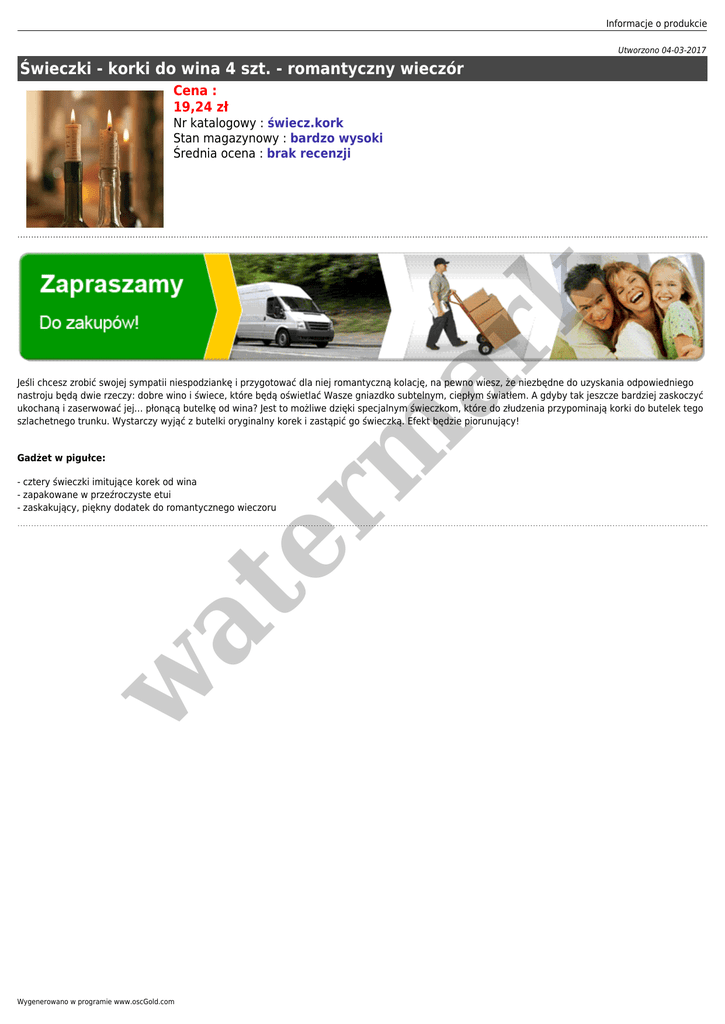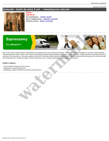 Informacje o produkcie Utworzono 04-03-2017 Świeczki - korki do wina 4 szt. - romantyczny wieczór Cena : 19,24 zł er m ar k Nr katalogowy : świecz.kork Stan magazynowy : bardzo wysoki Średnia ocena : brak recenzji Jeśli chcesz zrobić swojej sympatii niespodziankę i przygotować dla niej romantyczną kolację, na pewno wiesz, że niezbędne do uzyskania odpowiedniego nastroju będą dwie rzeczy: dobre wino i świece, które będą oświetlać Wasze gniazdko subtelnym, ciepłym światłem. A gdyby tak jeszcze bardziej zaskoczyć ukochaną i zaserwować jej… płonącą butelkę od wina? Jest to możliwe dzięki specjalnym świeczkom, które do złudzenia przypominają korki do butelek tego szlachetnego trunku. Wystarczy wyjąć z butelki oryginalny korek i zastąpić go świeczką. Efekt będzie piorunujący! Gadżet w pigułce: w at - cztery świeczki imitujące korek od wina - zapakowane w przeźroczyste etui - zaskakujący, piękny dodatek do romantycznego wieczoru Wygenerowano w programie www.oscGold.com