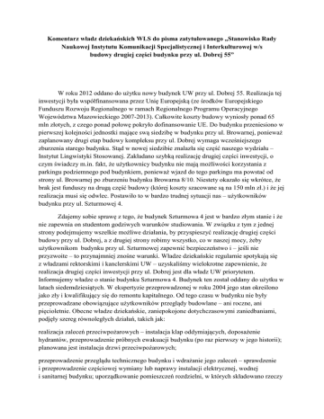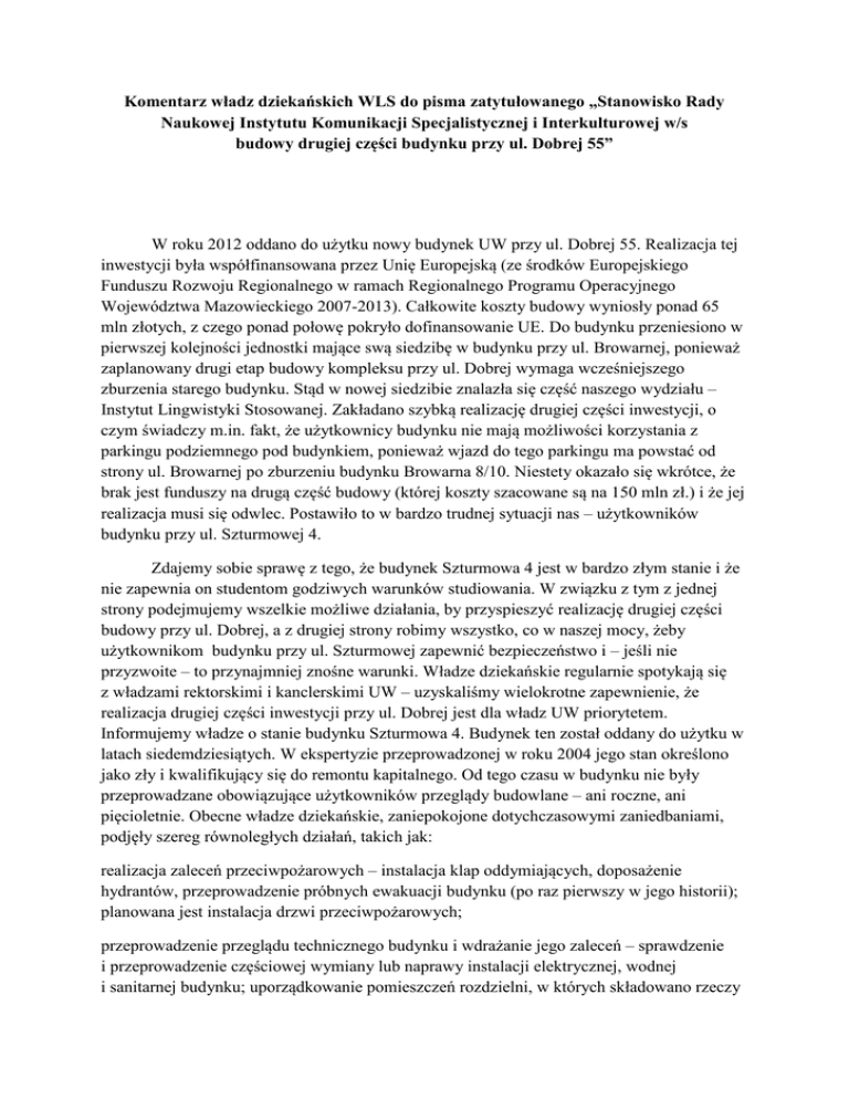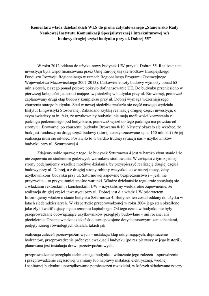 Komentarz władz dziekańskich WLS do pisma zatytułowanego „Stanowisko Rady Naukowej Instytutu Komunikacji Specjalistycznej i Interkulturowej w/s budowy drugiej części budynku przy ul. Dobrej 55” W roku 2012 oddano do użytku nowy budynek UW przy ul. Dobrej 55. Realizacja tej inwestycji była współfinansowana przez Unię Europejską (ze środków Europejskiego Funduszu Rozwoju Regionalnego w ramach Regionalnego Programu Operacyjnego Województwa Mazowieckiego 2007-2013). Całkowite koszty budowy wyniosły ponad 65 mln złotych, z czego ponad połowę pokryło dofinansowanie UE. Do budynku przeniesiono w pierwszej kolejności jednostki mające swą siedzibę w budynku przy ul. Browarnej, ponieważ zaplanowany drugi etap budowy kompleksu przy ul. Dobrej wymaga wcześniejszego zburzenia starego budynku. Stąd w nowej siedzibie znalazła się część naszego wydziału – Instytut Lingwistyki Stosowanej. Zakładano szybką realizację drugiej części inwestycji, o czym świadczy m.in. fakt, że użytkownicy budynku nie mają możliwości korzystania z parkingu podziemnego pod budynkiem, ponieważ wjazd do tego parkingu ma powstać od strony ul. Browarnej po zburzeniu budynku Browarna 8/10. Niestety okazało się wkrótce, że brak jest funduszy na drugą część budowy (której koszty szacowane są na 150 mln zł.) i że jej realizacja musi się odwlec. Postawiło to w bardzo trudnej sytuacji nas – użytkowników budynku przy ul. Szturmowej 4. Zdajemy sobie sprawę z tego, że budynek Szturmowa 4 jest w bardzo złym stanie i że nie zapewnia on studentom godziwych warunków studiowania. W związku z tym z jednej strony podejmujemy wszelkie możliwe działania, by przyspieszyć realizację drugiej części budowy przy ul. Dobrej, a z drugiej strony robimy wszystko, co w naszej mocy, żeby użytkownikom budynku przy ul. Szturmowej zapewnić bezpieczeństwo i – jeśli nie przyzwoite – to przynajmniej znośne warunki. Władze dziekańskie regularnie spotykają się z władzami rektorskimi i kanclerskimi UW – uzyskaliśmy wielokrotne zapewnienie, że realizacja drugiej części inwestycji przy ul. Dobrej jest dla władz UW priorytetem. Informujemy władze o stanie budynku Szturmowa 4. Budynek ten został oddany do użytku w latach siedemdziesiątych. W ekspertyzie przeprowadzonej w roku 2004 jego stan określono jako zły i kwalifikujący się do remontu kapitalnego. Od tego czasu w budynku nie były przeprowadzane obowiązujące użytkowników przeglądy budowlane – ani roczne, ani pięcioletnie. Obecne władze dziekańskie, zaniepokojone dotychczasowymi zaniedbaniami, podjęły szereg równoległych działań, takich jak: realizacja zaleceń przeciwpożarowych – instalacja klap oddymiających, doposażenie hydrantów, przeprowadzenie próbnych ewakuacji budynku (po raz pierwszy w jego historii); planowana jest instalacja drzwi przeciwpożarowych; przeprowadzenie przeglądu technicznego budynku i wdrażanie jego zaleceń – sprawdzenie i przeprowadzenie częściowej wymiany lub naprawy instalacji elektrycznej, wodnej i sanitarnej budynku; uporządkowanie pomieszczeń rozdzielni, w których składowano rzeczy uznane za niepotrzebne, co stanowiło zagrożenie pożarowe; przeprowadzenie pomiaru czystości powietrza pod kątem zanieczyszczenia włóknami azbestu (poprzednie pomiary przeprowadzono w 2005 roku!); zmodernizowanie sieci telefonicznej; doprowadzenie światłowodów; uszczelnienie okien i ocieplenie ścian w salach najbardziej tego wymagających; uzupełnienie ubytków w elewacji budynku; sporządzenie planu napraw remontowych uznanych za konieczne i pilne; złożenie wniosku (rok temu) o modernizację niesprawnej od lat windy; regularne występowanie o fundusze na zakup nowoczesnego laboratorium (nasze wnioski w tej sprawie spotykały się dotychczas z odmową); doprowadzenie do stanu używalności starego (a wręcz przestarzałego) laboratorium na trzecim piętrze budynku z wykorzystaniem sprzętu z budynku przy ul. Browarnej 8/10. Zdajemy sobie sprawę, że są to wszystko działania doraźne, a jedynym racjonalnym rozwiązaniem jest dokończenie budowy przy ul. Dobrej. Nie sądzimy jednak, aby miało sens wiązanie tej sprawy z obchodami dwustulecia Uniwersytetu Warszawskiego. Uniwersytet musi również dbać o swój wizerunek zewnętrzny, a dwustulecie to doskonała okazja, żeby zaprezentować się jak najlepiej całej Warszawie i całej Polsce. Może to zresztą pomóc w przyszłości naszej uczelni w zdobywaniu tak potrzebnych funduszy na inwestycje. Nawiasem mówiąc, władze dziekańskie nigdy nie proponowały zbiórki pieniędzy na drugi etap budowy, bo dobrze wiemy, że zebranie w ten sposób 150 mln zł. jest absolutnie niemożliwe. Sensowne natomiast są działania podjęte przez studentów. Mogą one zwrócić uwagę opinii publicznej na fatalne warunki studiowania na naszym wydziale, a tym samym pomóc w zdobyciu dofinansowania. Wydaje nam się jednak, że działania te mogłyby być jeszcze skuteczniejsze, gdyby zostały podjęte wspólnie z pracownikami wydziału – w tym z władzami dziekańskimi. Jesteśmy gotowi do takiej współpracy. / - / Prof. UW dr hab. Krzysztof Hejwowski Dziekan Wydziału Lingwistyki Stosowanej