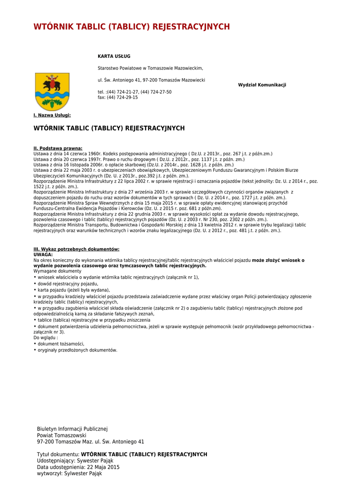 WTÓRNIK TABLIC (TABLICY) REJESTRACYJNYCH KARTA USŁUG Starostwo Powiatowe w Tomaszowie Mazowieckim, ul. Św. Antoniego 41, 97-200 Tomaszów Mazowiecki Wydział Komunikacji tel. :(44) 724-21-27, (44) 724-27-50 fax: (44) 724-29-15 I. Nazwa Usługi: WTÓRNIK TABLIC (TABLICY) REJESTRACYJNYCH II. Podstawa prawna: Ustawa z dnia 14 czerwca 1960r. Kodeks postępowania administracyjnego ( Dz.U. z 2013r., poz. 267 j.t. z późn.zm.) Ustawa z dnia 20 czerwca 1997r. Prawo o ruchu drogowym ( Dz.U. z 2012r., poz. 1137 j.t. z późn. zm.) Ustawa z dnia 16 listopada 2006r. o opłacie skarbowej (Dz.U. z 2014r., poz. 1628 j.t. z późn. zm.) Ustawa z dnia 22 maja 2003 r. o ubezpieczeniach obowiązkowych, Ubezpieczeniowym Funduszu Gwarancyjnym i Polskim Biurze Ubezpieczycieli Komunikacyjnych (Dz. U. z 2013r., poz.392 j.t. z późn. zm.). Rozporządzenie Ministra Infrastruktury z 22 lipca 2002 r. w sprawie rejestracji i oznaczania pojazdów (tekst jednolity: Dz. U. z 2014 r., poz. 1522 j.t. z późn. zm.). Rozporządzenie Ministra Infrastruktury z dnia 27 września 2003 r. w sprawie szczegółowych czynności organów związanych z dopuszczeniem pojazdu do ruchu oraz wzorów dokumentów w tych sprawach ( Dz. U. z 2014 r., poz. 1727 j.t. z późn. zm.). Rozporządzenie Ministra Spraw Wewnętrznych z dnia 15 maja 2015 r. w sprawie opłaty ewidencyjnej stanowiącej przychód Funduszu-Centralna Ewidencja Pojazdów i Kierowców (Dz. U. z 2015 r. poz. 681 z późn.zm). Rozporządzenie Ministra Infrastruktury z dnia 22 grudnia 2003 r. w sprawie wysokości opłat za wydanie dowodu rejestracyjnego, pozwolenia czasowego i tablic (tablicy) rejestracyjnych pojazdów (Dz. U. z 2003 r. Nr 230, poz. 2302 z późn. zm.). Rozporządzenie Ministra Transportu, Budownictwa i Gospodarki Morskiej z dnia 13 kwietnia 2012 r. w sprawie trybu legalizacji tablic rejestracyjnych oraz warunków technicznych i wzorów znaku legalizacyjnego (Dz. U. z 2012 r., poz. 481 j.t. z późn. zm.). III. Wykaz potrzebnych dokumentów: UWAGA: Na okres konieczny do wykonania wtórnika tablicy rejestracyjnej/tablic rejestracyjnych właściciel pojazdu może złożyć wniosek o wydanie pozwolenia czasowego oraz tymczasowych tablic rejestracyjnych. Wymagane dokumenty • wniosek właściciela o wydanie wtórnika tablic rejestracyjnych (załącznik nr 1), • dowód rejestracyjny pojazdu, • karta pojazdu (jeżeli była wydana), • w przypadku kradzieży właściciel pojazdu przedstawia zaświadczenie wydane przez właściwy organ Policji potwierdzający zgłoszenie kradzieży tablic (tablicy) rejestracyjnych, • w przypadku zagubienia właściciel składa oświadczenie (załącznik nr 2) o zagubieniu tablic (tablicy) rejestracyjnych złożone pod odpowiedzialnością karną za składanie fałszywych zeznań, • tablice (tablica) rejestracyjne w przypadku zniszczenia • dokument potwierdzenia udzielenia pełnomocnictwa, jeżeli w sprawie występuje pełnomocnik (wzór przykładowego pełnomocnictwa załącznik nr 3). Do wglądu : • dokument tożsamości, • oryginały przedłożonych dokumentów. Biuletyn Informacji Publicznej Powiat Tomaszowski 97-200 Tomaszów Maz. ul. Św. Antoniego 41 Tytuł dokumentu: WTÓRNIK TABLIC (TABLICY) REJESTRACYJNYCH Udostępniający: Sywester Pająk Data udostępnienia: 22 Maja 2015 wytworzył: Sylwester Pająk IV. Wysokość opłat: Tabela opłat. Opłaty za wydanie: Samochód Motocykl Motorower Przyczepa (naczepa) Ciągnik rolniczy Tablice rejestracyjne zwyczajne 80,00 zł - - - Tablica rejestracyjna zwyczajna 40,00 zł 40,00 zł 30,00 zł 40,00 zł Znaki legalizacyjne 12,50 zł 12,50 zł 12,50 zł 12,50 zł Opłata ewidencyjna 0,50 zł 0,50 zł 0,50 zł 0,50 zł RAZEM Tablice: 93,00 zł Tablica: 53,00 zł 53,00 zł 43,00 zł 53,00 zł Opłaty można dokonać w kasie urzędu w godzinach pracy: poniedziałek - piątek 7.30-15.00,wtorek 7.30 -17.00 lub na konto: Starostwo Powiatowe w Tomaszowie Mazowieckim 53 1560 0013 2000 1462 1000 0002 Getin Noble Bank S.A. UWAGA ! • za pełnomocnictwo w wysokości 17 zł ( opłata nie dotyczy, gdy pełnomocnikiem jest wstępny, zstępny, rodzeństwo, jednostka budżetowa lub samorządowa) wniesiona do kasy urzędu w godzinach pracy: poniedziałek-piątek 7.30-15.00, wtorek 7.30-17.00 • lub na konto: Gminy Miasto Tomaszów Mazowiecki 90 1050 1461 1000 0023 6464 4324 ING Bank Śląski Centrum Korporacyjne w Łodzi ul. Kopcińskiego 73/75, Łódź V. Miejsce załatwienia sprawy: Starostwo Powiatowe, Wydział Komunikacji , ul. Św. Antoniego 41, 97-200 Tomaszów Mazowiecki , tel (44) 724-27-50, (44) 724-21-27, wew. 406,408,494,495,496,498,499,555 godziny pracy: poniedziałek-piątek : 7.30-15.00, wtorek 7.30-17.00 Załatwienie sprawy następuje : • za pobraniem biletu w automacie biletowym w siedzibie urzędu z kategorii "A" lub • za pośrednictwem internetowego systemu umawiania wizyt w Wydziale Komunikacji LINK DO SYSTEMU UMAWIANIA WIZYT: http://www.powiat-tomaszowski.pl/content.php?cms_id=2268&lang=pl&p=p2 VI. Czas załatwienia sprawy: • bez zbędnej zwłoki • do 1 miesiąca – sprawy wymagające postępowania wyjaśniającego • do 2 miesięcy – sprawy szczególnie skomplikowane VIa. Stan sprawy: - [email protected] VII. Sposób załatwienia sprawy: • wtórnik tablicy zostanie zamówiony u producenta, • odbiór wtórnika zalegalizowanej tablicy rejestracyjnej lub zalegalizowanych tablic rejestracyjnych w wyznaczonym terminie, • osoba zainteresowana pisemnie lub notarialnie może udzielić pełnomocnictwa innej osobie do odbioru dokumentu, • osoba zainteresowana lub pełnomocnik winien przedstawić do wglądu swój dokument tożsamości, VIII. Tryb odwoławczy: Od decyzji przysługuje stronie odwołanie do Samorządowego Kolegium Odwoławczego w Piotrkowie Trybunalskim, ul. Słowackiego 19 za pośrednictwem Starosty Tomaszowskiego w terminie 14 dni od daty otrzymania przedmiotowej decyzji. ZAŁĄCZNIKI: WNIOSEK WYMIANA Oświadczenie rej. PEŁNOMOCNICTWO 