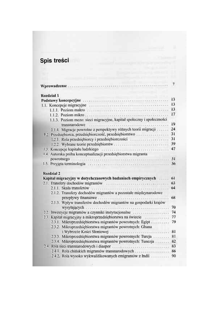 Spis treści Wprowadzenie Rozdział 1 Podstawy koncepcyjne 1.1. Koncepcje migracyjne 1.1.1. Poziom makro 1.1.2. Poziom mikro 1.1.3. Poziom mezo: sieci migracyjne, kapitał społeczny i społeczności transnarodowe 1.1.4. Migracje powrotne z perspektywy różnych teorii migracji 1.2. Przedsiębiorca, przedsiębiorczość, przedsiębiorstwo 1.2.1. Rola przedsiębiorcy i przedsiębiorczości 1.2.2. Wybrane teorie przedsiębiorstw 1.3. Koncepcje kapitału ludzkiego 1.4. Autorska próba konceptualizacji przedsiębiorstwa migranta powrotnego 1.5. Przyjęta terminologia Rozdział 2 Kapitał migracyjny w dotychczasowych badaniach empirycznych 2.1. Transfery dochodów migrantów 2.1.1. Skala transferów 2.1.2. Transfery dochodów migrantów a pozostałe międzynarodowe przepływy finansowe 2.1.3. Wpływ transferów dochodów migrantów na gospodarki krajów wysyłających 2.2. Inwestycje migrantów a czynniki instytucjonalne 2.3. Kapitał migracyjny a mikroprzedsiębiorstwa na świecie 2.3.1. Mikroprzedsiębiorstwa migrantów powrotnych: Egipt 2.3.2. Mikroprzedsiębiorstwa migrantów powrotnych: Ghana i Wybrzeże Kości Słoniowej 2.3.3. Mikroprzedsiębiorstwa migrantów powrotnych: Turcja 2.3.4. Mikroprzedsiębiorstwa migrantów powrotnych: Tunezja 2.4. Rola sieci transnarodowych i diaspor 2.4.1. Rola chińskich migrantów transnarodowych 2.4.2. Rola wysoko wykwalifikowanych emigrantów z Indii 7 13 13 13 17 19 24 31 31 39 47 51 56 61 63 64 68 70 74 77 79 81 81 82 83 86 90 6 Spis treści Rozdział 3 Współczesne migracje zagraniczne Polaków 3.1. Skala migracji 3.2. Kierunki geograficzne migracji 3.3. Charakterystyka demograficzno-społeczna polskich migrantów 3.4. Migracje powrotne Polaków 3.5. Kapitały polskich migrantów w świetle dotychczasowych badań 3.5.1. Kapitał finansowy 3.5.2. Kapitał ludzki migrantów powrotnych 3.5.3. Kapitał społeczny migrantów powrotnych Rozdział 4 Charakterystyka sektora mikroprzedsiębiorstw w Polsce 4.1. Rola mikroprzedsiębiorstw w gospodarce XXI w. 4.2. Rozwój sektora mikroprzedsiębiorstw w Polsce - aspekt ilościowy . . . . 4.3. Uwarunkowania i aspekty jakościowe rozwoju polskich mikroprzedsiębiorstw 4.3.1. Finansowanie 4.3.2. Innowacyjność 93 95 100 104 110 119 119 124 129 133 134 138 144 149 152 Rozdział 5 Mikroprzedsiębiorstwa polskich migrantów powrotnych 161 5.1. Polskie przedsiębiorstwa migranckie w świetle dotychczasowych badań .161 5.2. Wyniki badania jakościowego 167 5.2.1. Praca na emigracji i powrót 170 5.2.2. Specyfika przedsiębiorstw migranckich 173 5.2.3. Wykorzystanie kapitału migracyjnego 178 5.3. Wyniki badania ilościowego 180 5.3.1. Charakterystyka demograficzno-społeczna 182 5.3.2. Praca na emigracji i powrót 184 5.3.3. Działalność gospodarcza w kraju - ogólna charakterystyka przedsiębiorstw 188 5.3.4. Działalność gospodarcza w kraju - doświadczenia migracyjne . . 191 5.3.5. Migracyjny kapitałfinansowy, formy i źródła finansowania 196 5.3.6. Wydatki inwestycyjne, innowacyjność, nowe technologie 199 5.3.7. Kapitał migracyjny a typologia mikroprzedsiębiorstw 200 Podsumowanie Bibliografia 207 219