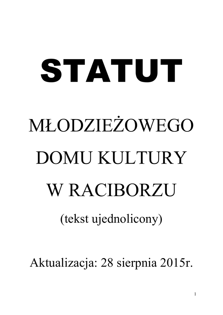 STATUT MŁODZIEŻOWEGO DOMU KULTURY W RACIBORZU (tekst ujednolicony) Aktualizacja: 28 sierpnia 2015r. 1 Podstawa prawna: 1. Ustawa o systemie oświaty z 7 września 1991 r (t.j. z 19 listopada 2004 r. Dz. U. Nr 256. poz. 2572 ze zmianami wprowadzonymi ustawą z 06 grudnia 2013 r. o zmianie ustawy o systemie oświaty oraz niektórych innych ustaw – Dz. U. Z 2014 r. poz. 7) o zasadach rekrutacji na zajęcia. 2. Rozporządzenie Ministra Edukacji Narodowej i Sportu z dnia 7 marca 2005 w sprawie ramowych statutów placówek publicznych ( Dz. U. Nr 52, poz. 466 z późniejszymi zmianami). z dnia 20 listopada 1989 r.(Dz. U. z 23 grudnia 1991 r. Nr 120, poz. 526). 4. Rozporządzenie Ministra Edukacji Narodowej z dnia 9 lutego 2007r. zmieniające rozporządzenie w sprawie ramowych statutów publicznego przedszkola oraz publicznych szkół. (Dz. U. z dnia 27 lutego 2007r. Nr 35, poz.222). 5. Rozporządzenie Ministra Edukacji Narodowej z dnia 12 maja 2011r. w sprawie rodzajów i szczegółowych zasad działania placówek publicznych, warunków pobytu dzieci i młodzieży w tych placówkach oraz wysokości i zasad odpłatności wnoszonej przez rodziców za pobyt ich dzieci w tych placówkach(Dz.U. z dnia 30 maja 2011r.) na podstawie art.71 ust.1 pkt 1 ustawy z dnia 7 września 1991r. o systemie oświaty(Dz.U. z 2004r. Nr 256, poz.2572, z późn.zm.) NAZWA PLACÓWKI §1 1. Placówka, której zasady funkcjonowania określa niniejszy statut nosi nazwę: Młodzieżowy Dom Kultury w Raciborzu. Dopuszczalne jest używanie skrótu MDK w Raciborzu. 2. Młodzieżowy Dom Kultury w Raciborzu jest placówką publiczną. 3. Młodzieżowy Dom Kultury ma siedzibę w Raciborzu przy ul. Stalmacha 12. 4. Organem prowadzącym Młodzieżowy Dom Kultury w Raciborzu jest Powiat Raciborski. 5. Organem nadzorującym placówkę jest Śląski Kurator Oświaty w Katowicach. 2 CELE I ZADANIA MŁODZIEŻOWEGO DOMU KULTURY §2 1. Placówka realizuje cele i zadania określone w ustawie o systemie oświaty, dotyczące działalności pozaszkolnej. 2. Cele: 1) rozwijanie zainteresowań, uzdolnień i talentów dzieci i młodzieży; 2) wdrażanie wychowanków do planowania, organizowania czasu wolnego od nauki, kulturalnego wypoczynku, rozrywki; 3) pogłębianie, rozszerzanie wiedzy i umiejętności, twórczego myślenia i działania; 4) wdrażanie do dbałości o zdrowie psychiczne i fizyczne; 5) wpajanie zasad bezpieczeństwa, w tym zasad bezpieczeństwa ruchu drogowego, nauka zachowań w różnych sytuacjach; 6) wyrabianie właściwego stosunku do pracy i ludzi; 7) kształtowanie poszanowania wartości rodzinnych; 8) poznawanie dziedzictwa kultury regionalnej, narodowej, europejskiej, przygotowywanie do aktywnego uczestnictwa w życiu kulturalnym; 9) kształtowanie postawy obywatelskiej i patriotycznej; 10) upowszechnianie wiedzy ekologicznej i podstaw ochrony środowiska; 11) rozwijanie umiejętności skutecznego porozumiewania się w różnych sytuacjach, budowania więzi w grupie, przestrzegania obowiązujących norm; 12) przygotowywanie do publicznych wystąpień indywidualnych i grupowych. 3. Zadania placówki: 1) stwarzanie warunków do rozwijania zainteresowań, uzdolnień i talentów dzieci i młodzieży w różnorodnych kołach; 2) zorganizowanie właściwego procesu kształcenia, zgodnego z zasadami higieny i pracy umysłowej; 3) zapewnienie opieki wychowawczej, ochrony przed różnymi formami przemocy fizycznej lub psychicznej oraz ochrony i poszanowania godności osobistej; 4) wspomaganie wychowawczej roli rodziny; 5) umożliwienie udziału w zajęciach dzieciom niepełnosprawnym i niedostosowanym; 3 6) organizowanie czasu wolnego, wypoczynku i rekreacji, w tym również podczas ferii zimowych i wakacji; 7) realizowanie programów edukacyjnych, wychowawczych i profilaktyki; 8) współpraca z rodzinami wychowanków, placówkami kulturalno-oświatowymi, instytucjami samorządowymi, organizacjami pozarządowymi oraz środowiskiem lokalnym poprzez: a) organizowanie koncertów, przeglądów, konkursów, pokazów, wystaw, zajęć plenerowych; b) udział wychowanków w konkursach, imprezach organizowanych przez inne placówki lub instytucje lokalne, w tym również imprezy międzynarodowe; c) działanie na rzecz środowiska, realizowanie innych zadań oświatowo – wychowawczych zleconych przez organ prowadzący lub inne instytucje i organizacje, nieodpłatnie jak i odpłatnie; d) udostępnianie sali widowiskowej w godzinach niekolidujących z czasem pracy placówki (godziny dopołudniowe) na ważne wydarzenia, imprezy, spotkania uroczystości mające zasięg miejski i powiatowy; e) zachęcanie rodziców do aktywnego uczestnictwa w działaniach placówki; f) współpracę z Poradnią Psychologiczno-Pedagogiczną; 9) opracowanie własnych programów i planów pracy w tym m. in. Programu Wychowawczego Placówki oraz Programu Profilaktyki. ORGANY PLACÓWKI §3 1. Organami Młodzieżowego Domu Kultury są: 1) dyrektor placówki; 2) rada pedagogiczna. 3) rada rodziców 2. W placówce może działać: 1) samorząd wychowanków; 3. Zakres zadań, obowiązków i kompetencji dyrektora placówki obejmuje: 4 1) kierowanie bieżącą działalnością edukacyjną, wychowawczą i opiekuńczą placówki oraz reprezentowanie jej na zewnątrz; 2) sprawowanie opieki nad wychowankami: stwarzanie im warunków do czynnego uczestnictwa we wszystkich formach pracy placówki oraz warunków do harmonijnego rozwoju psychofizycznego; 3) sprawowanie nadzoru pedagogicznego; 4) przewodniczenie radzie pedagogicznej i realizacja jej uchwał; 5) wykonywanie postanowień ustawy Karty Nauczyciela w zakresie dotyczącym awansu zawodowego nauczycieli; 6) dysponowanie budżetem określonym przez organ prowadzący w planie finansowym na dany rok i odpowiedzialność za jego prawidłowe wykorzystanie; 7) zatrudnienie i zwalnianie nauczycieli oraz innych pracowników placówki; 8) przyznawanie nagród oraz wymierzanie kar porządkowych nauczycielom i innym pracowni