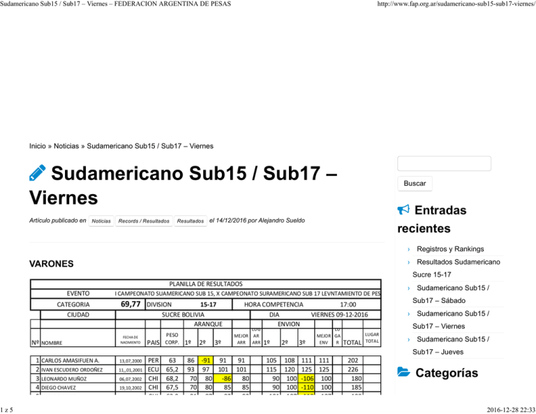 Sudamericano Sub15 / Sub17 – Viernes – FEDERACION ARGENTINA DE PESAS 1z5 http://www.fap.org.ar/sudamericano-sub15-sub17-viernes/ Inicio » Noticias » Sudamericano Sub15 / Sub17 – Viernes Sudamericano Sub15 / Sub17 – Viernes Artículo publicado en Noticias VARONES Records / Resultados Resultados el 14/12/2016 por Alejandro Sueldo Buscar Entradas recientes › Registros y Rankings › Resultados Sudamericano Sucre 15-17 › Sudamericano Sub15 / Sub17 – Sábado › Sudamericano Sub15 / Sub17 – Viernes › Sudamericano Sub15 / Sub17 – Jueves Categorías 2016-12-28 22:33 Sudamericano Sub15 / Sub17 – Viernes – FEDERACION ARGENTINA DE PESAS 2z5 Inicio Institucional http://www.fap.org.ar/sudamericano-sub15-sub17-viernes/ Calendarios Noticias › Noticias Records / Resultados › Rankings Contáctenos › Records / Resultados › Resultados MUJERES 2016-12-28 22:33 Sudamericano Sub15 / Sub17 – Viernes – FEDERACION ARGENTINA DE PESAS 3z5 Inicio Institucional http://www.fap.org.ar/sudamericano-sub15-sub17-viernes/ Calendarios Noticias Records / Resultados Contáctenos MUJERES 2016-12-28 22:33 Sudamericano Sub15 / Sub17 – Viernes – FEDERACION ARGENTINA DE PESAS 4z5 Inicio ← Sudamericano Sub15 / Sub17 – Jueves Institucional http://www.fap.org.ar/sudamericano-sub15-sub17-viernes/ Calendarios Noticias Records / Resultados Contáctenos Sudamericano Sub15 / Sub17 – Sábado → 2016-12-28 22:33 Sudamericano Sub15 / Sub17 – Viernes – FEDERACION ARGENTINA DE PESAS 5z5 Inicio Institucional http://www.fap.org.ar/sudamericano-sub15-sub17-viernes/ Calendarios Noticias Records / Resultados Contáctenos · © 2016 FEDERACION ARGENTINA DE PESAS · Designed by Press Customizr · Powered by · 2016-12-28 22:33