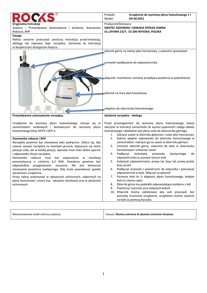 Produkt: Model: Oryginalna Instrukcja Zawiera – Przewidywane Zastosowanie i działanie, Stanowiska Robocze, BHP Uwaga Należy uważnie przeczytać poniższą instrukcję przed instalacją, obsługą lub naprawą tego narzędzia. Zachowaj tę instrukcję w bezpiecznym dostępnym miejscu. Urządzenie do wymiany płynu hamulcowego 1 l OK-02.0421 Producent/Dostawca SIMITEC SADOWSKI I ZAWADA SPÓŁKA JAWNA UL.LIPOWA 23/7; 52-200 WYSOKA; POLSKA zbiornik górny na świeży płyn hamulcowy, z zaworem spustowym przewód i podłączenie do odpowietrznika włącznik i mechanizm zamiany przepływu powietrza w podciśnienie zbiornik na stary płyn hamulcowy adaptery do zbiorniczka hamulcowego Przewidywane zastosowanie narzędzia Działanie narzędzia - obsługa Urządzenie do wymiany płynu hamulcowego stosuje się w samochodach osobowych i dostawczych do wymiany płynu hamulcowego klasy DOT3 i DOT 4. Przed przystąpieniem do wymiany płynu hamulcowego należy odczytać w instrukcji samochodu ile wynosi pojemność całego układu hamulcowego i dokładnie tyle płynu wlać do zbiorniczka górnego. 1. Zakręcić zawór w zbiorniku głównym i nalać płyn hamulcowy 2. Dobrać adapter odpowiedni do zbiornika hamulcowego w samochodzie i nakręcić go na zawór w zbiorniku górnym 3. Umieścić zbiornik górny, zaworem do dołu w zbiorniczku hamulcowym i otworzyć zawór 4. Podłączyć końcówkę przewodu elastycznego do odpowietrznika w prawym tylnym kole 5. Kolejność odpowietrzania: prawy tył, lewy tył, prawy przód, lewy przód 6. Podłączyć przewód z powietrzem do włącznika i poluzować odpowietrznik w kole. Włączyć urządzenie 7. Pierwsze koło to ½ objętości płynu hamulcowego, kolejne koła to równe części 8. Zbiornik górny ma podziałki odpowiadające każdemu z kół 9. Powtórzyć czynność przy kolejnych kołach 10. Włącznik można zablokować aby sam pracował, bez potrzeby trzymania urządzenia, urządzenie można zawiesić na kole za pomocą haczyka. Stanowiska robocze i BHP Narzędzie powinno być stosowane jako podręczne. Zaleca się, aby zawsze używać narzędzia na twardym gruncie, dopuszcza się różne pozycje ciała, ale w każdej pozycji, operator musi mieć dobre oparcie i odpowiedni chwyt narzędzia. Stanowisko robocze musi być wyposażone w instalację pneumatyczną o ciśnieniu 6,2 BAR. Powietrze powinno być odpowiednio przygotowane: osuszone. Nie jest konieczne stosowanie powietrza naolejonego. Olej może powodować spadek sprawności urządzenia. Pracę należy wykonywać w rękawicach ochronnych, odpornych na płyny hamulcowe i smary (np. rękawice nitrylowe) oraz w okularach ochronnych. Używać: Okulary ochronne & rękawice ochronne nitrylowe Rekomendowane środki ochrony osobistej 1