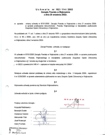 Uchwała nr 182/114/2002 Zarządu Powiatu w Wąbrzeźnie z dnia 26 września 2002r. w sprawie : zmiany uchwały nr 87/51/2000 Zarządu Powiatu w Wąbrzeźnie z dnia 21 września 2000r, w sprawie przekazania nieruchomości Powiatu Wąbrzeskiego w nieodpłatne użytkowanie Zespołowi Opieki Zdrowotnej w Wąbrzeźnie. Na podstawie art. 11 ust. 1 ustawy z dnia 21 sierpnia 1997r. o gospodarce nieruchomościami (tekst jednolity, Dz.U. nr 46 z 2000r., poz. 543 ze zm.) po rozpatrzeniu wniosku Dyrektora Zespołu Opieki Zdrowotnej w Wąbrzeźnie z dnia 3 września 2002r. Zarząd Powiatu uchwala, co następuje: §1 W uchwale nr 87/51/2000 Zarządu Powiatu w Wąbrzeźnie z dnia 21 września 2000r. w sprawie przekazania nieruchomości Powiatu Wąbrzeskiego w nieodpłatne użytkowanie Zespołowi Opieki Zdrowotnej w Wąbrzeźnie w § 1 skreśla się drugie tiret w brzmieniu : „ - nr 582/2 o powierzchni 548 m - zapisana w księdze wieczystej KW 29984". 2 §2 Niniejsza uchwała stanowi podstawę do zmiany aktu notarialnego z dnia 3 listopada 2000r., repertorium A nr 5339/2000 w sprawie ustanowienia użytkowania na rzecz Zespołu Opieki Zdrowotnej w Wąbrzeźnie. §3 Wykonanie uchwały powierza się Staroście Wąbrzeskiemu, §4 Uchwała wchodzi w życie z dniem podjęcia. S t a r Podpisy członków Zarządu: Krzysztof Mackiewicz Benedykt Dudek Waldemar Dzielski Aleksander Filak Józef Krawczyk Adam Puchała RADCA/ .PRAWNY Barbara Lech <*/ifsi. t: sm. mgr KrrfiztoflMałkiewicz
