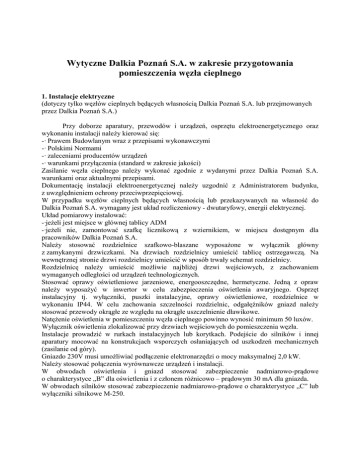 Wytyczne Dalkia Poznań S.A. w zakresie przygotowania pomieszczenia węzła cieplnego 1. Instalacje elektryczne (dotyczy tylko węzłów cieplnych będących własnością Dalkia Poznań S.A. lub przejmowanych przez Dalkia Poznań S.A.) Przy doborze aparatury, przewodów i urządzeń, osprzętu elektroenergetycznego oraz wykonaniu instalacji naleŜy kierować się: -· Prawem Budowlanym wraz z przepisami wykonawczymi -· Polskimi Normami -· zaleceniami producentów urządzeń -· warunkami przyłączenia (standard w zakresie jakości) Zasilanie węzła cieplnego naleŜy wykonać zgodnie z wydanymi przez Dalkia Poznań S.A. warunkami oraz aktualnymi przepisami. Dokumentację instalacji elektroenergetycznej naleŜy uzgodnić z Administratorem budynku, z uwzględnieniem ochrony przeciwprzepięciowej. W przypadku węzłów cieplnych będących własnością lub przekazywanych na własność do Dalkia Poznań S.A. wymagany jest układ rozliczeniowy - dwutaryfowy, energii elektrycznej. Układ pomiarowy instalować: -·jeŜeli jest miejsce w głównej tablicy ADM -·jeŜeli nie, zamontować szafkę licznikową z wziernikiem, w miejscu dostępnym dla pracowników Dalkia Poznań S.A. NaleŜy stosować rozdzielnice szafkowo-blaszane wyposaŜone w wyłącznik główny z zamykanymi drzwiczkami. Na drzwiach rozdzielnicy umieścić tablicę ostrzegawczą. Na wewnętrznej stronie drzwi rozdzielnicy umieścić w sposób trwały schemat rozdzielnicy. Rozdzielnicę naleŜy umieścić moŜliwie najbliŜej drzwi wejściowych, z zachowaniem wymaganych odległości od urządzeń technologicznych. Stosować oprawy oświetleniowe jarzeniowe, energooszczędne, hermetyczne. Jedną z opraw naleŜy wyposaŜyć w inwertor w celu zabezpieczenia oświetlenia awaryjnego. Osprzęt instalacyjny tj. wyłączniki, puszki instalacyjne, oprawy oświetleniowe, rozdzielnice w wykonaniu IP44. W celu zachowania szczelności rozdzielnic, odgałęźników gniazd naleŜy stosować przewody okrągłe ze względu na okrągłe uszczelnienie dławikowe. NatęŜenie oświetlenia w pomieszczeniu węzła cieplnego powinno wynosić minimum 50 luxów. Wyłącznik oświetlenia zlokalizować przy drzwiach wejściowych do pomieszczenia węzła. Instalacje prowadzić w rurkach instalacyjnych lub korytkach. Podejście do silników i innej aparatury mocować na konstrukcjach wsporczych osłaniających od uszkodzeń mechanicznych (zasilanie od góry). Gniazdo 230V musi umoŜliwiać podłączenie elektronarzędzi o mocy maksymalnej 2,0 kW. NaleŜy stosować połączenia wyrównawcze urządzeń i instalacji. W obwodach oświetlenia i gniazd stosować zabezpieczenie nadmiarowo-prądowe o charakterystyce „B” dla oświetlenia i z członem róŜnicowo – prądowym 30 mA dla gniazda. W obwodach silników stosować zabezpieczenie nadmiarowo-prądowe o charakterystyce „C” lub wyłączniki silnikowe M-250. Dla urządzeń zamontowanych na stałe jako środek ochrony przeciwpoŜarowej dodatkowej naleŜy stosować szybkie wyłączenie zasilania, dla urządzeń przenośnych (gniazda) – wyłącznik przeciwporaŜeniowy róŜnicowo - prądowy. Niedopuszczalne jest zabezpieczenie jednym wyłącznikiem róŜnicowo - prądowym całego obiektu. Stosować ochronniki dla zabezpieczenia torów prądowych L1, L2, L3 i neutralnego N, uziemioną SzU (szyną uziemiającą) R<5 i rozłącznik bezpiecznikowy R321 (zasilanie 1-fazowe) lub R323 (zasilanie 3-fazowe) wg schematu (załącznik nr 1). Ochroną przeciwporaŜeniową objąć szafkę licznikową. Konieczne jest wykonanie miejscowych połączeń wyrównawczych. Podłączyć urządzenia automatyki w sposób umoŜliwiający samoczynne wyłączenie pompy obiegowej c.o. w okresie przejściowym - zabezpieczenie pompy przed suchobiegiem. 2. Wymogi pozostałe. Pomieszczenie węzła powinno w miarę moŜliwości posiadać okno oraz wejście z zewnętrz. W przypadku pomieszczenia z wejściem od wewnątrz budynku dojście do pomieszczenia węzła musi być zapewnione przez ciągi komunikacyjne ogólnodostępne. W przypadku urządzeń o gabarytach uniemoŜliwiających transport drogą komunikacyjną - tzn. przez istniejące korytarze i drzwi z podwójnym zamkiem, naleŜy zapewnić moŜliwość wykonania otworu montaŜowego w celu wprowadzenia tych urządzeń. Wszystkie okna (o ile istnieją) wykonać z tworzywa sztucznego, otwierane do wewnątrz, okratowane i zabezpieczone siatką z drutu stalowego ocynkowanego o oczkach o wymiarach 2cm x 2cm. Posadzka węzła powinna być gładka, niepalna, wytrzymała na uderzenia mechaniczne i nagłe zmiany temperatury. NaleŜy ją wykonać ze spadkiem 1% w kierunku kratek odwodnieniowych lub studzienki schładzającej. Ściany pomieszczenia węzła wykończyć tynkiem cementowo-wapiennym. W przypadku ścian wylewanych betonowych pomalować dwa razy unigruntem. PodłoŜe pod tynkiem przygotować pod kątem zabezpieczenia przed odparzeniem ściany w pomieszczeniu węzła pomalować do wysokości 2.0 metrów farbą olejną. Ściany powyŜej i sufit malować farbą emulsyjną. Stosować farby w kolorach jasnych. Posadzka węzła powinna być odwodniona do kanalizacji grawitacyjnie poprzez wpusty podłogowe i studzienkę schładzającą. Na odcinku odpływowym kanalizacji ściekowej w węźle cieplnym naleŜy zamontować klapę zwrotną. W przypadku braku moŜliwości grawitacyjnego odwodnienia posadzki węzła naleŜy zamontować studzienkę odwadniająco – schładzającą z pompą sterowaną automatycznie w zaleŜności od poziomu wody w studzience i zapewniającą odprowadzenie ścieków do kanalizacji. W pomieszczeniu węzła naleŜy zapewnić odpowiednią wentylację grawitacyjną nawiewnowywiewną. KaŜdy węzeł musi posiadać zawór Dn 15 ze złączką do węŜa zamontowany na przewodzie wody zimnej. Na odgałęzieniu do zaworu naleŜy zamontować wodomierz. W przypadku zmiany zabezpieczenia instalacji c.o. z systemu otwartego na zamknięty naleŜy bezwzględnie przystosować in