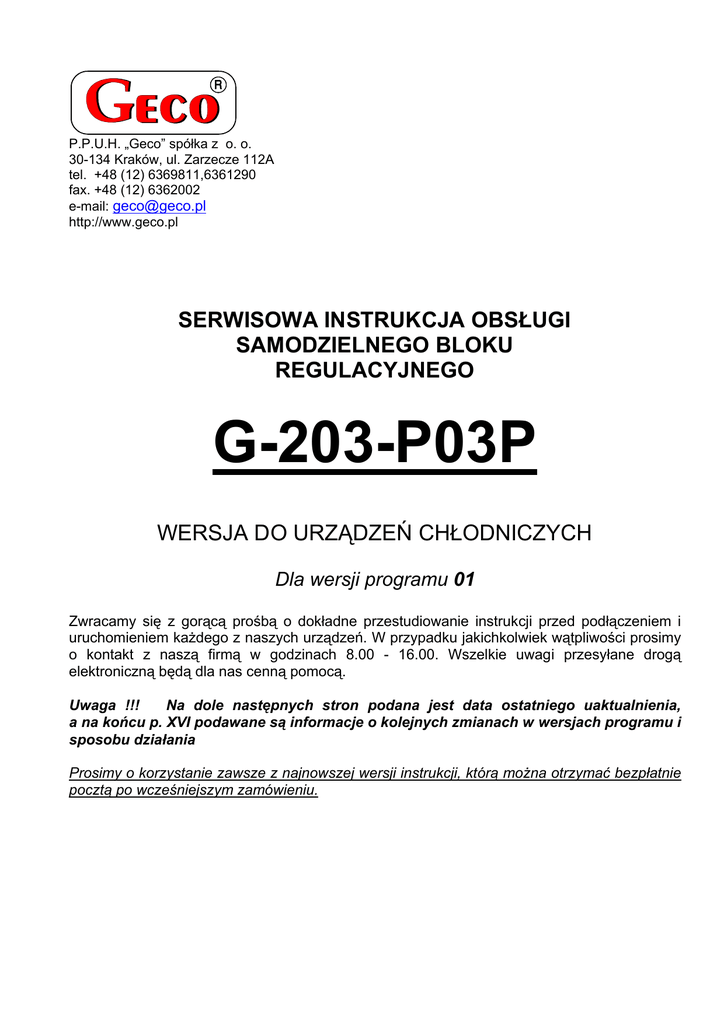 P.P.U.H. „Geco” spółka z o. o. 30-134 Kraków, ul. Zarzecze 112A tel. +48 (12) 6369811,6361290 fax. +48 (12) 6362002 e-mail: [email protected] http://www.geco.pl SERWISOWA INSTRUKCJA OBSŁUGI SAMODZIELNEGO BLOKU REGULACYJNEGO G-203-P03P WERSJA DO URZĄDZEŃ CHŁODNICZYCH Dla wersji programu 01 Zwracamy się z gorącą prośbą o dokładne przestudiowanie instrukcji przed podłączeniem i uruchomieniem każdego z naszych urządzeń. W przypadku jakichkolwiek wątpliwości prosimy o kontakt z naszą firmą w godzinach 8.00 - 16.00. Wszelkie uwagi przesyłane drogą elektroniczną będą dla nas cenną pomocą. Uwaga !!! Na dole następnych stron podana jest data ostatniego uaktualnienia, a na końcu p. XVI podawane są informacje o kolejnych zmianach w wersjach programu i sposobu działania Prosimy o korzystanie zawsze z najnowszej wersji instrukcji, którą można otrzymać bezpłatnie pocztą po wcześniejszym zamówieniu. strona 2 I. INSTRUKCJA SERWISOWA DLA PRODUCENTÓW SBR TYP G-203-P03P CHARAKTERYSTYKA OGÓLNA. Samodzielny Blok Regulacyjny nazywany dalej G-203-P03P jest urządzeniem nowoczesnym, wygodnym i łatwym w obsłudze. Wykonany został w technice mikroprocesorowej przy zastosowaniu automatycznego montażu powierzchniowego. Dzięki dwuczęściowej obudowie i nowatorskim rozwiązaniom technicznym G-203-P03P może zostać zastosowany do każdego mebla i prostej komory chłodniczej. Pracujący pod bezpiecznym 5V napięciem panel sterujący może zostać zamocowany w dowolnym miejscu, bez potrzeby wycinania dodatkowych otworów i prowadzenia wielu kabli zasilających daleko od sterowanych urządzeń. G-203-P03P wyposażony został w trzy czujniki temperatury możliwość podpięcia czujnika otwarcia drzwi do panelu sterującego lub modułu wykonawczego – pracują one wtedy pod bezpiecznym 5V napięciem oraz dwa wyjścia umożliwiające bezpośrednie podłączenie urządzeń pracujących pod napięciem 230V o możliwości obciążenia jak w tabeli 1. Na specjalne zamówienie G-203-P03P może zostać wyposażony w dodatkowy układ detekcji oszronienia parownika który jest podłączany do termostatu i powoduje automatyczne wejście w tryb odszraniania. W przypadku zastosowania w urządzeniach chłodniczych G-203-P03P stabilizuje temperaturę oraz steruje automatycznym rozmrażaniem, którego okres można dostosować do specyficznych warunków otoczenia posiada również przycisk do ręcznego odmrażania parownika. G-203-P03P w stosunku do G18-3 został dodatkowo wyposażony w wyłącznik oświetlenia działający niezależnie od wyłącznika głównego. Termostaty te nie wymagają specjalnej konserwacji; klawiatura została wykonana ze specjalnego rodzaju folii wytrzymałej na wysokie temperatury i większość środków chemicznych. Niedozwolone jest jej czyszczenie ostrymi przedmiotami, wystarczy co pewien czas przetrzeć wilgotną szmatką płytę czołową. II. SPOSÓB OZNACZANIA I DANE TECHNICZNE Napięcie pracy Temperatura otoczenia Wilgotność Stopień ochrony - 230V +10% -15% od +5°C do +40°C od 20% do 80% RH IP65 od strony czołowej panelu sterującego Tabela 1: Oznaczenia przekaźników i obciążalność wyjść Wyjście Obciążalność P1 – Kompresor 8A 2HP 1500W P2 – Światło 4A 750W P4 – Grzałka 8A 1500W Uwaga !!! • Prądy podane w tabelce są prądami pobieranymi przez poszczególne urządzenia w czasie normalnej pracy i uwzględniają już prądy rozruchowe tych urządzeń !!! • Sumaryczny prąd pobierany na raz przez urządzenia nie może przekraczać 10A !!! PPUH „GECO” - G-203-P03P wersja programu 01 WYDRUK Z DNIA 03-03-26 strona 3 III. DOSTAWA, MONTAŻ I PODŁĄCZENIE 1. W przeznaczonym do tego miejscu w urządzeniu wycinamy otwór o wymiarach 20x30mm, a jeżeli nie będzie zastosowana maskownica panelu otwór powinien mieć wymiary 58x109mm. 2. Moduł wykonawczy należy osadzić na szynie i zablokować zatrzaskiem. W przypadku urządzeń sklepowych WYMAGANE jest zamocowanie modułu wykonawczego SBR na zasadzie „do podłogi”!!! 3. Wszelkie metalowe elementy, przez które przekładany jest G-203-P03P lub jego kable powinny być opiłowanie bądź zabezpieczone w inny sposób. Niedozwolone jest zamocowanie G-203-P03P dopuszczające bezpośrednie działanie na niego wody (np. woda skraplająca się na dolnej osłonie witryny), dotykanie rurki odpływowej z parownika itp. oraz powodujące znaczne zmiany jego temperatury w stosunku do temperatury otoczenia (np. mocowanie w bezpośredniej bliskości kompresora i jego osprzętu, elementów chłodzonych i grzanych). 4. Tasiemkę łączącą panel z modułem wykonawczym przycinamy na żądaną długość plus 2-3cm. Następnie, po jej przełożeniu przez wszystkie przejścia, jeszcze raz przycinamy jej końce pod kątem prostym i zaciskamy na niej wtyczki tak aby koniec tasiemki był w nich schowany na około 0.5mm. Tasiemka musi być wprowadzona prostopadle do wtyczki i zaciśnięta bez możliwości jakiegokolwiek jej skręcenia czy nierównoległego ułożenia . Podłączenie tasiemki do złączek patrz rysunek na końcu instrukcji. 5. Po zamocowaniu G-203-P03P, kable energetyczne podłączamy zgodnie z opisem znajdującym się na ściance modułu wykonawczego. W zależności od wersji G-203-P03P pewne wyjścia mogą być nie wykorzystane - na nalepce z opisem nie będą one opisane a w oznaczeniu typu w odpowiednich miejscach będą wstawione zera - do tych wyjść nie wolno podłączać żadnych przewodów !!! 6. Zastosowane złączki posiadają atest na ciągłe obciążenie 16A!!! Zastosowano w nich gwint drobnozwojowy i specjalne blaszki zapobiegające przecinaniu przewodów, dlatego już lekkie dokręcenie powoduje maksymalnie dobry kontakt a użycie większej siły może doprowadzić do zerwania gwintu. W konsekwencji tego może dojść do wytopienia gniazda i zwarcia !!! 7. Wszelkie naddatki kabli skracamy przez przycięcie lub zwinięcie i spięcie ze sobą przy pomocy specjalnyc