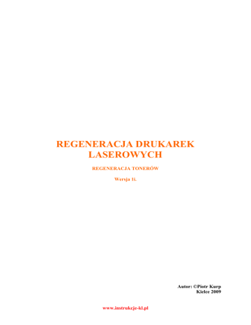 REGENERACJA DRUKAREK LASEROWYCH REGENERACJA TONERÓW Wersja 1i. Autor: ©Piotr Kurp Kielce 2009 www.instrukcje-kl.pl UWAGA!!! Wszystkie użyte znaki towarowe są własnością ich prawnych właścicieli i zostały tu przywołane jedynie w celach informacyjnych. Instrukcja nie może być powielana, ani rozpowszechniana w całości lub w części w celach komercyjnych bez uprzedniej zgody autora. Autor nie ponosi odpowiedzialności za uszkodzenia wynikłe z niewłaściwego zastosowania się do wskazówek w instrukcji. RADY OGÓLNE 1. Jeżeli Państwo wcześniej tego nie robili, to zalecam jedynie wyciągniecie korka, zasypanie kasety tonerem oraz wymianę chipa (jeżeli występuje). Niedoświadczony użytkownik może niewłaściwie zregenerować kasetę, co może spowodować pogorszenie jakości wydruków. 2. Dla starszych typów drukarek posiadających tzw. "śmietnik" zaleca się jego czyszczenie ze zużytego proszku przy każdorazowej regeneracji kasety. 3. Przed napełnieniem kasety nowym proszkiem zalecam bardzo dokładne wyczyszczenie zasobnika ze starego proszku (najlepiej odkurzaczem). Czasem proszek oryginalnej kasety może reagować z proszkiem użytym do regeneracji (dotyczy głównie drukarek Lexmark E3**, Brother i nowszych modeli HP – informacja zawarta w instrukcji). www.instrukcje-kl.pl 2 OPERACJA REGENERACJI I KONSERWACJI TONERA HP Q2610A Toner HP2300, HP2300L, HP2300d, HP2300dn, HP2300dtn, HP2300n 1. Ustaw kasetę bębnem do góry. Płaskim śrubokrętem zwolnij zatrzask ramienia osłony wałka OPC. Zdemontuj ramię osłony. 2. Sprężynkę naciągu ramienia zainstaluj jak na rysunku. 3. Wyciągnij oś wałka OPC od strony zębatki wałka. Jeżeli powyższa instrukcja okazała się dla Ciebie pomocna, proszę kliknij 3 dowolne reklamy na stronie: www.instrukcje-kl.pl www.instrukcje-kl.pl 3 4. Zdemontuj wałek OPC uważając aby go nie uszkodzić. 5. Zdemontuj wałek PCR. Wyczyść wałek wodą i delikatnym mydłem. Pamiętaj aby wałek był całkowicie suchy przed ponownym zamontowaniem. 6. Zlokalizuj bolce znajdujące się wewnątrz kasety po obu jej stronach. Bolce trzymają razem moduł wałka OPC i moduł zasobnika z tonerem. Małym płaskim śrubokrętem wypchnij bolce na zewnątrz kasety. Po wyjęciu bolców rozdziel oba moduły. Moduł wałka OPC 7. Wykręć dwie śruby trzymające listwę czyszczącą i zdemontuj ją. Wyczyść listwę. Wyczyść śmietnik za listwą z zalegającego tam zużytego tonera. Wyczyść łożyska ślizgowe wałka PCR. www.instrukcje-kl.pl 4 8. Zmontuj moduł wałka OPC. Zamontuj listwę czyszczącą. Zamontuj również wałek PCR a następnie wałek OPC. Odłóż moduł na bok do dalszego montażu kasety. Moduł zasobnika z tonerem 9. Zdemontuj osłonę kasety. 10. Wykręć dwie śruby trzymające osłonę boczną mechanizmów zębatych. Zdemontuj osłonę. 11. Z drugiej strony kasety wykręć dwie śruby osłony styków kontaktowych rolki magnetycznej. Jeżeli powyższa instrukcja okazała się dla Ciebie pomocna, proszę kliknij 3 dowolne reklamy na stronie: www.instrukcje-kl.pl www.instrukcje-kl.pl 5 12. Przy użyciu płaskiego śrubokręta zwolnij zatrzask trzymający osłonę styków. 13. Zdemontuj osłonę uważając aby nie uszkodzić styków. 14. Zdemontuj rolkę magnetyczna wraz z łożyskami. Wyczyść rolkę magnetyczną sprężonym powietrzem i suchą szmatką. Uważaj aby nie zgubić żadnego z elementów rolki. Wykręć dwie śruby listwy rozprowadzającej. Zdemontuj białe plastiki (skrobaki) za śrubami a następnie listwę. Wyczyść listwę delikatną szmatką nasączoną alkoholem. www.instrukcje-kl.pl 6 15. Zdemontuj polimerowe dystanse znajdujące się po bokach kasety. Wyczyść wnętrze kasety ze starego proszku. Zasyp kasetę nowym proszkiem. 16. Zmontuj moduł zasobnika z tonerem powtarzając powyższe czynności w odwrotnej kolejności. Zmontuj razem ze sobą moduł wałka OPC i moduł zasobnika z tonerem. Wymień chip w kasecie na nowy. Zainstaluj kasetę w drukarce. Jeżeli powyższa instrukcja okazała się dla Ciebie pomocna, proszę kliknij 3 dowolne reklamy na stronie: www.instrukcje-kl.pl Zamów chip do kasety: [email protected] Potrzebujesz proszków lub chipów do innych drukarek laserowych: [email protected] www.instrukcje-kl.pl 7