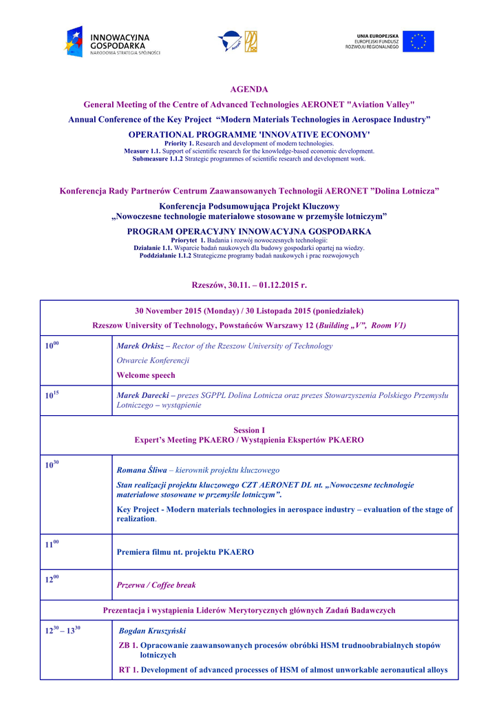 AGENDA General Meeting of the Centre of Advanced Technologies AERONET "Aviation Valley" Annual Conference of the Key Project “Modern Materials Technologies in Aerospace Industry” OPERATIONAL PROGRAMME 'INNOVATIVE ECONOMY' Priority 1. Research and development of modern technologies. Measure 1.1. Support of scientific research for the knowledge-based economic development. Submeasure 1.1.2 Strategic programmes of scientific research and development work. Konferencja Rady Partnerów Centrum Zaawansowanych Technologii AERONET ”Dolina Lotnicza” Konferencja Podsumowująca Projekt Kluczowy „Nowoczesne technologie materiałowe stosowane w przemyśle lotniczym” PROGRAM OPERACYJNY INNOWACYJNA GOSPODARKA Priorytet 1. Badania i rozwój nowoczesnych technologii: Działanie 1.1. Wsparcie badań naukowych dla budowy gospodarki opartej na wiedzy. Poddziałanie 1.1.2 Strategiczne programy badań naukowych i prac rozwojowych Rzeszów, 30.11. – 01.12.2015 r. 30 November 2015 (Monday) / 30 Listopada 2015 (poniedziałek) Rzeszow University of Technology, Powstańców Warszawy 12 (Building „V”, Room V1) 1000 Marek Orkisz – Rector of the Rzeszow University of Technology Otwarcie Konferencji Welcome speech 1015 Marek Darecki – prezes SGPPL Dolina Lotnicza oraz prezes Stowarzyszenia Polskiego Przemysłu Lotniczego – wystąpienie Session I Expert’s Meeting PKAERO / Wystąpienia Ekspertów PKAERO 1030 Romana Śliwa – kierownik projektu kluczowego Stan realizacji projektu kluczowego CZT AERONET DL nt. „Nowoczesne technologie materiałowe stosowane w przemyśle lotniczym”. Key Project - Modern materials technologies in aerospace industry – evaluation of the stage of realization. 1100 1200 Premiera filmu nt. projektu PKAERO Przerwa / Coffee break Prezentacja i wystąpienia Liderów Merytorycznych głównych Zadań Badawczych 1230 – 1330 Bogdan Kruszyński ZB 1. Opracowanie zaawansowanych procesów obróbki HSM trudnoobrabialnych stopów lotniczych RT 1. Development of advanced processes of HSM of almost unworkable aeronautical alloys Krzysztof Jemielniak ZB 2. Modelowanie, konstruowanie i kontrolowanie procesu HSM z uwzględnieniem skonfigurowanego układu maszyna-przyrząd-detal RT 2. Modelling, construction and control of the HSM process taking into consideration the configured machine-instrument-detail system Adam Marciniec ZB 3. Opracowanie technologii efektywnego projektowania i produkcji przekładni stożkowych z wykorzystaniem systemu Phoenix firmy Gleason RT 3. Development of the technology of effective design and production of cone gear using Gleason Phoenix system Bogdan Kozik ZB 4. Opracowanie nowej, prostszej i tańszej przekładni zębatej w miejsce skomplikowanych i drogich przekładni planetarnych RT 4. Development of a new, simpler and cheaper toothed gear in place of complicated and expensive planetary gears Józef Kuczmaszewski ZB 5. Nowoczesna obróbka mechaniczna stopów magnezu i aluminium RT 5. Modern mechanical working of magnesium and aluminium alloys 30 12 – 13 30 Henryk Galina ZB 6. Materiały kompozytowe o zwiększonej wytrzymałości i odporności termicznej z wykorzystaniem żywic polimerowych do zastosowań w lotnictwie RT 6. Composite materials of increased strength and thermal resistance with the use of polymeric resins applied in aviation Eugeniusz Hadasik ZB 7. Plastyczne kształtowanie stopów magnezu (kucie precyzyjne, tłoczenie, wyciskanie, itd.) RT 7. Plastic forming of magnesium alloys (precision forging, stamping, extrusion and etc.) Franciszek Grosman ZB 8. Plastyczne kształtowanie lotniczych stopów Al (w tym Al-Li) oraz Ti RT 8. Plastic forming of aeronautical Al (including Al-Li) and Ti alloys Barbara Surowska ZB 9. Metaliczne materiały kompozytowe w aplikacjach lotniczych w tym materiały typu GLARE RT 9. Composite metallic materials in aviation applications (including Glare-type materials) Lucjan Swadźba ZB 10. Nowoczesne pokrycia barierowe na krytyczne części silnika RT 10. Modern barrier covers on critical engine parts Krzysztof Kubiak ZB 11. Materiały lotnicze o zaawansowanej strukturze (monokryształ, krystalizacja kierunkowa) RT 11. Aeronautical materials of advanced structure (monocrystal, directional crystallization) Jan Cwajna ZB 12. Odlewanie precyzyjne stopów Ni na krytyczne części silników lotniczych RT 12. Precision casting of Ni alloys on critical parts of aircraft engines Franciszek Bińczyk ZB 13. Opracowanie technologii przetapiania stopów niklu z zastosowaniem modyfikowania nanocząstkami proszków RT 13. Development of the technology of remelting Nikel alloys with the use of nanopowder modifications 1230 – 1330 Jan Holnicki-Szulc ZB 14. Materiały inteligentne - oraz bazujące na nich systemy zespolone RT 14. Smart embedded systems based on intelligent materials Tomasz Sadowski ZB 15. Niekonwencjonalne technologie łączenia elementów konstrukcji lotniczych do zastosowań w lotnictwie RT 15. Unconventional technologies of joining elements of aeronautical constructions 1330 1440 Obiad / Lunch Steering Committee Meeting PKAERO Prezentacja Komitetu Sterującego PKAERO Profesorowie: Romana Śliwa - przewodnicząca, Jan Sieniawski, Krzysztof Kubiak, Henryk Galina, Adam Marciniec, Halina Garbacz, Andrzej Gontarz, Piotr Lacki, Marek Hetmańczyk, Jan Holnicki - Szulc, Bogdan Kruszyński, Piotr Doerffer, Jerzy Żółtak, Andrzej Żyluk, Eugeniusz Szeregij Room V 1 14 50 Romana Śliwa Prezentacja głównych wskaźników projektu. Stopnie naukowe uzyskane w ramach projektu PKAERO: Doktorzy habilitowani, Doktorzy, Prace magisterskie, zgłoszenia patentowe, patenty, wdrożenia licencje. 30.11.2015 r. Expert’s Meeting Industry and Research Sectors Poster session do 1500 Prezentacja głównych wyników projektu – sesja plakatowa z poszczególnych Segmentów 01.12.2015 r. Projektu Zadań Badawczych ZB 1 – ZB 15 dla Sektora Przemysłu od 1000 Sesja plakatowa Hall, bud. V, I floor. 1615 Prezentacja Rady Konsorcjum 