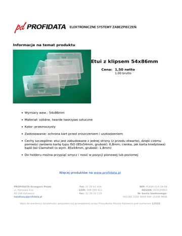 Informacje na temat produktu Etui z klipsem 54x86mm Cena: 1,50 netto 1,00 brutto Wymiary wew.: 54x86mm Materiał: solidne, twarde tworzywo sztuczne Kolor: przezroczysty Zastosowanie: ochrona kart przed zniszczeniem i uszkodzeniem Cechy szczególne: etui jest zabudowane z jednej strony (z przodu otwarte), dzięki czemu pomieści zarówno kartę typu ISO (85x54mm, grubość: 0,8mm; cienka, jak karta kredytowa) bądź też Clamshell (o wym. 85x54mm, grubość: 1,8mm) Do holderu można przypiąć smycz i nosić w pozycji pionowej lub poziomej Więcej produktów na www.profidata.pl PROFIDATA Grzegorz Pniak ul. Klonowa 41a 40-168 Katowice [email protected] Tel: 32 20 62 404 GSM: 509 099 412 fax: 32 20 33 119 NIP: PL634-014-18-08 REGON: 003534943 Nr konta bankowego: 561160 2202 0000 000 11439 9656 Wpis do ewidencji działalności gospodarczej prowadzonej przez Prezydenta Miasta Katowice pod numerem 12532. Powered by TCPDF (www.tcpdf.org)