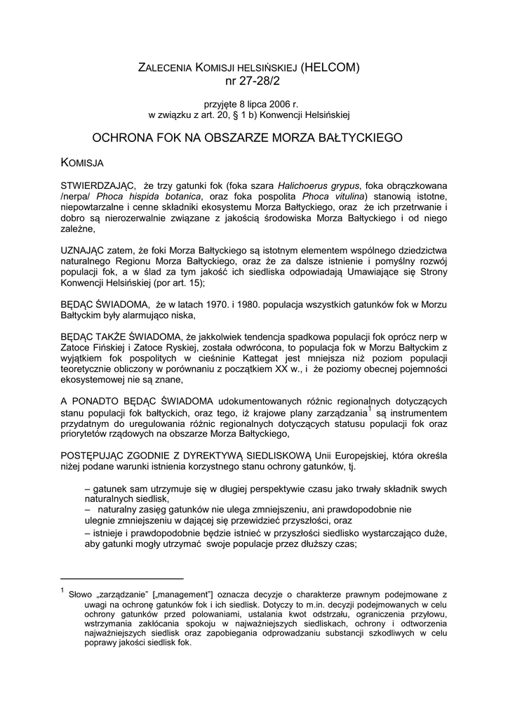 ZALECENIA KOMISJI HELSIŃSKIEJ (HELCOM) nr 27-28/2 przyjęte 8 lipca 2006 r. w związku z art. 20, § 1 b) Konwencji Helsińskiej OCHRONA FOK NA OBSZARZE MORZA BAŁTYCKIEGO KOMISJA STWIERDZAJĄC, że trzy gatunki fok (foka szara Halichoerus grypus, foka obrączkowana /nerpa/ Phoca hispida botanica, oraz foka pospolita Phoca vitulina) stanowią istotne, niepowtarzalne i cenne składniki ekosystemu Morza Bałtyckiego, oraz że ich przetrwanie i dobro są nierozerwalnie związane z jakością środowiska Morza Bałtyckiego i od niego zależne, UZNAJĄC zatem, że foki Morza Bałtyckiego są istotnym elementem wspólnego dziedzictwa naturalnego Regionu Morza Bałtyckiego, oraz że za dalsze istnienie i pomyślny rozwój populacji fok, a w ślad za tym jakość ich siedliska odpowiadają Umawiające się Strony Konwencji Helsińskiej (por art. 15); BĘDĄC ŚWIADOMA, że w latach 1970. i 1980. populacja wszystkich gatunków fok w Morzu Bałtyckim były alarmująco niska, BĘDĄC TAKŻE ŚWIADOMA, że jakkolwiek tendencja spadkowa populacji fok oprócz nerp w Zatoce Fińskiej i Zatoce Ryskiej, została odwrócona, to populacja fok w Morzu Bałtyckim z wyjątkiem fok pospolitych w cieśninie Kattegat jest mniejsza niż poziom populacji teoretycznie obliczony w porównaniu z początkiem XX w., i że poziomy obecnej pojemności ekosystemowej nie są znane, A PONADTO BĘDĄC ŚWIADOMA udokumentowanych różnic regionalnych dotyczących 1 stanu populacji fok bałtyckich, oraz tego, iż krajowe plany zarządzania są instrumentem przydatnym do uregulowania różnic regionalnych dotyczących statusu populacji fok oraz priorytetów rządowych na obszarze Morza Bałtyckiego, POSTĘPUJĄC ZGODNIE Z DYREKTYWĄ SIEDLISKOWĄ Unii Europejskiej, która określa niżej podane warunki istnienia korzystnego stanu ochrony gatunków, tj. – gatunek sam utrzymuje się w długiej perspektywie czasu jako trwały składnik swych naturalnych siedlisk, – naturalny zasięg gatunków nie ulega zmniejszeniu, ani prawdopodobnie nie ulegnie zmniejszeniu w dającej się przewidzieć przyszłości, oraz – istnieje i prawdopodobnie będzie istnieć w przyszłości siedlisko wystarczająco duże, aby gatunki mogły utrzymać swoje populacje przez dłuższy czas; 1 Słowo „zarządzanie” [„management”] oznacza decyzje o charakterze prawnym podejmowane z uwagi na ochronę gatunków fok i ich siedlisk. Dotyczy to m.in. decyzji podejmowanych w celu ochrony gatunków przed polowaniami, ustalania kwot odstrzału, ograniczenia przyłowu, wstrzymania zakłócania spokoju w najważniejszych siedliskach, ochrony i odtworzenia najważniejszych siedlisk oraz zapobiegania odprowadzaniu substancji szkodliwych w celu poprawy jakości siedlisk fok. UZNAJĄC, że podczas Warsztatów Ekspertów ds. Fok Komisji Helsińskiej, Międzynarodowej Rady Badania Morza oraz Unii Europejskiej, które odbyły się w Sztokholmie w dniach od 6 do 8 września 2005 r. zaproponowano zespół ogólnych zasad zarządzania zasobami fok całego obszaru Morza Bałtyckiego, oraz że zasady te pozwolą opracować krajowe plany zarządzania na podstawie czynników subregionalnych lub krajowych, ZAUWAŻAJĄC, że poniższa propozycja ogólnych zasad zarządzania, wg których populacja fok jest powiązana z ekosystemem Morza Bałtyckiego poprzez: – rozmiar populacji (długotrwałym celem jest umożliwienie odtworzenia populacji fok do poziomu pojemności ekosystemowej) –rozmieszczenie (długotrwałym celem jest umożliwienie rozrodu fok w celu rozszerzenia obszaru rozrodczego na wszystkie regiony Bałtyku) oraz –stan zdrowotny (długotrwałym celem jest osiągnięcie stanu zdrowotnego, który zapewni stałe bytowanie populacji), ZAUWAŻAJĄC PONADTO, że szczegółowe poziomy referencyjne stanowią integralną część tych zasad, a w odniesieniu do rozmiaru populacji, poziomy te określa się jako: – docelowy poziom referencyjny, tj. poziom, na którym wskaźnik wzrostu stabilizuje się i populacja asymptotycznie osiąga poziom aktualnej pojemności ekosystemowej (np. 0,8 K), – graniczny poziom referencyjny (poziom biologicznie bezpieczny), tj. minimalny poziom populacji zdolnej do przeżycia, który określa się w odniesieniu do poszczególnych jednostek zarządzania, – poziom podejścia ostrożnościowego, gdy rozrodczość populacji osiągnęła poziom 2 maksymalny ZAUWAŻAJĄC RÓWNIEŻ, że podczas Warsztatów Ekspertów ds. Fok Komisji Helsińskiej, Międzynarodowej Rady Badania Morza i Unii Europejskiej określono i uzgodniono następujące jednostki zarządzania w odniesieniu do populacji fok Morza Bałtyckiego: 1) 2) 3) 4) 5) foki pospolite w regionie Kalmarsund (Szwecja) foki pospolite zamieszkujące południowo-zachodni rejon Bałtyku (Dania, Niemcy, Polska, Szwecja) foki obrączkowane w Zatoce Botnickiej (Finlandia, Szwecja), foki obrączkowane w rejonie Archipelagu Południowo-Zachodniego, Zatoki Fińskiej i Zatoki Ryskiej (Finlandia, Estonia, Łotwa i Rosja), foki szare w Morzu Bałtyckim (wszystkie Umawiające się Strony Konwencji Helsińskiej), ZALECA SIĘ UMAWIAJĄCYM SIĘ STRONOM KONWENCJI HELSIŃSKIEJ: 1) stosowanie wyżej określonych ogólnych zasad zarządzania i jednostek zarządzania oraz zgodnie z tymi zasadami opracowanie i wdrożenie krajowych planów 3 zarządzania w celu osiągnięcia i utrzymania korzystnego statusu ochrony, w szczególności dla: – populacji mieszczących się poniżej granicznego poziomu referencyjnego (poziom biologicznie bezpieczny) dla których żadne celowe zabijanie nie powinno być zezwalane 2 pomiędzy 50% a 80% współczynnika K, prawdopodobnie w dolnej strefie tego zakresu. 3 krajowe plany zarządzania będą również odpowiednim instrumentem do uwzględniania wyjątków od ogólnych zasad zarządzania w określonych celach naukowych, dla dobra zwierząt oraz w celu eliminacji osobników specjalizujących w wyjadaniu złowionych lub hodowanych ryb. -2- – populacji mieszczących się 