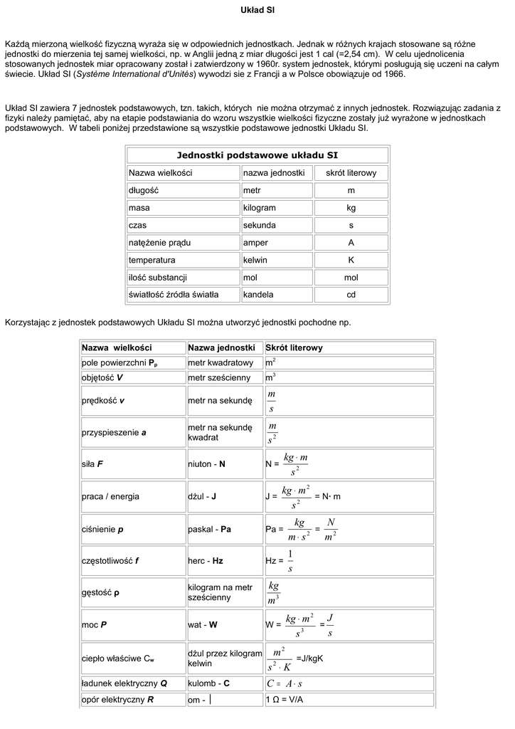 Układ SI Każdą mierzoną wielkość fizyczną wyraża się w odpowiednich jednostkach. Jednak w różnych krajach stosowane są różne jednostki do mierzenia tej samej wielkości, np. w Anglii jedną z miar długości jest 1 cal (=2,54 cm). W celu ujednolicenia stosowanych jednostek miar opracowany został i zatwierdzony w 1960r. system jednostek, którymi posługują się uczeni na całym świecie. Układ SI (Système International d'Unités) wywodzi sie z Francji a w Polsce obowiązuje od 1966. Układ SI zawiera 7 jednostek podstawowych, tzn. takich, których nie można otrzymać z innych jednostek. Rozwiązując zadania z fizyki należy pamiętać, aby na etapie podstawiania do wzoru wszystkie wielkości fizyczne zostały już wyrażone w jednostkach podstawowych. W tabeli poniżej przedstawione są wszystkie podstawowe jednostki Układu SI. Jednostki podstawowe układu SI Nazwa wielkości nazwa jednostki skrót literowy długość metr m masa kilogram kg czas sekunda s natężenie prądu amper A temperatura kelwin K ilość substancji mol mol światłość źródła światła kandela cd Korzystając z jednostek podstawowych Układu SI można utworzyć jednostki pochodne np. Nazwa wielkości Nazwa jednostki Skrót literowy pole powierzchni Pp metr kwadratowy m2 objętość V metr sześcienny m3 prędkość v metr na sekundę m s przyspieszenie a metr na sekundę kwadrat m s2 siła F niuton - N N= kg ⋅ m s2 praca / energia dżul - J J= kg ⋅ m 2 = N∙ m s2 ciśnienie p paskal - Pa Pa = kg N = 2 m⋅ s m2 częstotliwość f herc - Hz Hz = 1 s gęstość ρ kilogram na metr sześcienny kg m3 moc P wat - W W= ciepło właściwe Cw dżul przez kilogram kelwin m2 =J/kgK s2 ⋅ K ładunek elektryczny Q kulomb - C C = A⋅ s opór elektryczny R om - Ω 1 Ω = V/A kg ⋅ m 2 J = s s3