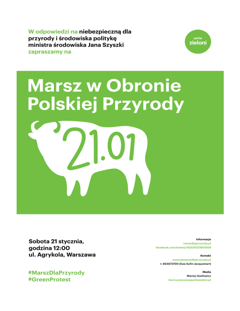 W odpowiedzi na niebezpieczną dla przyrody i środowiska politykę ministra środowiska Jana Szyszki zapraszamy na Sobota 21 stycznia, godzina 12:00 ul. Agrykola, Warszawa Informacje marszdlaprzyrody.pl facebook.com/events/152531221901509 Kontakt [email protected] t: 664673700 (Ewa Sufin-Jacquemart) #MarszDlaPrzyrody #GreenProtest Media Maciej Józefowicz [email protected] Dlaczego to robimy? Bo zagrożenia dla Polskiej przyrody i środowiska są bardzo poważne: 1 __ Przyroda jako towar, dla myśliwych i leśników zamiast wspólnego dobra dla tych i przyszłych pokoleń. Polityka wobec przyrody i środowiska ministra Szyszki to nie są jakieś uchybienia czy korekty. Jest to, godnie z hasłem „Polska w ruinie”, celowe i kompleksowe działanie, aby doprowadzić do "Przyrody w ruinie". Usprawiedliwieniem ma być ideowa koncepcja sprzeczna m.in. z apelem papieża Franciszka o ratowanie zagrożonego klimatu i ginącej, bliskiej Bogu przyrody, zawartym w encyklice „Laudato Si. Nasz wspólny dom”. Minister Szyszko, głosi, że przyroda to towar i zasób, który Bóg kazał człowiekowi eksploatować dla zaspokajania swoich egoistycznych potrzeb. Eksploatacja przyrody i środowiska ma służyć w szczególności władzy i bogaceniu się bliskich ministrowi i jego partii grup interesów: leśników, myśliwych, redemptorystów z ojcem Rydzykiem, oraz samego ministra i jego bliskich bez względu na skutki dla samej przyrody, środowiska, demokracji, zdrowia Polaków i losu przyszłych pokoleń. 2 __ Wyrok na Puszczę Białowieską, gdzie pod pozorem walki z kornikiem minister Szyszko szykuje masową wycinkę skarbu Polskiej natury. Pod pozorem walki z gradacją kornika drukarza, naruszając kompromis wypracowany przez zespół powołany przez prezydenta Lecha Kaczyńskiego, wbrew opinii Państwowej Rady Ochrony Przyrody, Komitetu Ochrony Przyrody PAN i naukowców przyrodników i ekologów z większości polskich uniwersytetów, mimo zastrzeżeń i ostrzeżeń UNESCO i Komisji Europejskiej, minister Szyszko zatwierdził masową wycinkę drzew w Puszczy Białowieskiej, znosząc ochronę ponad stuletnich drzewostanów. Tak masowa wycinka może być katastrofą dla skarbu polskiej natury, jakim jest Puszcza Białowieska. 3 __ Rzeczpospolita Myśliwska, czyli odstrzały żubrów i masakry dzików czy bobrów, oraz prawo dające myśliwym przywileje większe od innych obywateli i obywatelek. Minister Szyszko opracował zmiany w prawie łowieckim. Przyjęcie przez Sejm tego projektu doprowadzi do znaczącego pogorszenia standardów ochrony dzikich zwierząt, odda w ręce myśliwych absurdalnie szeroki zakres uprawnień, zlekceważy fundamentalne prawa milionów właścicieli i właścicielek nieruchomości oraz uniemożliwi Polkom i Polakom korzystanie z uroków ojczystej przyrody. Ustawa ta, dotycząca nas wszystkich, w większości nie-myśliwych, została napisana pod dyktando osób, które uprawiają krwawe hobby polegające na zabijaniu zwierząt. 4 __ Dewastacja Polskich drzew, na którą pozwala przegłosowana błyskawicznie i bez kontroli społecznej nowelizacja uchwały o ochronie przyrody. 1 stycznia weszła w życie nowelizacja ustawy o ochronie przyrody, przegłosowana 16 grudnia w Sali Kolumnowej. Przyjęte zmiany niosą ogromne zagrożenie dla polskich drzew w gminach i miastach. Osoba prywatna może odtąd wyciąć na swoim terenie bez żadnych formalności nawet dwustuletni dąb, jeżeli nie jest pomnikiem przyrody. Radykalna liberalizacja przepisów skazuje drzewa na niekontrolowaną wycinkę, a mieszkańców i mieszkanki Polski na życie na betonowej pustyni, ogromne zanieczyszczenie powietrza, czy zwiększone narażenie na susze i powodzie. 5 __ Antyekologiczna dyktatura PiS, które podporządkowało swojemu rządowi niezależne dotąd instytucje chroniące środowisko oraz chce odebrać obywatelom i obywatelkom prawo do współdecydowania o środowisku. Minister Szyszko prowadzi politykę konsekwentnego przejmowania lub likwidacji demokratycznych instytucji i procedur kontrolnych, mających chronić przyrodę i zapewnić obywatelom i obywatelkom prawo do czystego i zdrowego środowiska. Ta dewastacyjna polityka zawiera się w czterech punktach: 1 ________ Podporządkowanie ministrowi środowiska niezależnych dotąd organów doradczych ds. ochrony przyrody. 2 ________ Brak przejrzystości i konsultacji przy wprowadzaniu radykalnych zmian w systemie ochrony przyrody i środowiska.. 3 ________ Podporządkowanie ministrowi środowiska systemu decyzji środowiskowych i finansowania działań na rzecz przyrody i środowiska 4 ________ Odbieranie możliwości działania na rzecz ochrony przyrody i środowiska organizacjom ekologicznym oraz obywatelom i obywatelkom. 6 __ Klimat dla smogu, czyli likwidacja programów antysmogowych oraz oparta na węglu polityka klimatyczna, która zrobi z Polski energetyczny skansen Europy. Minister Szyszko jest zagorzałym klimatosceptykiem, głoszącym publicznie, iż wiedza popierana przez 95% klimatologów na świecie i będąca podstawą podpisania porozumienia klimatycznego w Paryżu przez 195 krajów świata, to propaganda służąca interesom krajów produkujących technologię odnawialnych źródeł energii. Pod jego kierownictwem Polska prowadzi katastrofalną dla planety, Polek i Polaków politykę klimatyczną i energetyczną, będącą źródłem wielkich strat finansowych oraz licznych chorób i zgonów. Państwo polskie może prowadzić dobrą politykę klimatyczną, która zarówno zapewniłaby autonomię energetyczną i zmniejszyła emisję dwutlenku węgla, jak i zwalczałaby katastrofalne zanieczyszczenie powietrza. W Polsce z powodu smogu przedwcześnie umiera 51 tys. ludzi rocznie. Ale tu również minister Szyszko ma destrukcyjną rolę. W podlegającym mu Narodowym Funduszu Ochrony Środowiska i Gospodarki Wodnej rozmontował programy na rzecz ochrony powietrza KAWKA i RYŚ, a także zlikwidował zespół kompetentnych ludzi