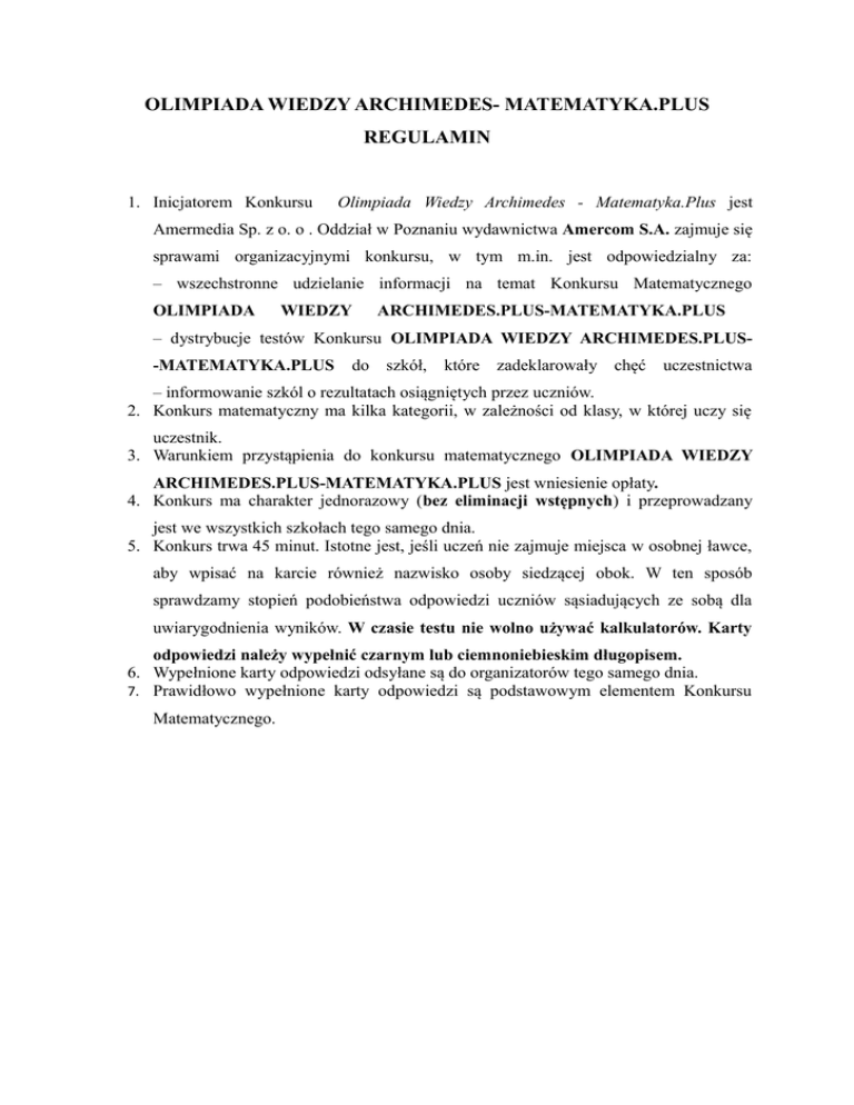 OLIMPIADA WIEDZY ARCHIMEDES- MATEMATYKA.PLUS REGULAMIN 1. Inicjatorem Konkursu Olimpiada Wiedzy Archimedes - Matematyka.Plus jest Amermedia Sp. z o. o . Oddział w Poznaniu wydawnictwa Amercom S.A. zajmuje się sprawami organizacyjnymi konkursu, w tym m.in. jest odpowiedzialny za: – wszechstronne udzielanie informacji na temat Konkursu Matematycznego OLIMPIADA WIEDZY ARCHIMEDES.PLUS-MATEMATYKA.PLUS – dystrybucje testów Konkursu OLIMPIADA WIEDZY ARCHIMEDES.PLUS-MATEMATYKA.PLUS do szkół, które zadeklarowały chęć uczestnictwa – informowanie szkól o rezultatach osiągniętych przez uczniów. 2. Konkurs matematyczny ma kilka kategorii, w zależności od klasy, w której uczy się uczestnik. 3. Warunkiem przystąpienia do konkursu matematycznego OLIMPIADA WIEDZY ARCHIMEDES.PLUS-MATEMATYKA.PLUS jest wniesienie opłaty. 4. Konkurs ma charakter jednorazowy (bez eliminacji wstępnych) i przeprowadzany jest we wszystkich szkołach tego samego dnia. 5. Konkurs trwa 45 minut. Istotne jest, jeśli uczeń nie zajmuje miejsca w osobnej ławce, aby wpisać na karcie również nazwisko osoby siedzącej obok. W ten sposób sprawdzamy stopień podobieństwa odpowiedzi uczniów sąsiadujących ze sobą dla uwiarygodnienia wyników. W czasie testu nie wolno używać kalkulatorów. Karty odpowiedzi należy wypełnić czarnym lub ciemnoniebieskim długopisem. 6. Wypełnione karty odpowiedzi odsyłane są do organizatorów tego samego dnia. 7. Prawidłowo wypełnione karty odpowiedzi są podstawowym elementem Konkursu Matematycznego.