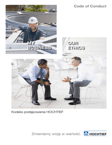 Code of Conduct My Business our ethics Kodeks postępowania HOCHTIEF Zmieniamy wizję w wartość. Spis treści Wstęp.............................................................................................................................3 Zasady............................................................................................................................. 5 Konflikt interesów i łapówkarstwo...................................................................................7 Korupcja.........................................................................................................................8 Przestrzeganie zasad antymonopolowych.....................................................................9 Darowizny i sponsoring................................................................................................ 10 Regulacje w zakresie informacji niepublicznych (zasady insider)................................... 11 Postępowanie z informacjami wewnętrznymi ............................................................... 11 Poufność...................................................................................................................... 12 Ochrona danych........................................................................................................... 12 Dokumentacja transakcji biznesowych......................................................................... 13 Obchodzenie się z własnością i majątkiem firmy.......................................................... 13 Poszanowanie godności człowieka.............................................................................. 14 Odrzucanie pracy dzieci............................................................................................... 14 Odrzucanie pracy przymusowej................................................................................... 15 Równość szans i zakaz dyskryminacji.......................................................................... 15 Bezpieczeństwo i higiena pracy.................................................................................... 16 Ochrona środowiska.................................................................................................... 16 Prawo do zrzeszania się i do negocjacji zbiorowych..................................................... 17 Odpowiedzialność........................................................................................................ 18 Zasadniczo we wszystkich tek stach używamy zwrotu „Panie i Panowie”. 2 Wytyczne i pozostałe przepisy wewnętrzne.................................................................. 19 Drodzy Pracownicy, Reputacja HOCHTIEF stanowi dla nas najwyższą wartość, którą należy chronić i o którą trzeba dbać. Łączenie działalności biznesowej z zasadami etycznymi jest naszą tradycją i stanowi podstawę naszego sukcesu. Dzięki postępowaniu zgodnie z tymi zasadami wszyscy dbamy o to, aby HOCHTIEF odnosił sukcesy biznesowe, ciesząc się przy tym bardzo dobrą opinią. HOCHTIEF jako globalny koncern budowlany podlega ustawowym regulacjom, które różnią się w zależności od kraju. Poza tym zobowiązani jesteśmy do przestrzegania umów międzynarodowych, np. dotyczących ochrony praw człowieka, zrównoważonego rozwoju oraz zwalczania korupcji. Na tej podstawie opracowaliśmy zasady postępowania, które zebraliśmy w przejrzysty sposób w formie Code of Conduct HOCHTIEF. Każdy z nas, menadżer i pracownik, odpowiada za to, by jego zachowanie było zgodne z zasadami określonymi w Code of Conduct HOCHTIEF. Kodeks HOCHTIEF jest wy znacznikiem i przewodnikiem określającym zasady naszego postępowania w codziennej działalności biznesowej. Nasza nadrzędna zasada mówi, że nie ma takiej transakcji w biz nesie, której zawarcie usprawiedliwiałoby naruszenie zaufania do HOCHTIEF lub zaszko dzenie naszej dobrej opinii. Od pracowników wszystkich spółek HOCHTIEF oczekujemy przestrzegania prawa oraz działania w zgodzie z naszymi zasadami etycznymi. 3 Pomocą i radą w tym zakresie służy również Dział ds. Compliance w HOCHTIEF. Proszę wykorzystać tę pomoc. Naruszanie reguł ujętych w Code of Conduct HOCHTIEF nie może być i nie będzie tolerowane. „Jesteśmy przekonani, że wartości etyczne i ekonomiczne są od siebie zależne, a świat biznesu ma obowiązek dążenia do uczciwości we wzajemnych kontaktach oraz działania w ramach ustanowionych norm.” Tak brzmi fragment naszego Code of Conduct, który wcielamy w życie. Wierzymy, że każdy pracownik zasługuje na zaufanie z naszej strony. Oczekujemy, że każdy z Państwa sprosta stawianym wymaganiom dotyczącym postępo wania uczciwego, etycznego i zgodnego z prawem. Marcelino Fernández Verdes Prezes Zarządu HOCHTIEF Aktiengesellschaft 4 Zasady Etyka biznesowa i integralność gwarantują naszą wiarygodność. Oczywiste jest, że wszyscy pracownicy w różnych spółkach koncernu przestrzegają przepisy prawne i re gulacje obowiązujące w krajach, w których pracują i że rzetelnie wypełniają swoje obo wiązki. We wszystkich aspektach swojej działalności biznesowej muszą wykazywać uczciwość i sprawiedliwość. Oczekujemy tych samych standardów postępowania od naszych Partnerów. W przypadku różnic między przyjętymi zwyczajami, przepisami prawa lub innymi regulacjami w danym kraju, w którym HOCHTIEF prowadzi działal ność, a zasadami kodeksu, należy każdorazowo stosować bardziej surowe przepisy. Jesteśmy przekonani, że wartości etyczne i ekonomiczne są od siebie zależne, a świat biznesu ma obowiązek dążenia do uczciwości we wzajemnych kontaktach oraz dzia łania w ramach ustanowionych norm. Nasze zasady: • Lokalne i międzynarodowe przepisy prawne oraz regulacje są ściśle przestrzegane. • Naszych partnerów biznesowych, dostawców, klientów, pracowników i kolegów za wsze traktujemy uczciwie. • Dział ds. Compl