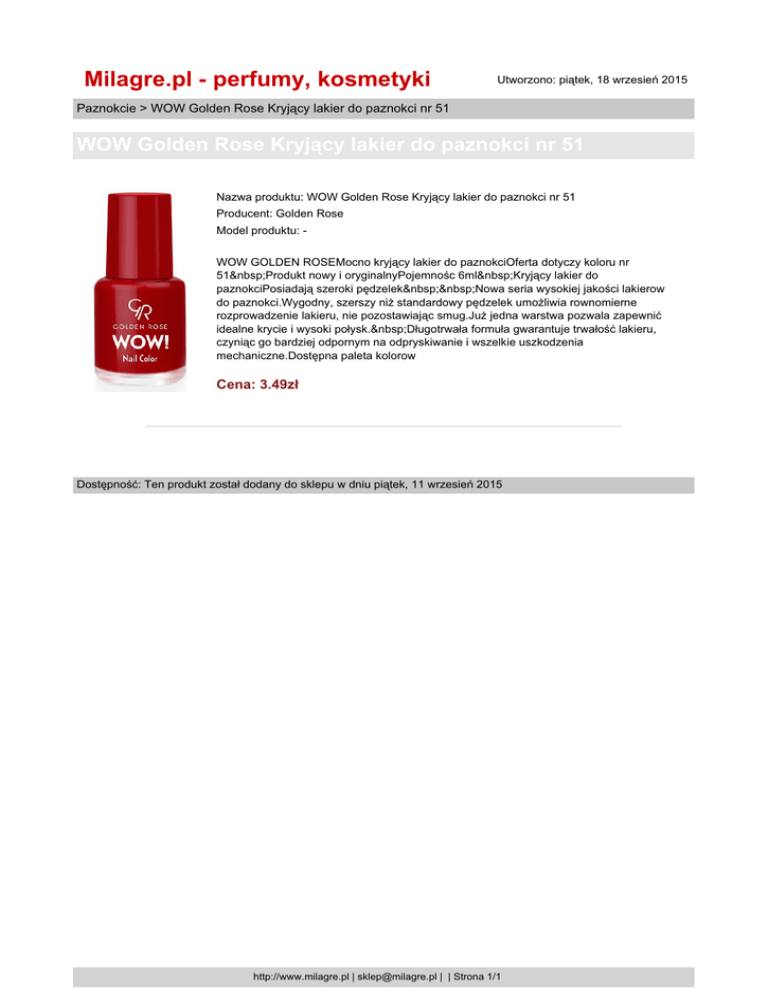Milagre.pl - perfumy, kosmetyki Utworzono: piątek, 18 wrzesień 2015 Paznokcie > WOW Golden Rose Kryjący lakier do paznokci nr 51 WOW Golden Rose Kryjący lakier do paznokci nr 51 Nazwa produktu: WOW Golden Rose Kryjący lakier do paznokci nr 51 Producent: Golden Rose Model produktu: WOW GOLDEN ROSEMocno kryjący lakier do paznokciOferta dotyczy koloru nr 51 Produkt nowy i oryginalnyPojemnośc 6ml Kryjący lakier do paznokciPosiadają szeroki pędzelek Nowa seria wysokiej jakości lakierow do paznokci.Wygodny, szerszy niż standardowy pędzelek umożliwia rownomierne rozprowadzenie lakieru, nie pozostawiając smug.Już jedna warstwa pozwala zapewnić idealne krycie i wysoki połysk. Długotrwała formuła gwarantuje trwałość lakieru, czyniąc go bardziej odpornym na odpryskiwanie i wszelkie uszkodzenia mechaniczne.Dostępna paleta kolorow Cena: 3.49zł Dostępność: Ten produkt został dodany do sklepu w dniu piątek, 11 wrzesień 2015 http://www.milagre.pl | [email protected] | | Strona 1/1