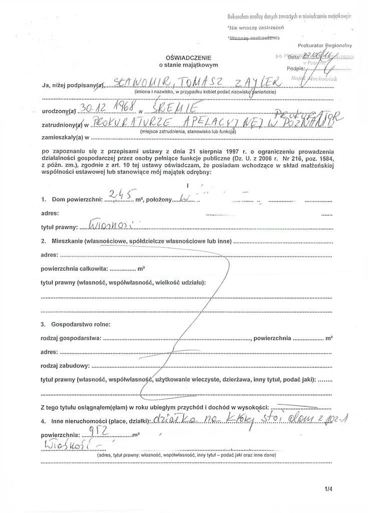 Dokonałem analizy danych zawartych w oświadczeniu majątkowym *Nie w noszę zastrzeżeń *,Wnoszę P ro k u ra to r R egionalny OŚWIADCZENIE o stanie majątkowym p0 w Poziyfnii P o d p is :r-..../...../..v Rci/c/ł Maćkowiak Ja, niżej podpisanWaf,.... I.' j M l S. Z ...a (imiona i nazwisko, w przypadku kobiet podać nazwisko^panieńskie) urodzony(a)f żqM:J%I w . z a tru d n io n y ^ *,I i s Ł U . L i l k ! . Ł Ł £ . .... ,/f P £ l / f C tiilklK.. 7 F 7 $ / E 'j U jf ó W ^ A ł, (miejsce zatrudnienia, stanowisko lub funkcja) zamieszkały(a) w ...................... po zapoznaniu się z przepisami ustawy z dnia 21 sierpnia 1997 r. o ograniczeniu prowadzenia działalności gospodarczej przez osoby pełniące funkcje publiczne (Dz. U. z 2006 r. Nr 216, poz. 1584, z późn. zm.), zgodnie z art. 10 tej ustawy oświadczam, że posiadam wchodzące w skład małżeńskiej wspólności ustawowej lub stanowiące mój majątek odrębny: JJy i] 5 / ' Dom powierzchni:.... m2, położony....................fcv.'. adres: tytuł prawny:..... lA ń Q a h .Q l.L...'. 2. Mieszkanie (własnościowe, spółdzielcze własnościowe lub inne) Z tego tytułu osiągnąłem(ęłam) w roku ubiegłym przychód i dochód w wysokości: 4. Inne nieruchomościi (place, działki):. powierzchnia: ....i 1 / L j ( a j Hqt ) ( (adres, tytut prawny: własność, współwłasność, inny tytuł - podać jaki oraz inne dane) 1/4 Nabyłem(am) (nabył mój małżonek) mienie Skarbu Państwa, innej państwowej osoby prawnej, jednostek samorządu terytorialnego, ich związków lub od komunalnej osoby prawnej, które podlegało zbyciu w drodze przetargu: ^ ^ = 5. tak*^ ( nie* ) Podać rodzaj mienia, datę nabycia, od kogo Ul 1. a* Nie jestem członkiem zarządu ani rady nadzorczej, komisji rewizyjnej spółki prawa handlowego, ani też członkiem zarządu fundacji prowadzącej działalność gospodarczą. Fti— ru* 7c Ji- sn /- ni m | f ri pC :m —T «o- wr ir ^o .H i — Oi s* e l i r t r r> 7 o i - - Ii r» — n ri ir- ii i! cW ij ii r1 ov t »M¥ 1i rŁr ,wj jt n oi o r v ń }| /i u o o Łoi ii m u u U jiu u jf iu u £ .w i w Liw j członkiem zarządu fundacji prowadzącej działalność gospodarczą. _______ — H wk * iivi r t f s ł.y o ^ r tw ifu handlowego, -------- (wymienić pełnione funkcje i stanowiska wraz z nazwami spółek i fundacji) Z tego tytułu osiągnąłem(ęłam) w roku ubiegłym dochód w wysokości:.......................................................... 2. a* Nie jestem zatrudniony(a) ani też nie wykonuję innych zajęć w spółkach prawa handlowego, które mogłyby wywołać podejrzenie o moją stronniczość lub interesowność. b*W spółkachprawahandlowegowykonujęniżejwymienionezajęcia: • -•> Z tego tytułu osiągnąłem(ęłam) w roku ubiegłym dochód w wysokości: 2/4 Z tego tytułu osiągnąłem(ęłam) w roku ubiegłym dochód w wysokości:................................. 4. W następujących spółkach prawa handlowego posiadam niżej podane udziały lub akcje: (nazwa spółki - adresy, wielkość udziałów, ilość akcji) Z tego tytułu osiągnąłem(ęłam) w roku ubiegłym dochód w wysokości Równocześnie oświadczam, że w spółce................................................... moje udziały (lub akcje) przekraczają 10%. W pozostałych spółkach prawa handlowego posiadane udziały lub akcje nie stanowią 10% kapitału. IV 1. Nie prowadzę działalności gospodarczej na własny rachunek ani wspólnie z innymi osobami, nie zarządzam również taką działalnością ani nie jestem przedstawicielem czy też pełnomocnikiem w prowadzeniu takiej działalności.2’ 3/4 V Składniki mienia ruchomego o wartości powyżej 10 000 złotych (w przypadku pojazdów mechanicznych należy podać markę, model i rok produkcji); K .............. CL4SJ..!k...2..a4.:i.r..i. .wL . ........ ..iŁ0Oo/Z— ______ __ _ .......... ....jf a M ś t y is ....... VI Zobowiązania pieniężne o wartości powyżej 10 000 złotych, w tym zaciągnięte kredyty i pożyczki oraz warunki, na jakich zostały udzielone (wobec kogo, w związku z jakim zdarzeniem, w jakiej wysokości): c:..d$dt/u..iJor 'loun Au&iL.&............ Od............ z..... ............ I .."TofOli.. Z tego tytułu osiągnąłem(ęłam) w roku ubiegłym dochód w wysokości:......................................................... Powyższe oświadczenie składam świadomy(a), iż na podstawie art. 14 ust, 1 ustawy z dnia 21 sierpnia 1997 r. o ograniczeniu prowadzenia działalności gospodarczej przez osoby pełniące funkcje publiczne (Dz. U. z 2006 r. Nr 216, poz. 1584, z późn. zm.) za podanie nieprawdy prawdy grozi kara pozbawienia wolności. ...................................................................................................... (miejscowość, data) 1) Nie dotyczy rad nadzorczych spółdzielni mieszkaniowych. 2> Nie dotyczy działalności wytwórczej w rolnictwie. J (podpis) / Niewłaściwe skreślić i uzupełnić, wpisując w poszczególnych punktach odpowiednie dane. 4/4