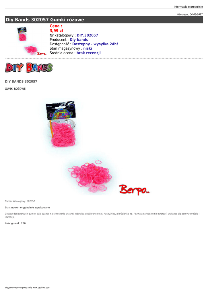 Informacje o produkcie Utworzono 04-03-2017 Diy Bands 302057 Gumki różowe Cena : 3,99 zł Nr katalogowy : DIY.302057 Producent : Diy bands Dostępność : Dostępny - wysyłka 24h! Stan magazynowy : niski Średnia ocena : brak recenzji DIY BANDS 302057 GUMKI RÓŻOWE Numer katalogowy: 302057 Stan: nowe - oryginalnie zapakowane Zestaw dodatkowych gumek daje szanse na stworzenie własnej indywidualnej bransoletki, naszyjnika, pierścionka itp. Pozwala samodzielnie tworzyć, wykazać się pomysłowością i inwencją. Ilość gumek: 250 Wygenerowano w programie www.oscGold.com Dostępność w salonach: Ilość sztuk: Sklep - Złotniki: 0 Sklep - zlikwidowany: 0 Sklep - Szczepankowo: 2