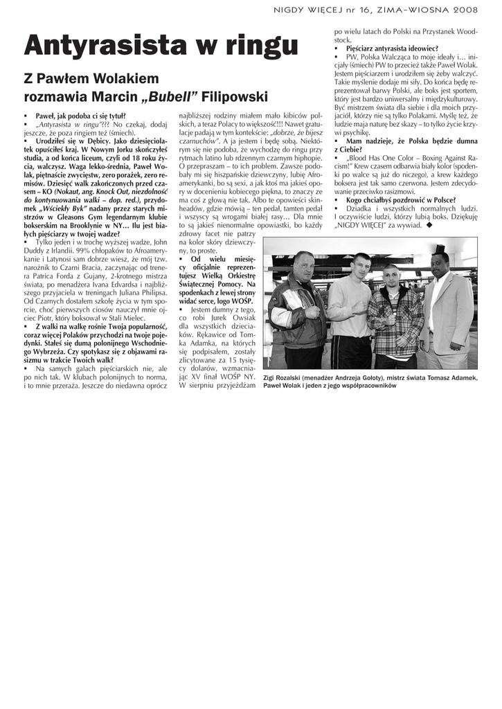 NIGDY WIĘCEJ nr 16, ZIMA-WIOSNA 2008 Antyrasista w ringu Z Pawłem Wolakiem rozmawia Marcin „Bubell” Filipowski § Paweł, jak podoba ci się tytuł? § „Antyrasista w ringu”??? No czekaj, dodaj jeszcze, że poza ringiem też (śmiech). § Urodziłeś się w Dębicy. Jako dziesięciolatek opuściłeś kraj. W Nowym Jorku skończyłeś studia, a od końca liceum, czyli od 18 roku życia, walczysz. Waga lekko-średnia, Paweł Wolak, piętnaście zwycięstw, zero porażek, zero remisów. Dziesięć walk zakończonych przed czasem – KO (Nokaut, ang. Knock Out, niezdolność do kontynuowania walki – dop. red.), przydomek „Wściekły Byk” nadany przez starych mistrzów w Gleasons Gym legendarnym klubie bokserskim na Brooklynie w NY… Ilu jest białych pięściarzy w twojej wadze? § Tylko jeden i w trochę wyższej wadze, John Duddy z Irlandii. 99% chłopaków to Afroamerykanie i Latynosi sam dobrze wiesz, że mój tzw. narożnik to Czarni Bracia, zaczynając od trenera Patrica Forda z Gujany, 2-krotnego mistrza świata, po menadżera Ivana Edvardsa i najbliższego przyjaciela w treningach Juliana Philipsa. Od Czarnych dostałem szkołę życia w tym sporcie, choć pierwszych ciosów nauczył mnie ojciec Piotr, który boksował w Stali Mielec. § Z walki na walkę rośnie Twoja popularność, coraz więcej Polaków przychodzi na twoje pojedynki. Stałeś się dumą polonijnego Wschodniego Wybrzeża. Czy spotykasz się z objawami rasizmu w trakcie Twoich walk? § Na samych galach pięściarskich nie, ale po nich tak. W klubach polonijnych to norma, i to mnie przeraża. Jeszcze do niedawna oprócz po wielu latach do Polski na Przystanek Woodstock. § Pięściarz antyrasista ideowiec? § PW, Polska Walcząca to moje ideały i… inicjały (śmiech) PW to przecież także Paweł Wolak. Jestem pięściarzem i urodziłem się żeby walczyć. Takie myślenie dodaje mi siły. Do końca będę reprezentował barwy Polski, ale boks jest sportem, który jest bardzo uniwersalny i międzykulturowy. Być mistrzem świata dla siebie i dla moich przyjaciół, którzy nie są tylko Polakami. Myślę też, że ludzie maja naturę bez skazy – to tylko życie krzywi psychikę. § Mam nadzieje, że Polska będzie dumna z Ciebie? § „Blood Has One Color – Boxing Against Racism!” Krew czasem odbarwia biały kolor (spodenki po walce są już do niczego), a krew każdego boksera jest tak samo czerwona. Jestem zdecydowanie przeciwko rasizmowi. § Kogo chciałbyś pozdrowić w Polsce? § Dziadka i wszystkich normalnych ludzi. I oczywiście ludzi, którzy lubią boks. Dziękuję „NIGDY WIĘCEJ” za wywiad. u najbliższej rodziny miałem mało kibiców polskich, a teraz Polacy to większość!!! Nawet gratulacje padają w tym kontekście: „dobrze, że bijesz czarnuchów”. A ja jestem i będę sobą. Niektórym się nie podoba, że wychodzę do ringu przy rytmach latino lub rdzennym czarnym hiphopie. O przepraszam – to ich problem. Zawsze podobały mi się hiszpańskie dziewczyny, lubię Afroamerykanki, bo są sexi, a jak ktoś ma jakieś opory w docenieniu kobiecego piękna, to znaczy ze ma coś z głową nie tak. Albo te opowieści skinheadów, gdzie mówią – ten pedał, tamten pedał i wszyscy są wrogami białej rasy… Dla mnie to są jakieś nienormalne opowiastki, bo każdy zdrowy facet nie patrzy na kolor skóry dziewczyny, to proste. § Od wielu miesięcy oficjalnie reprezentujesz Wielką Orkiestrę Świątecznej Pomocy. Na spodenkach z lewej strony widać serce, logo WOŚP. § Jestem dumny z tego, co robi Jurek Owsiak dla wszystkich dzieciaków. Rękawice od Tomka Adamka, na których się podpisałem, zostały zlicytowane za 15 tysięcy dolarów, wzmacniając XV finał WOŚP NY. Zigi Rozalski (menadżer Andrzeja Gołoty), mistrz świata Tomasz Adamek, W sierpniu przyjeżdżam Paweł Wolak i jeden z jego współpracowników
