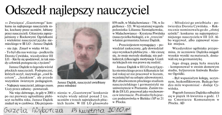 Odszedł najlepszy nauczyciel »» Zwycięzca' „Gazetowego" kon kursu na najlepszego nauczyciela ro ku, kochany przez uczniów, lubiany przez nauczycieli. Gitarzysta zaprzy jaźniony z Rockowymi Ogródkami i wieloletni nauczyciel języka nie mieckiego w III LO - Janusz Dądzik - nie żyje. Zmarł w wieku 44 lat. - To był dla nas wstrząs - podkreśla Dorota Cywińska, wicedyrektor III LO. - Kto by się spodziewał, że tak mio dy człowiek pożegna się z życiem? Janusz Dądzik to legenda wśród płockich nauczycieli. Podopieczni, których uczył, nazywali go „cool fa cetem", „luzakiem", ale przede wszystkim świetnym pedagogiem. Janusz Dądzik, nauczyciel uwielbiany - Najlepszy nauczyciel, jakiego znam. przez młodzież Uczy przez zabawę - powtarzali. Nic więc dziwnego, że gdy w 2001 r. nienia: w „Gazetowym" konkursie po raz pierwszy ogłosiliśmy plebi wzięło wtedy udział ponad 2 tys. scyt na belfra roku, Janusz Dądzik uczniów z trzech największych płoc znalazł się w czołówce. Dla przypom- kich liceów. W III LO głosowało 859 osób, w Malachowiance - 756, w Ja giellonce - 521. W tej ostatniej wygrała polonistka Lilianna Siemiątkowska, w Malachowiance - Krystyna Piwińska (nauczycielka biologii), a w „trzecim" właśnie germanista Janusz Dądzik. - Przecieżjestem wymagający - po wiedział zaskoczony, gdy dowiedział sięo wynikach plebiscytu. - Ale cieszę się, że moje metody skutkują: nie pałkaikrzyk,tylkociągła mortywacja Uczeń na lekcjach nie ma prawa się nudzić. Janusz Dądzik w III LO uczył języ ka niemieckiego przez kilkanaście lat (od rokuj uż nie pracował w liceum, wcześniej był na urlopie zdrowotnym). Był absolwentem płockiego studium nauczycielskiego i germanistyki na uniwersytecie w Poznaniu. Zanim tra fił do DI LO, pracował jako wychowaw ca w internacie. Po drodze była jesz cze podstawówka w Bielsku i SP nr 21 w Płocku. - Młodzież go uwielbiała - po twierdza Dorota Cywińska. - Rok rocznie nominowała go do „złotej szóstki": konkursu na najsympatycz niejszego nauczyciela w III LO. Al bo wygrywał, albo zajmował wyso kie miejsca. Wicedyrektor ogólniaka przypo mina, że uczniowie Dądzika osiągali wysokie wyniki na maturach, dosta wali się na germanistykę. Jego drugą pasją była muzyka - komponował w swoim domowym studiu, byljurorem festiwalu Rocko we Ogródki. - Był wspaniałym kolegą, uczyn nym, bezkonfliktowym. Będę go bar dzo mile wspominać - dodaje Cy wińska. Pogrzeb Janusza Dądzika odbędzie się w piątek 16 kwietnia o godz. 13 na Cmentarzu Komunalnym w Płocku. AD